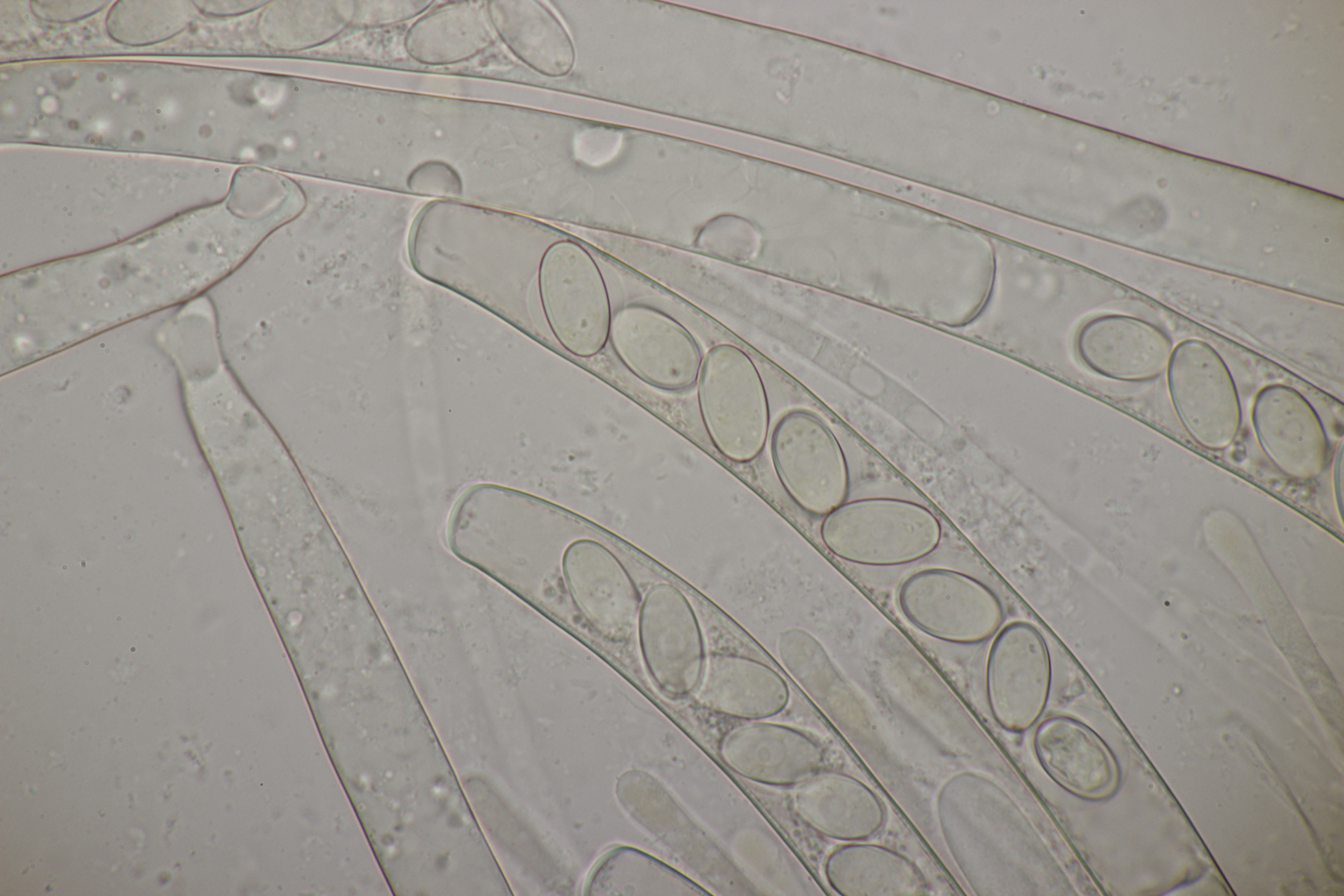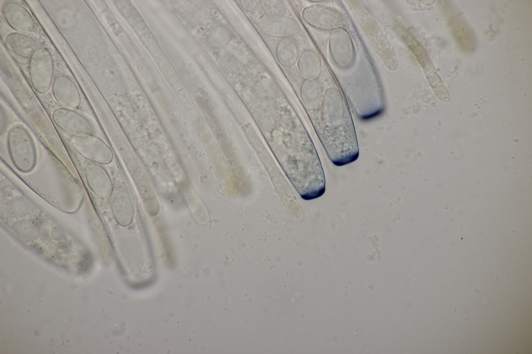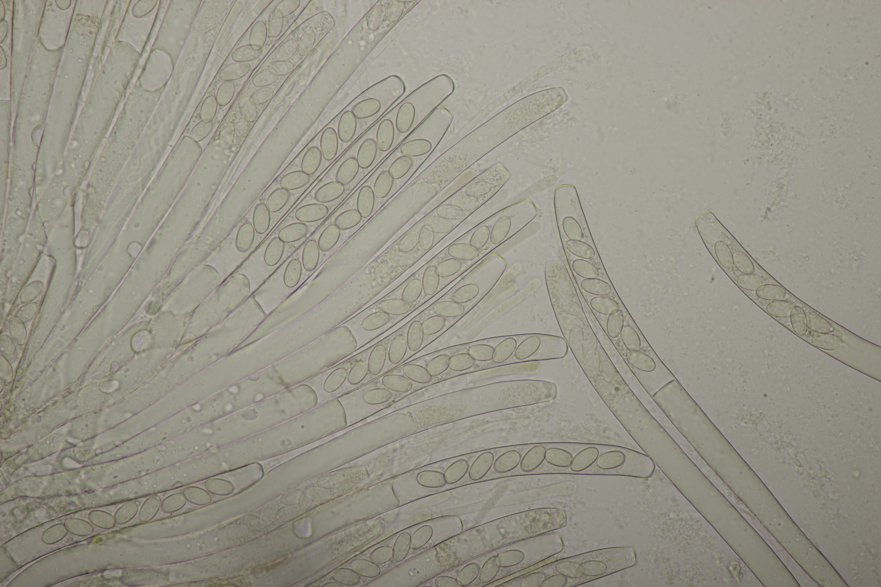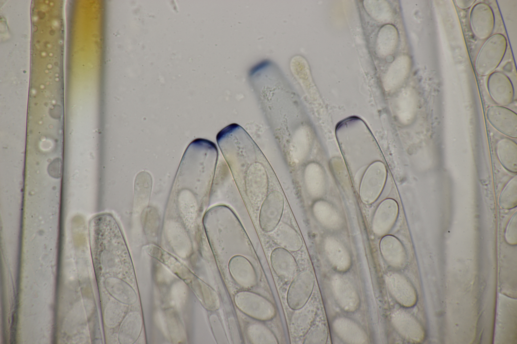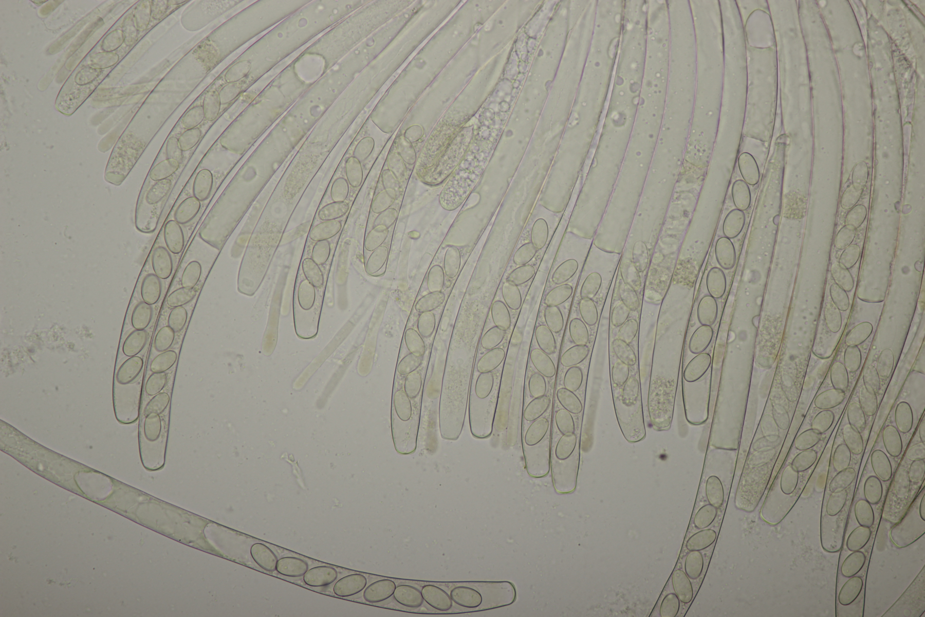 10. An Stroh (mit Pferdemist darunter?) dann eine Peziza. Die Sporen sehen ganz glatt aus, aber leider waren keine Sporen im Abwurf zu bekommen. Die Sporen in den Asci messen (17.5-20) µm x (9-11) µm, Q=1.7-2.0. Von der Sporengröße her würde das mit dem Schlüssel im Doveri am ehesten zu Peziza azorica (P. buxea in PD) passen. Oder wachsen die Sporen noch weiter und es wird am Ende eine Peziza vesiculosa? Was meint ihr?