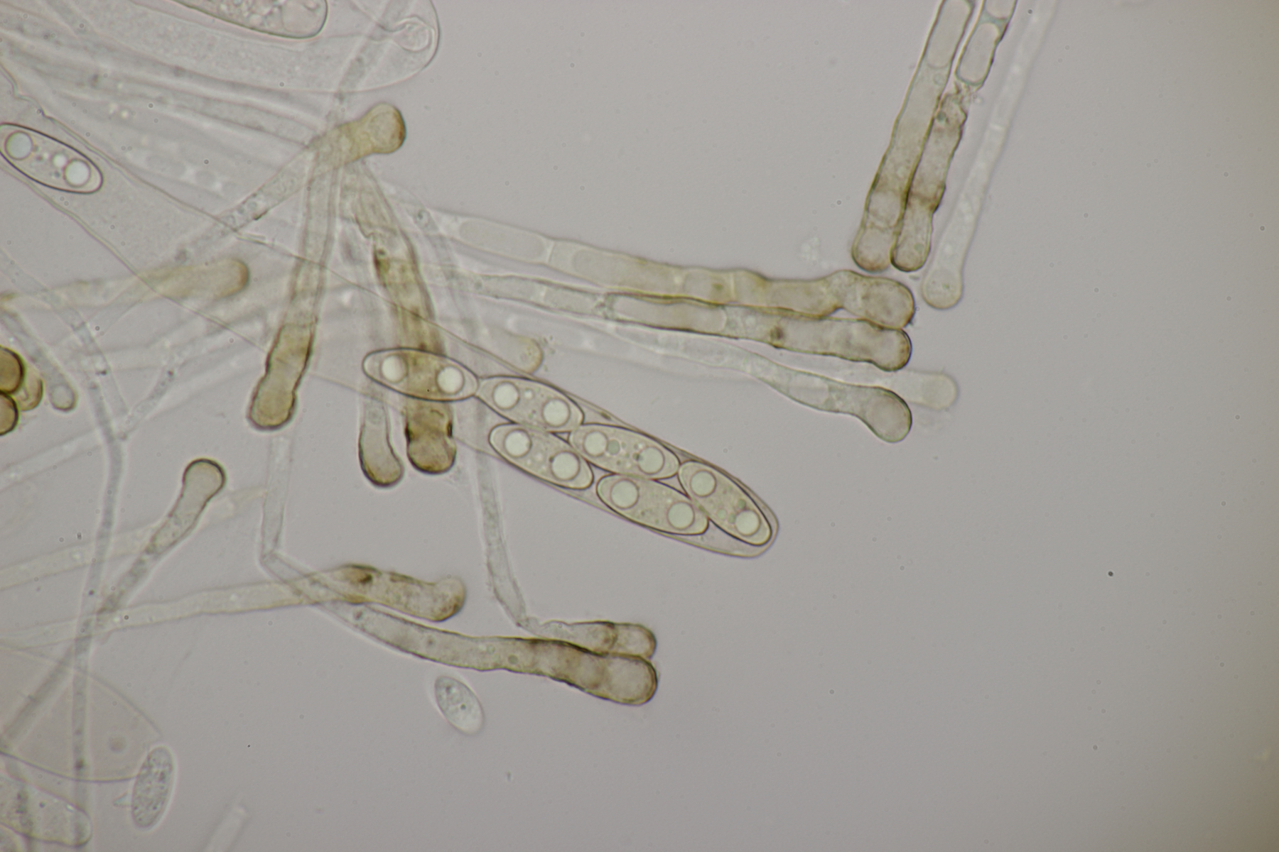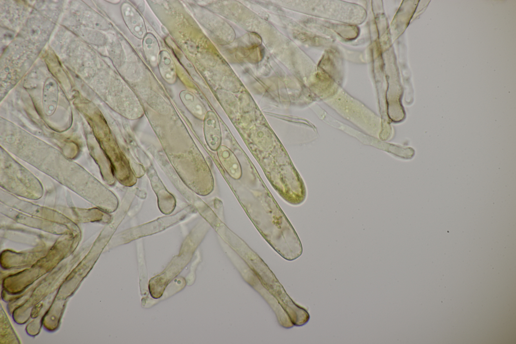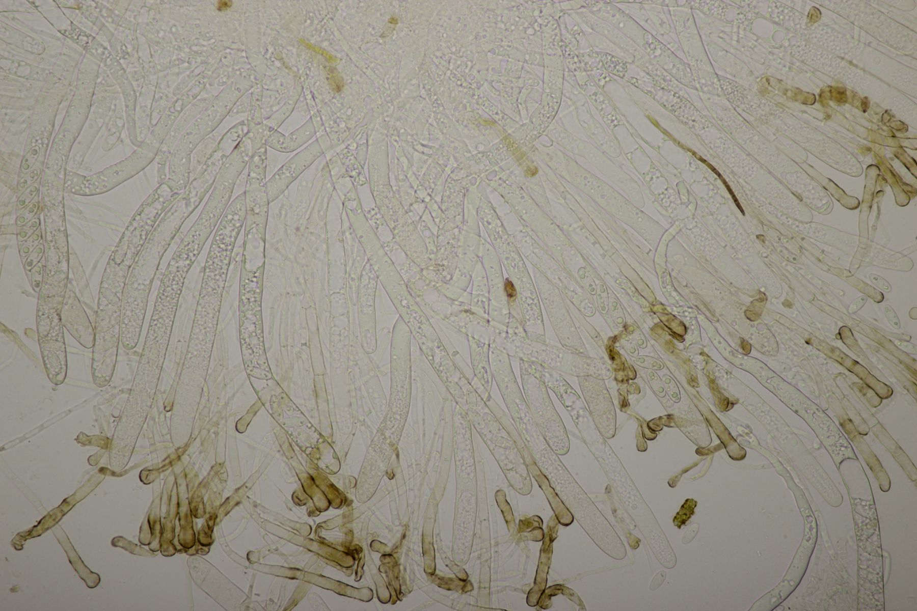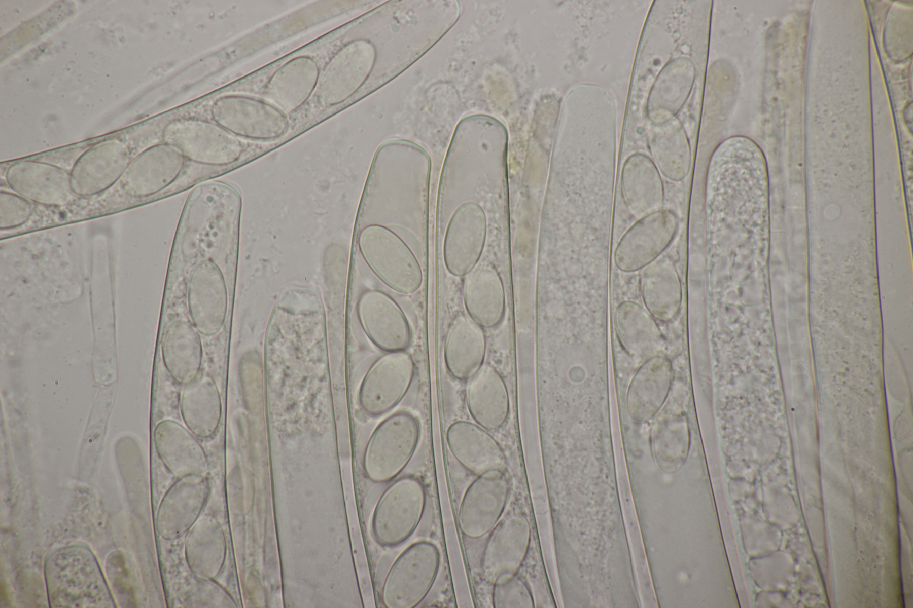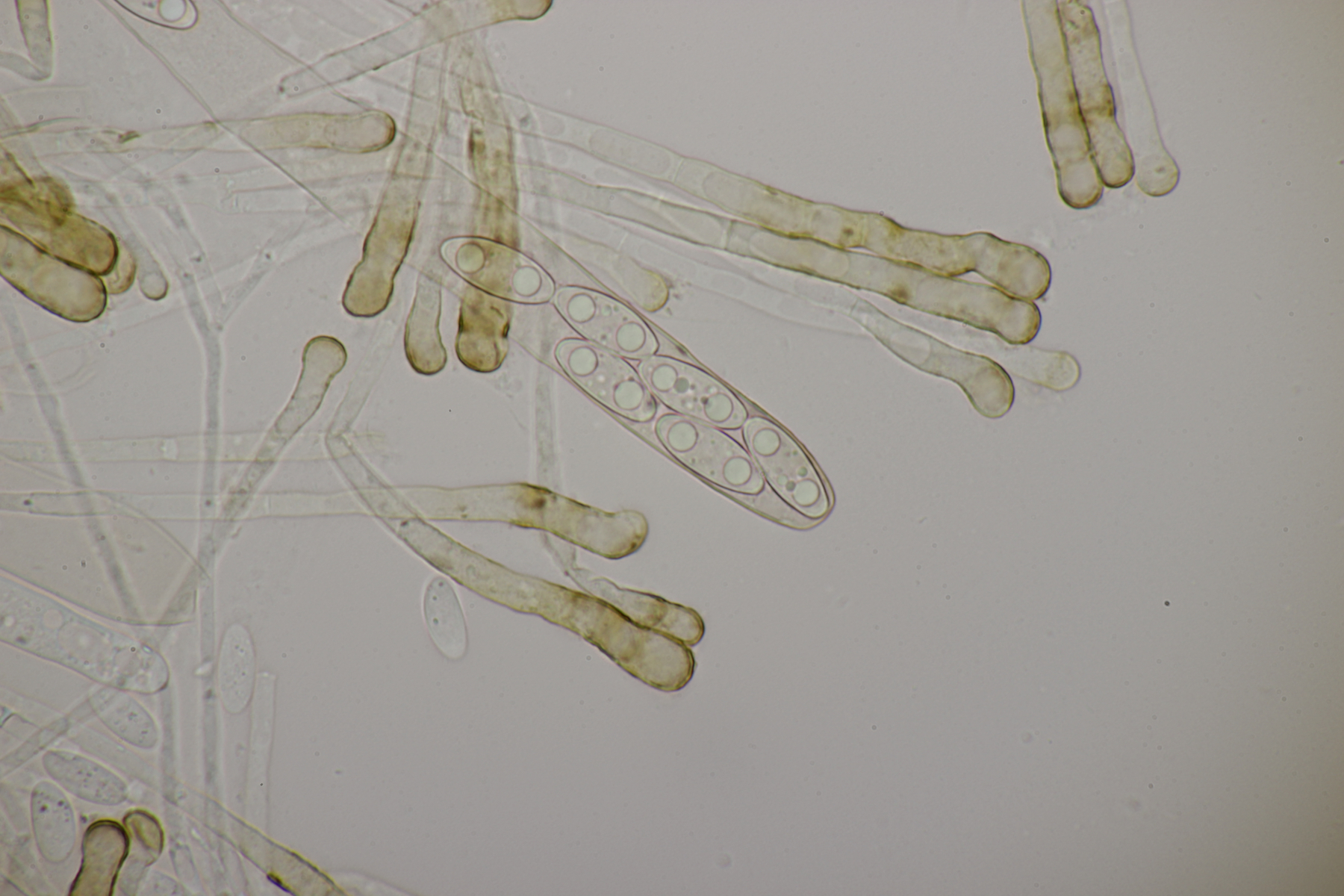 10. An Stroh (mit Pferdemist darunter?) dann eine Peziza. Die Sporen sehen ganz glatt aus, aber leider waren keine Sporen im Abwurf zu bekommen. Die Sporen in den Asci messen (17.5-20) µm x (9-11) µm, Q=1.7-2.0. Von der Sporengröße her würde das mit dem Schlüssel im Doveri am ehesten zu Peziza azorica (P. buxea in PD) passen. Oder wachsen die Sporen noch weiter und es wird am Ende eine Peziza vesiculosa? Was meint ihr?