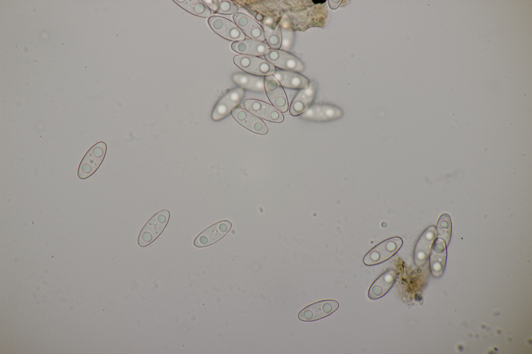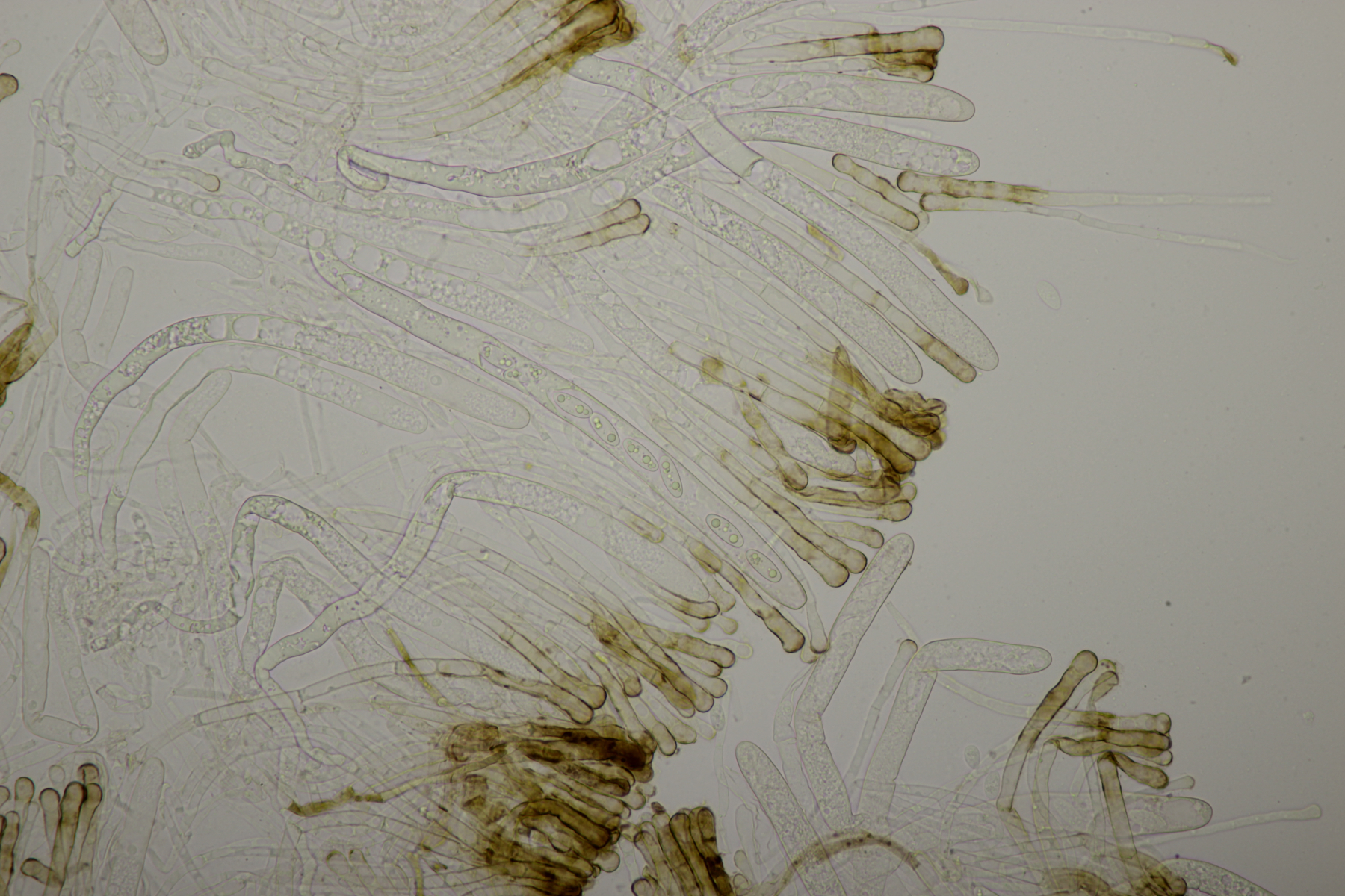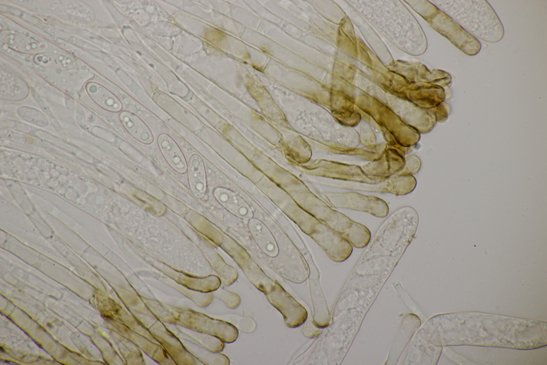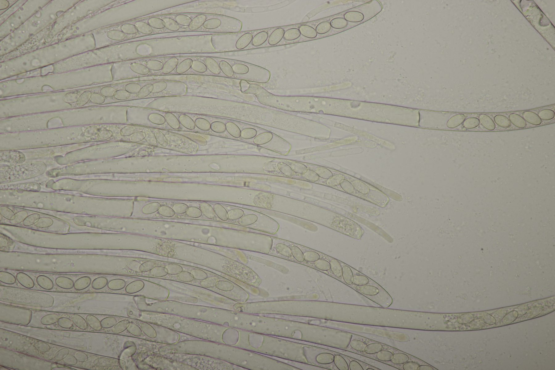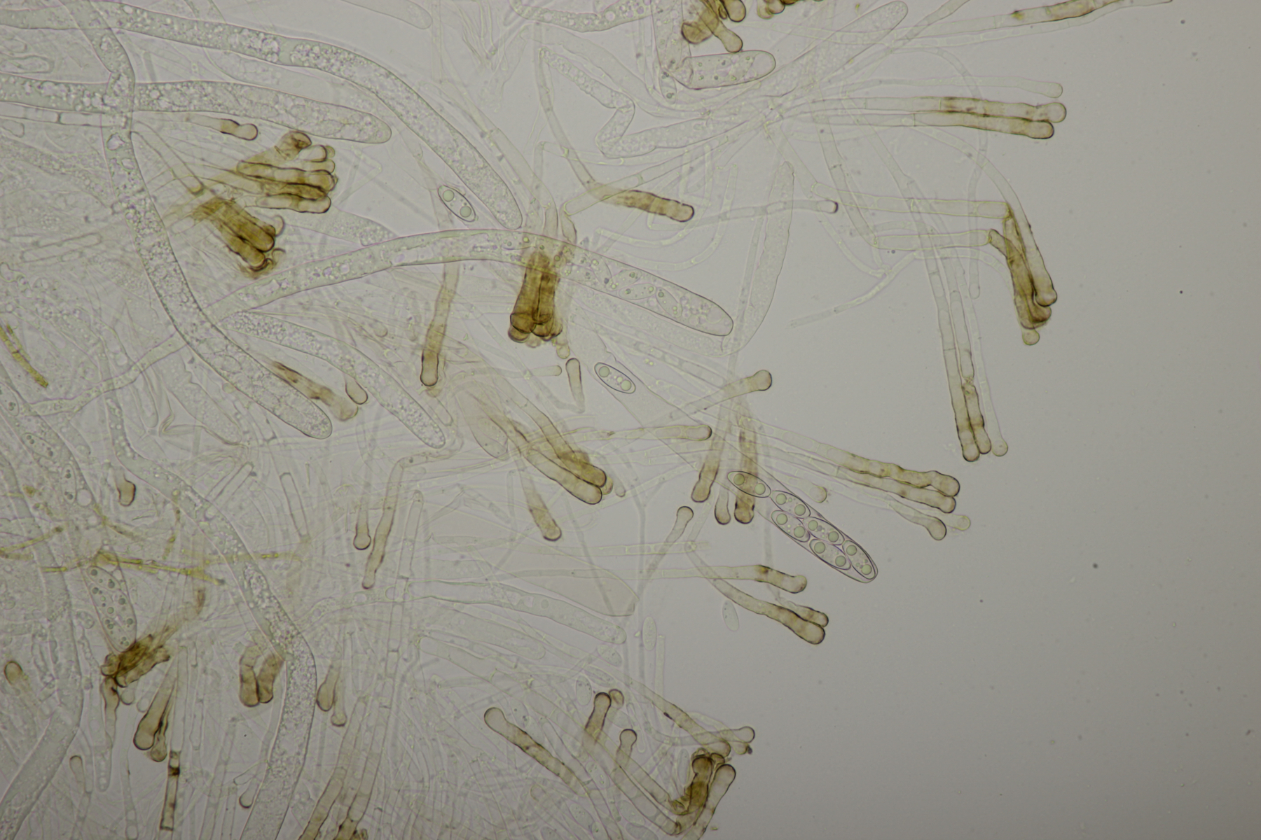 10. An Stroh (mit Pferdemist darunter?) dann eine Peziza. Die Sporen sehen ganz glatt aus, aber leider waren keine Sporen im Abwurf zu bekommen. Die Sporen in den Asci messen (17.5-20) µm x (9-11) µm, Q=1.7-2.0. Von der Sporengröße her würde das mit dem Schlüssel im Doveri am ehesten zu Peziza azorica (P. buxea in PD) passen. Oder wachsen die Sporen noch weiter und es wird am Ende eine Peziza vesiculosa? Was meint ihr?