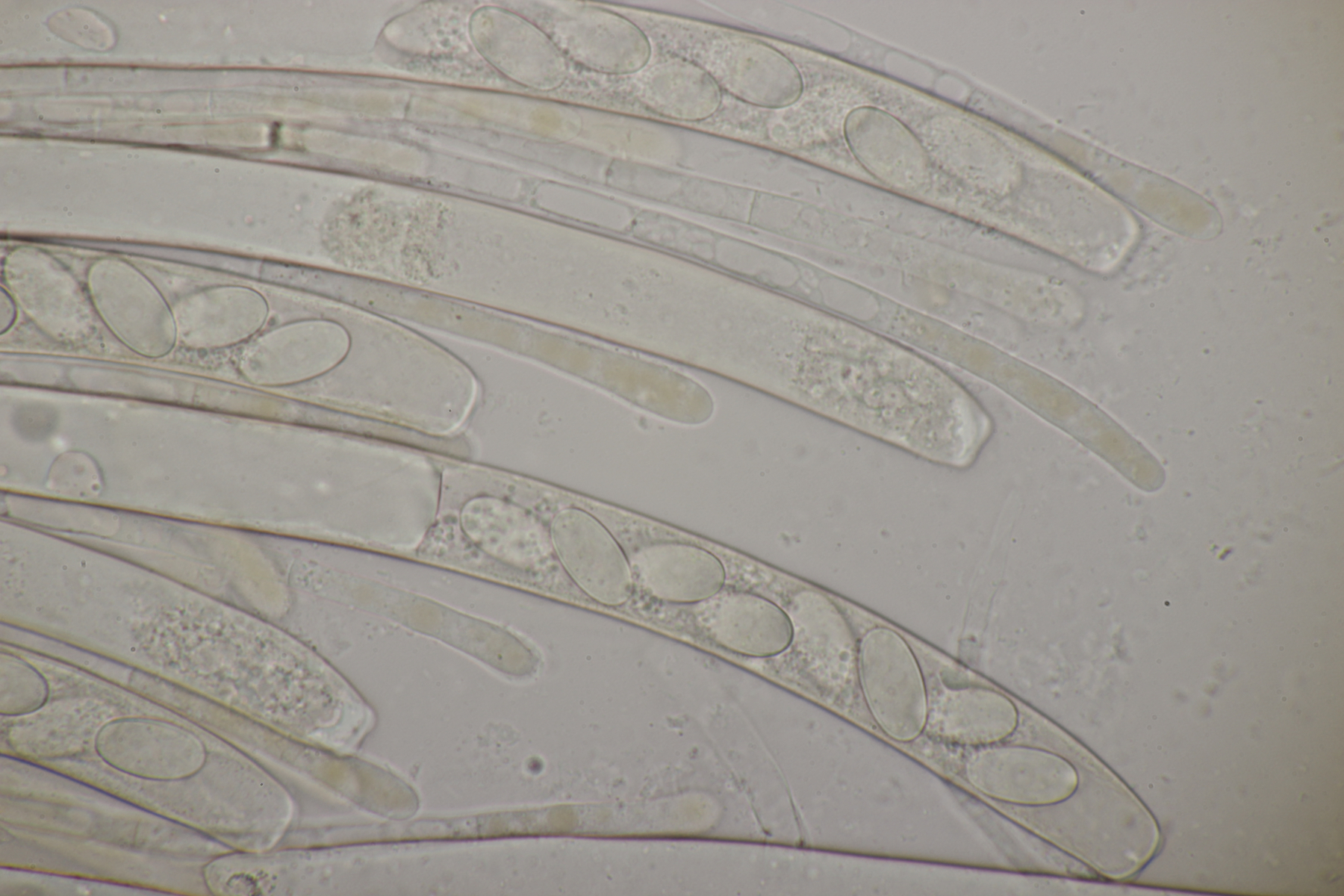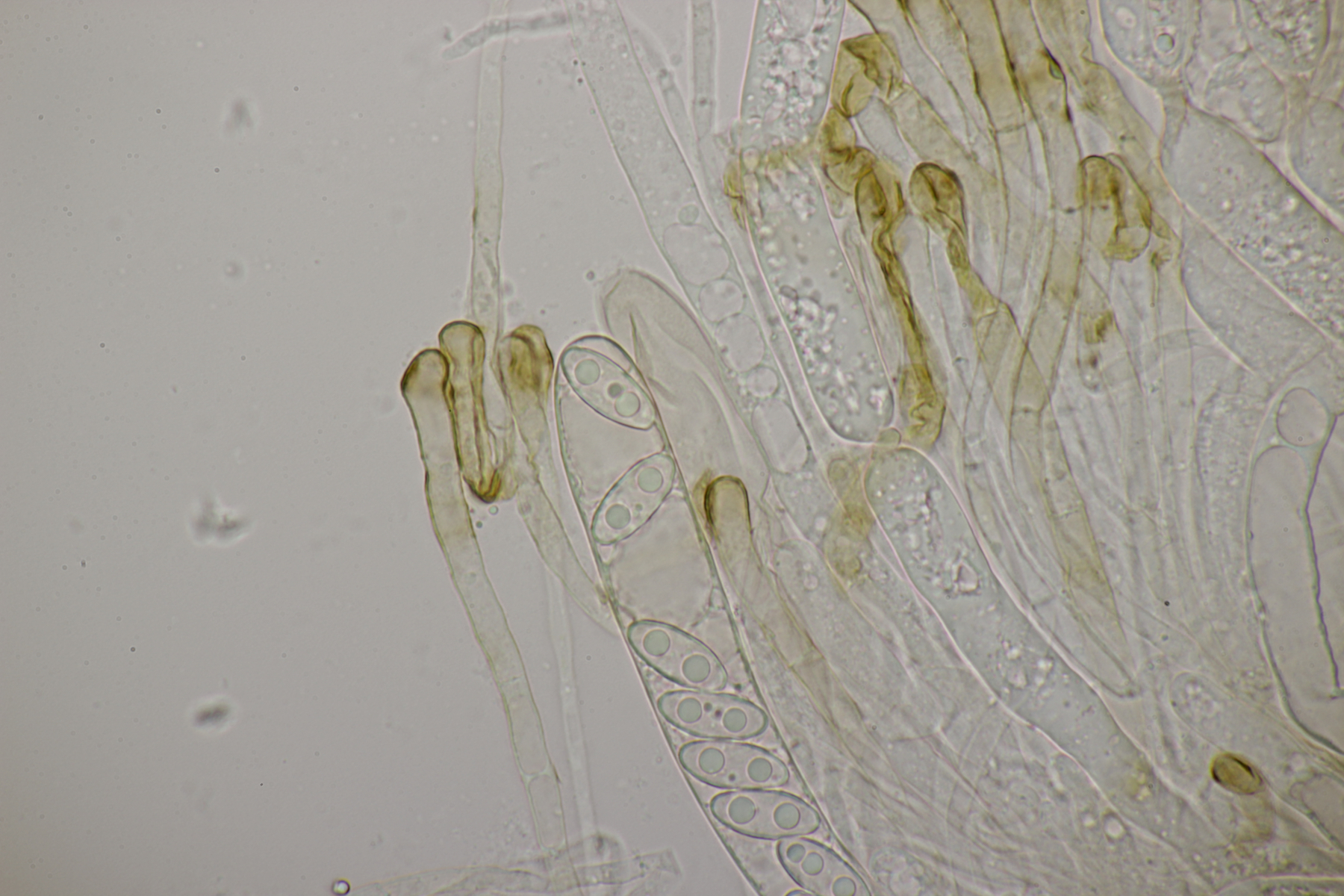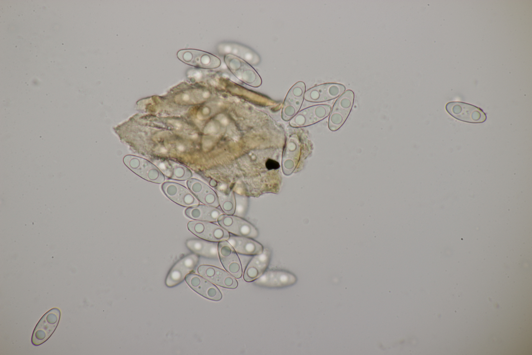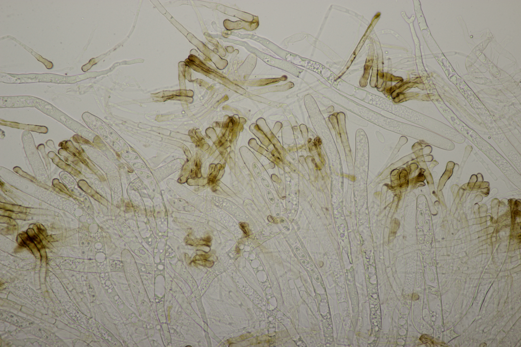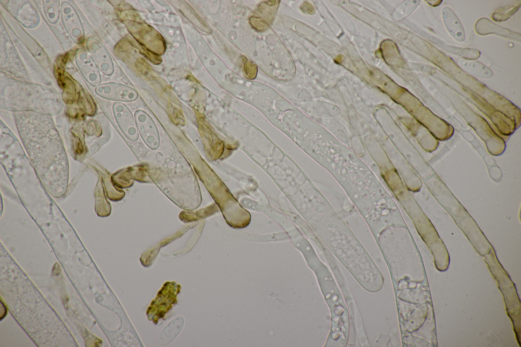 10. An Stroh (mit Pferdemist darunter?) dann eine Peziza. Die Sporen sehen ganz glatt aus, aber leider waren keine Sporen im Abwurf zu bekommen. Die Sporen in den Asci messen (17.5-20) µm x (9-11) µm, Q=1.7-2.0. Von der Sporengröße her würde das mit dem Schlüssel im Doveri am ehesten zu Peziza azorica (P. buxea in PD) passen. Oder wachsen die Sporen noch weiter und es wird am Ende eine Peziza vesiculosa? Was meint ihr?