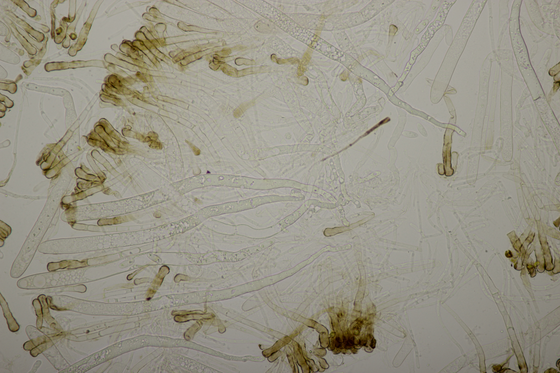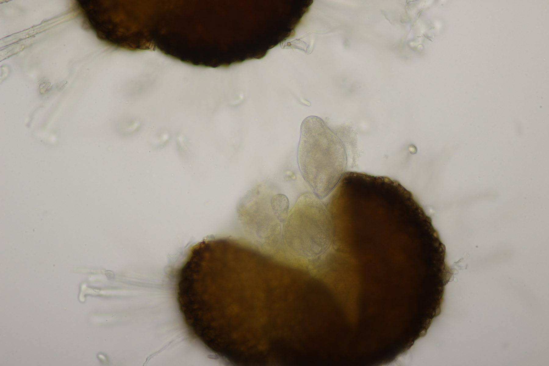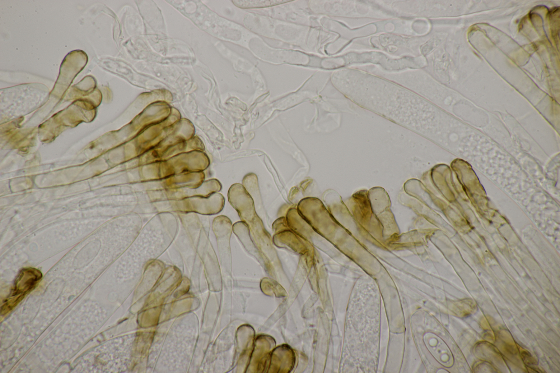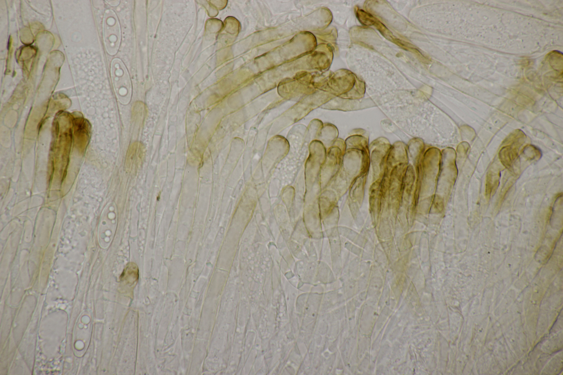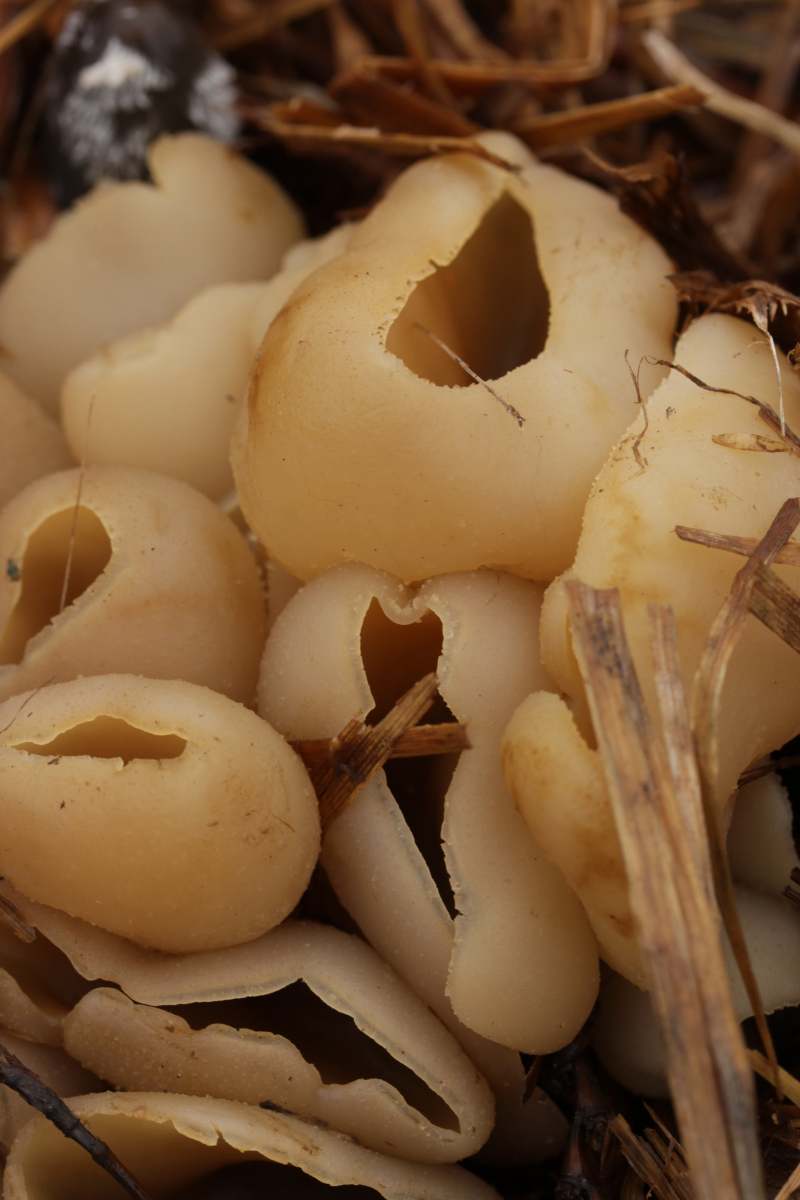 10. An Stroh (mit Pferdemist darunter?) dann eine Peziza. Die Sporen sehen ganz glatt aus, aber leider waren keine Sporen im Abwurf zu bekommen. Die Sporen in den Asci messen (17.5-20) µm x (9-11) µm, Q=1.7-2.0. Von der Sporengröße her würde das mit dem Schlüssel im Doveri am ehesten zu Peziza azorica (P. buxea in PD) passen. Oder wachsen die Sporen noch weiter und es wird am Ende eine Peziza vesiculosa? Was meint ihr?