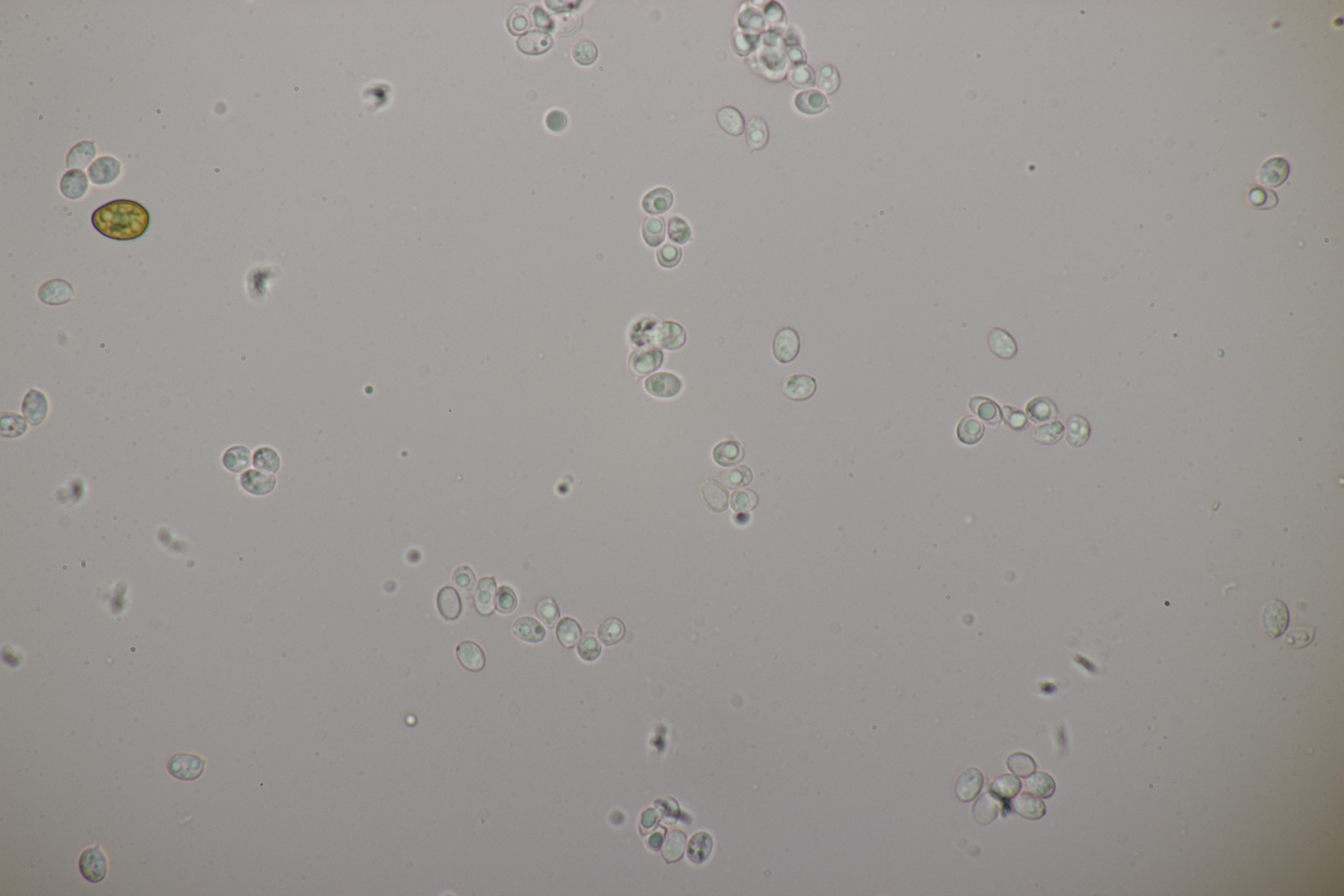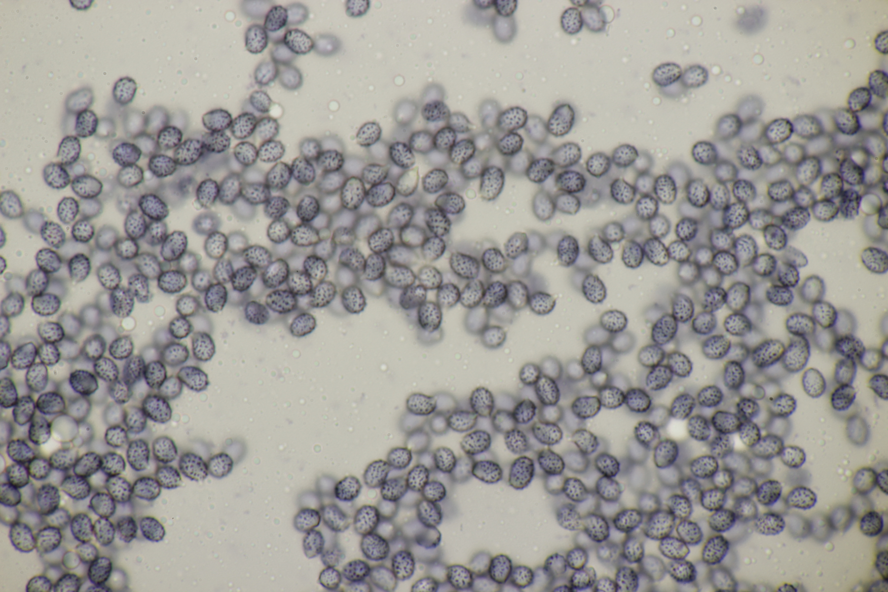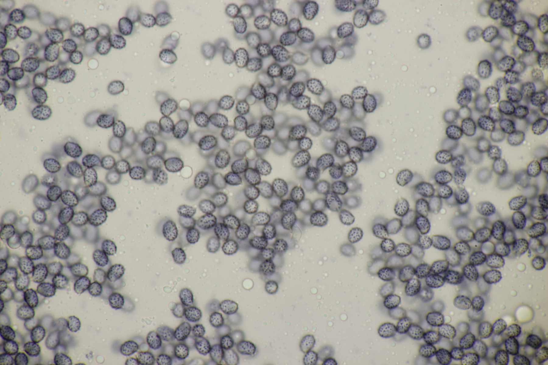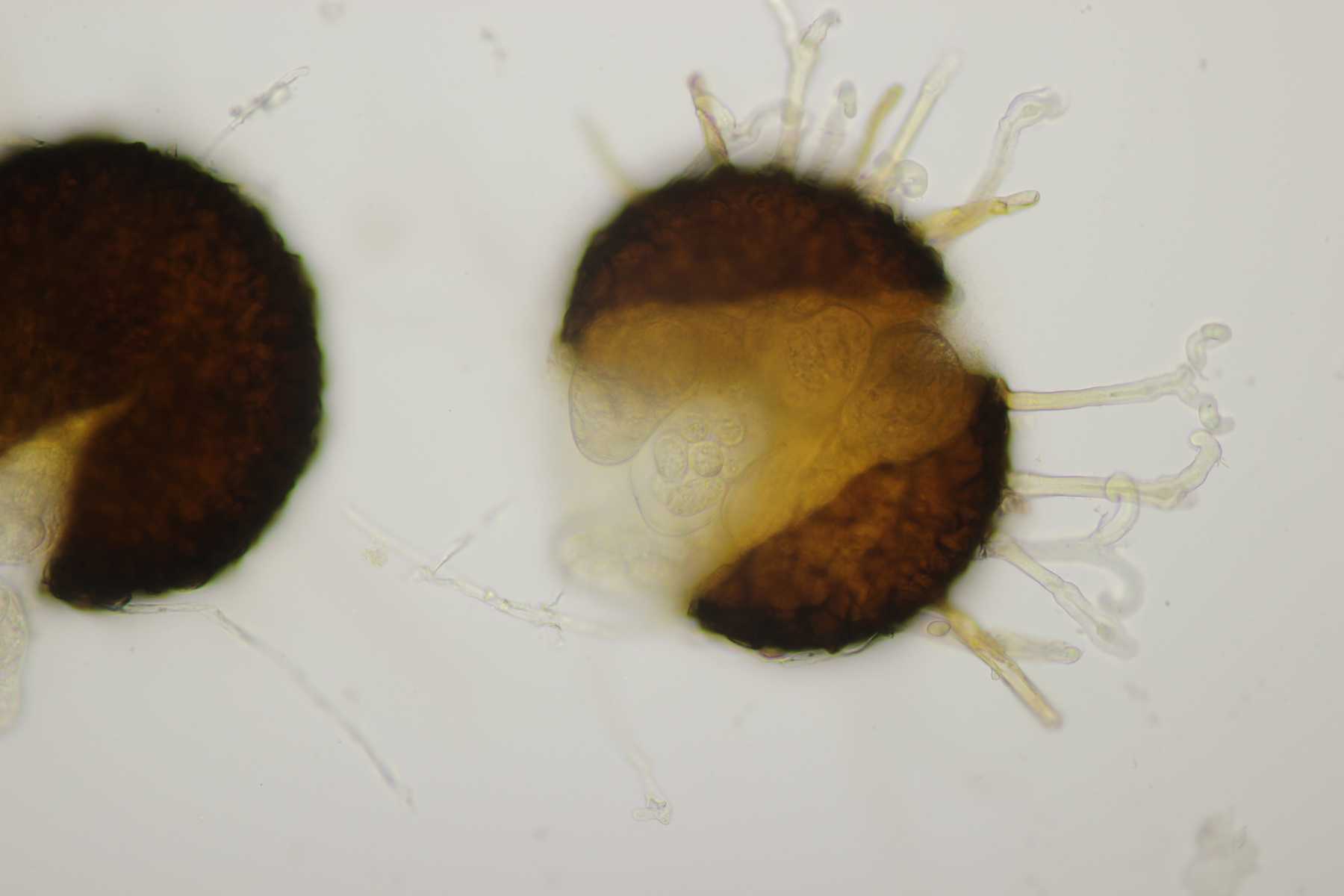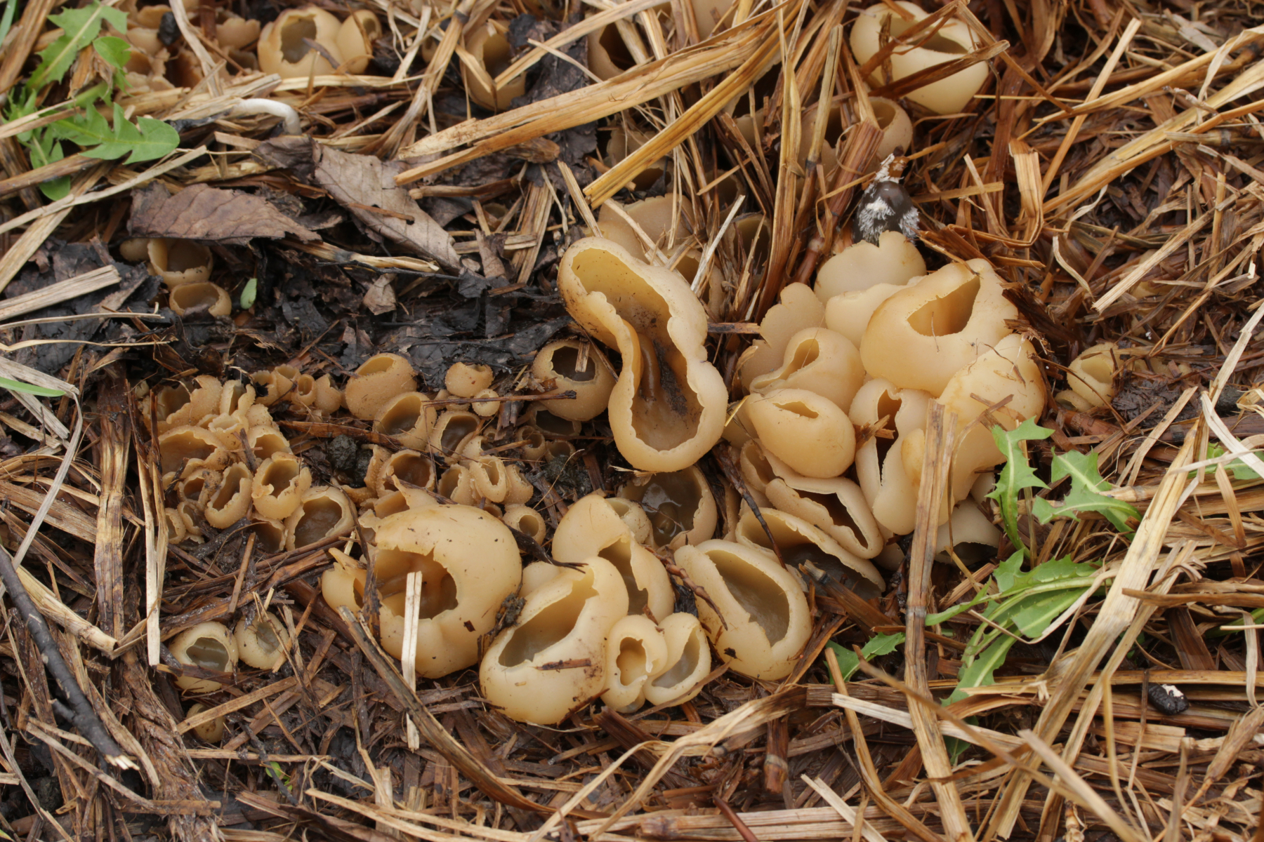 10. An Stroh (mit Pferdemist darunter?) dann eine Peziza. Die Sporen sehen ganz glatt aus, aber leider waren keine Sporen im Abwurf zu bekommen. Die Sporen in den Asci messen (17.5-20) µm x (9-11) µm, Q=1.7-2.0. Von der Sporengröße her würde das mit dem Schlüssel im Doveri am ehesten zu Peziza azorica (P. buxea in PD) passen. Oder wachsen die Sporen noch weiter und es wird am Ende eine Peziza vesiculosa? Was meint ihr?