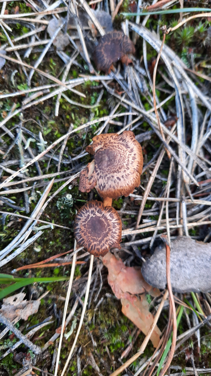 Ich hätte den Fund spontan für einen Risspilz gehalten (Inocybe sp) und habe einfach mal im Ludwig geblättert, ob es da welche gäbe, deren Hut diesem auffällig gemusterten Hut entsprechen würde. Ja, gibt es, sogar mehrere. Auf Sand wächst von denen allerdings höchstens I. brunneotomentosa. Die Art wäre allerdings extrem selten und auch die Baumarten passen eher nicht - außer es war vielleicht doch eine Eiche in direkter Nähe.