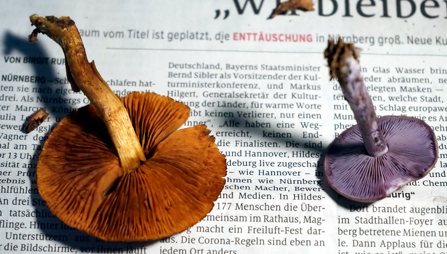 Pilz 3 (lila): Geruch nicht wahrnehmbar. Sporenpulver nicht vorhanden. Oder weiß? Dummerweise habe ich ein weißes Papier untergelegt.