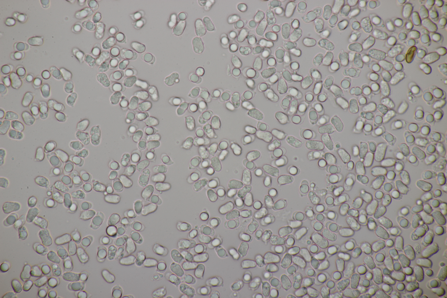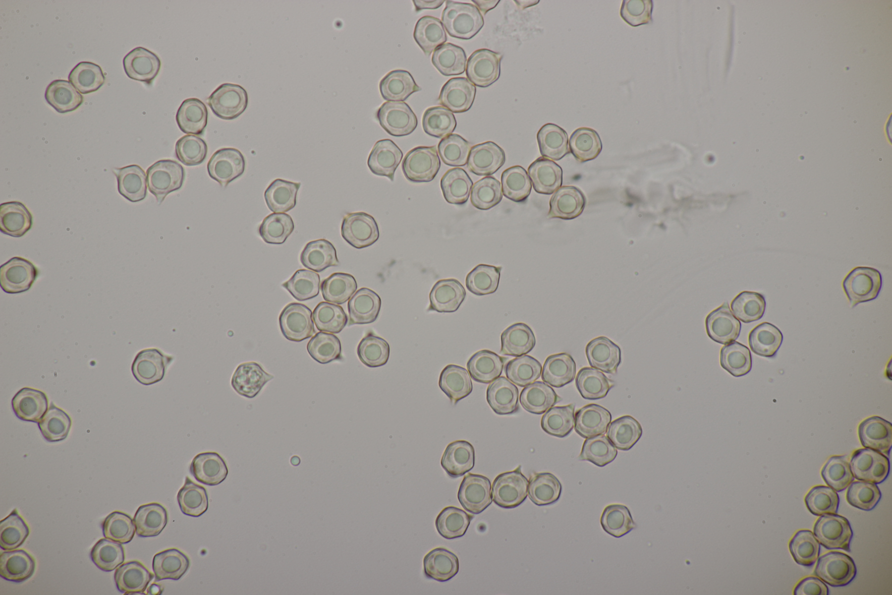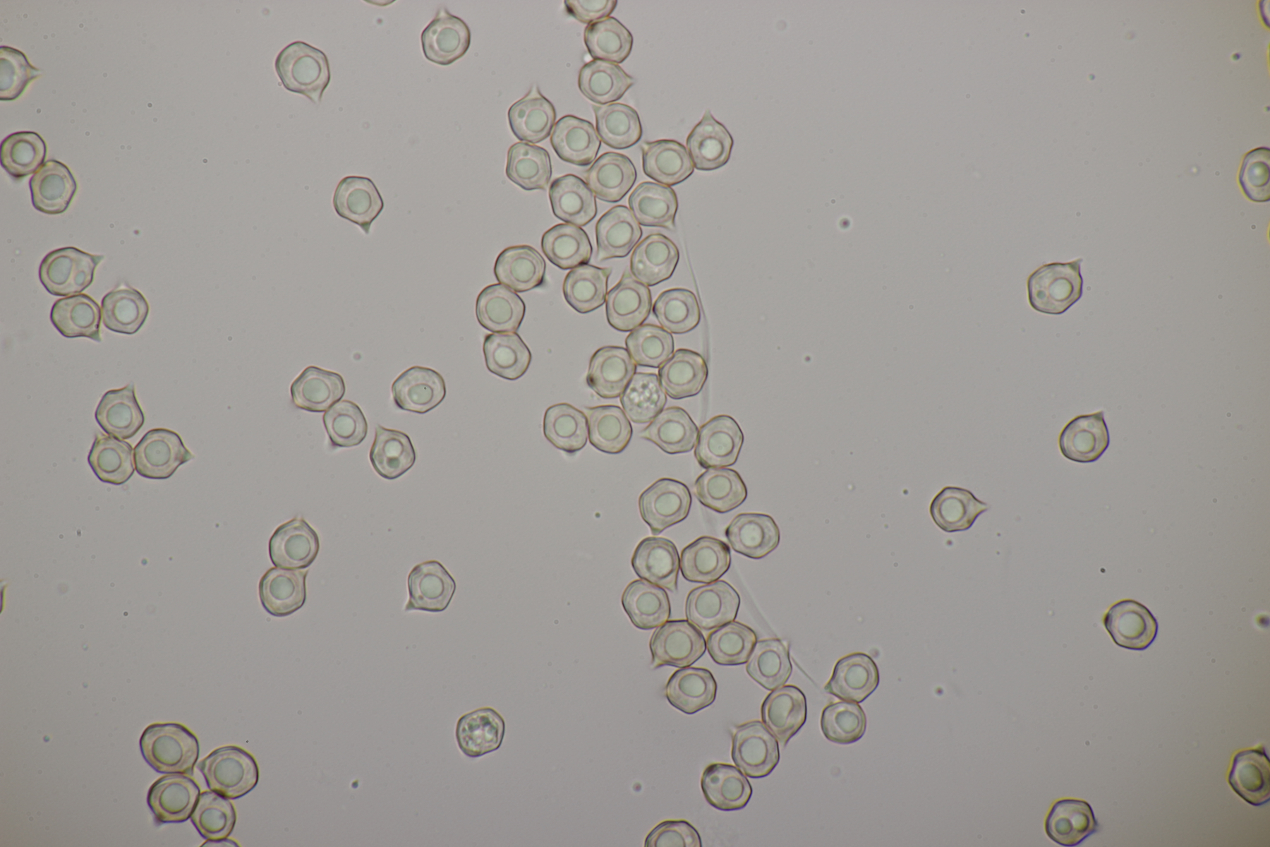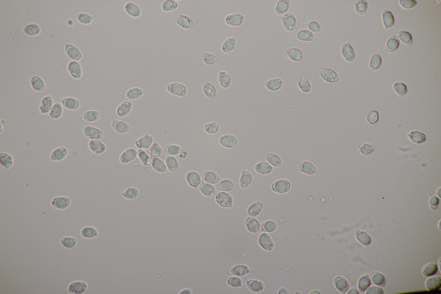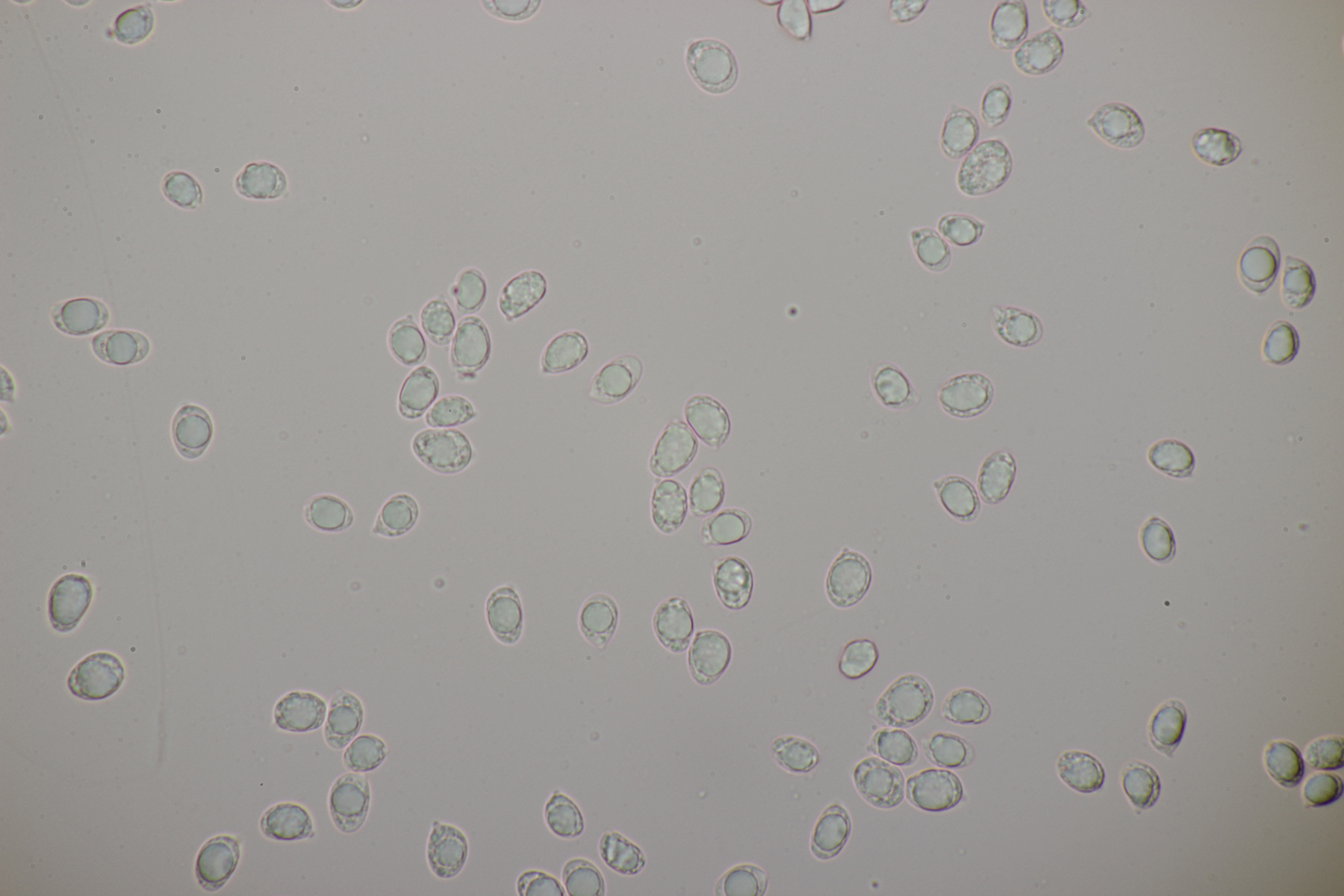 4. Eine weiße Tricholoma unter Quercus. Der Geruch war eher angenehm, so daß ich den Fund unter Tricholoma album ablegen würde. Sporengröße (6.1+-0.4) µm x (3.8+-0.2) µm, Q=1.6+-0.1 bzw. (5.3-6.8) µm x (3.4-4.2) µm, Q=1.4-1.7