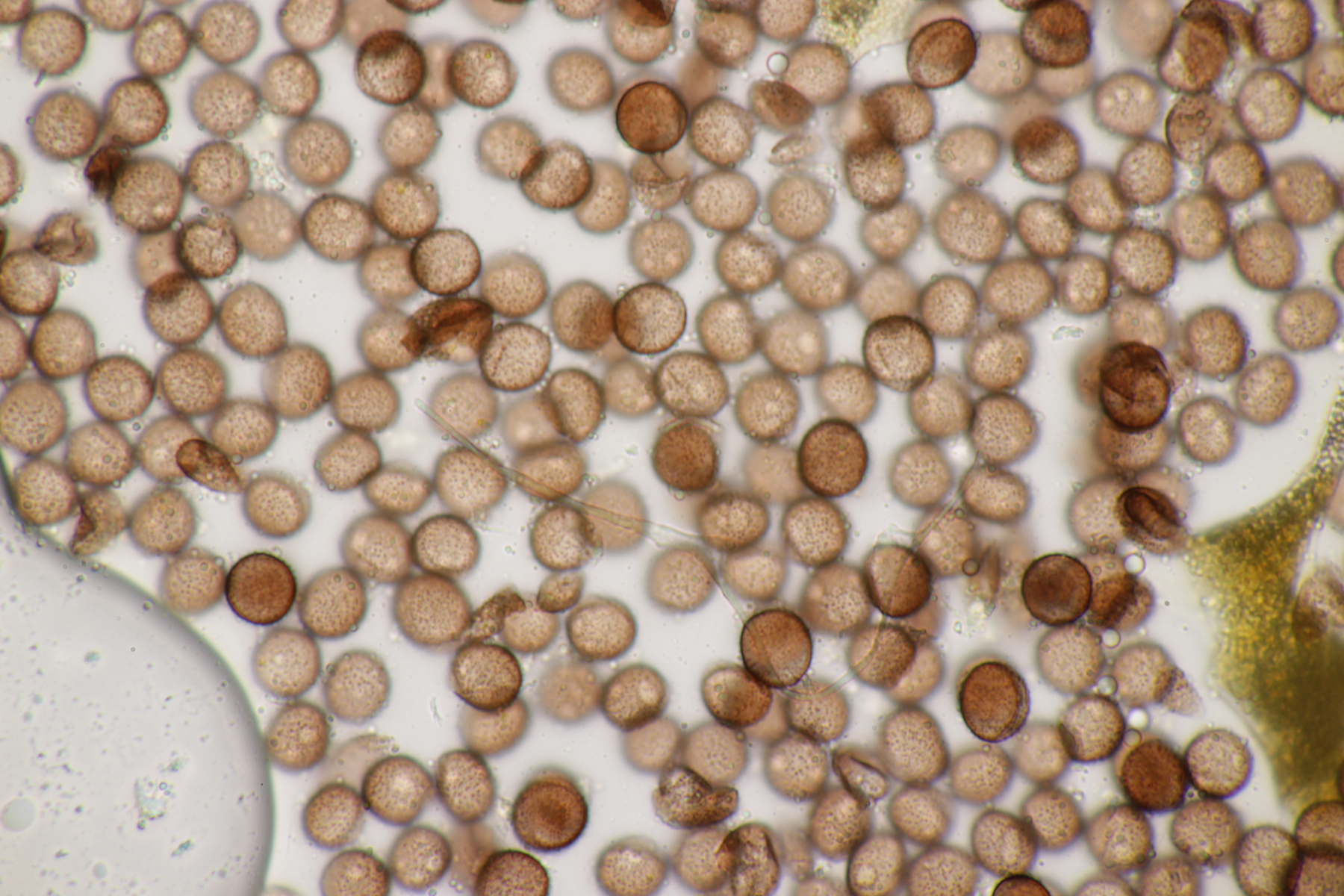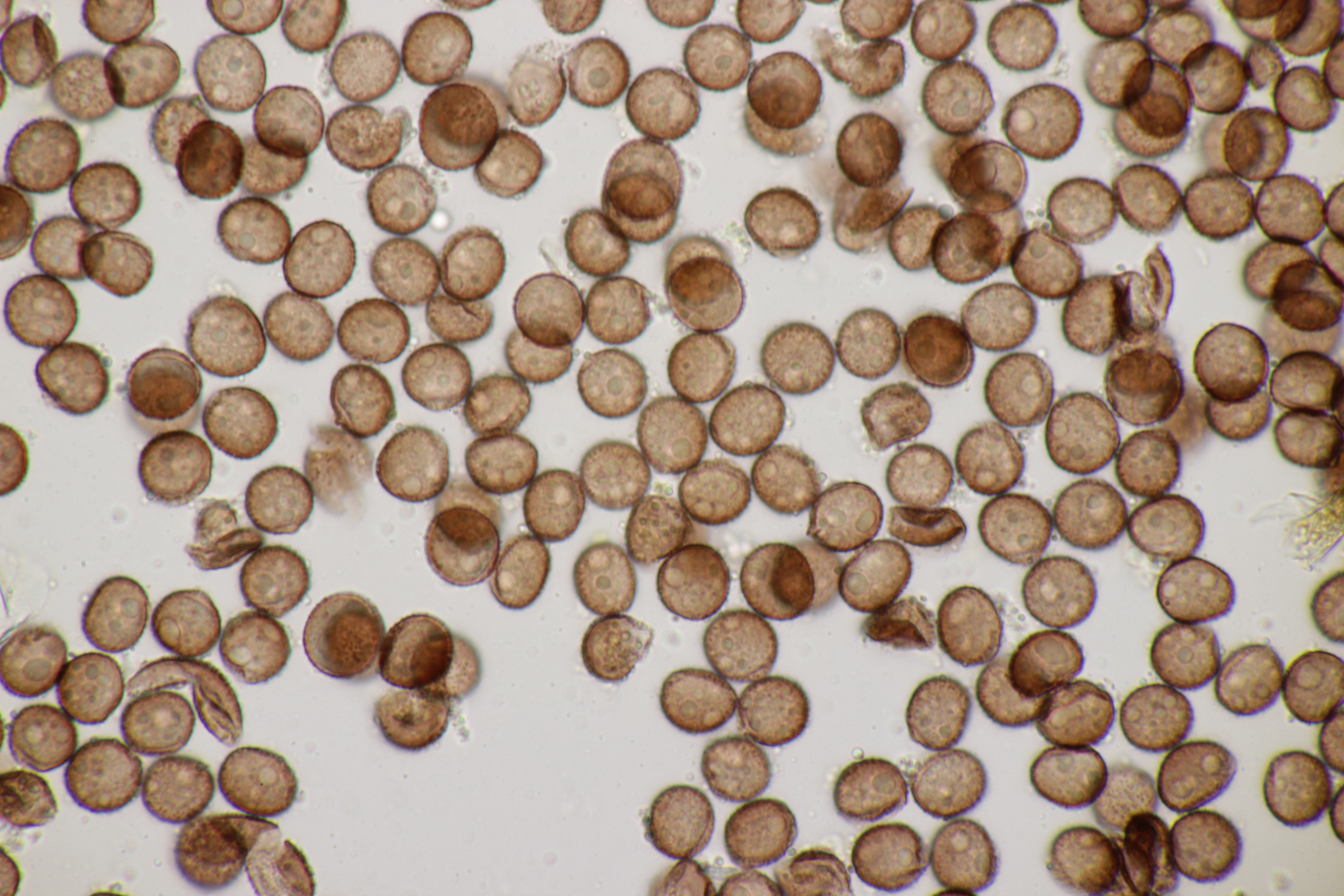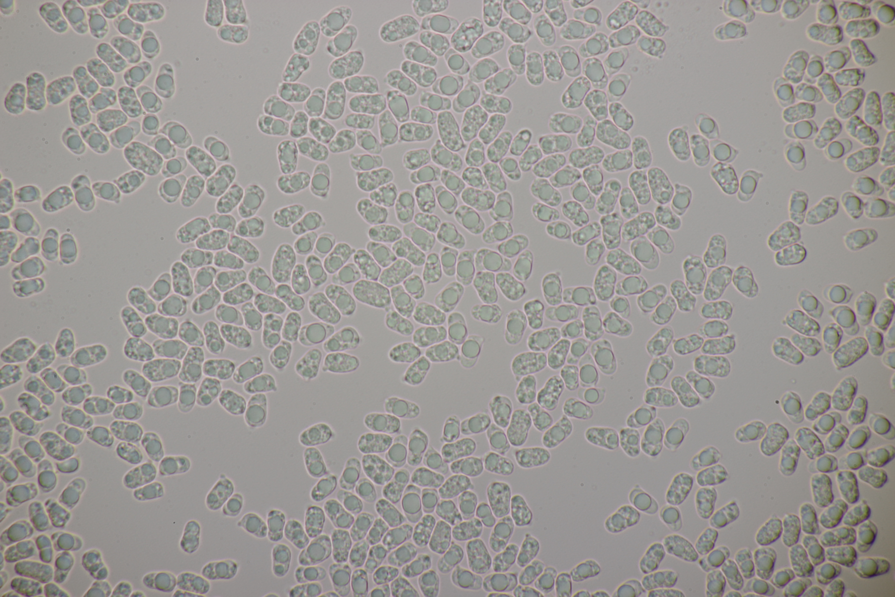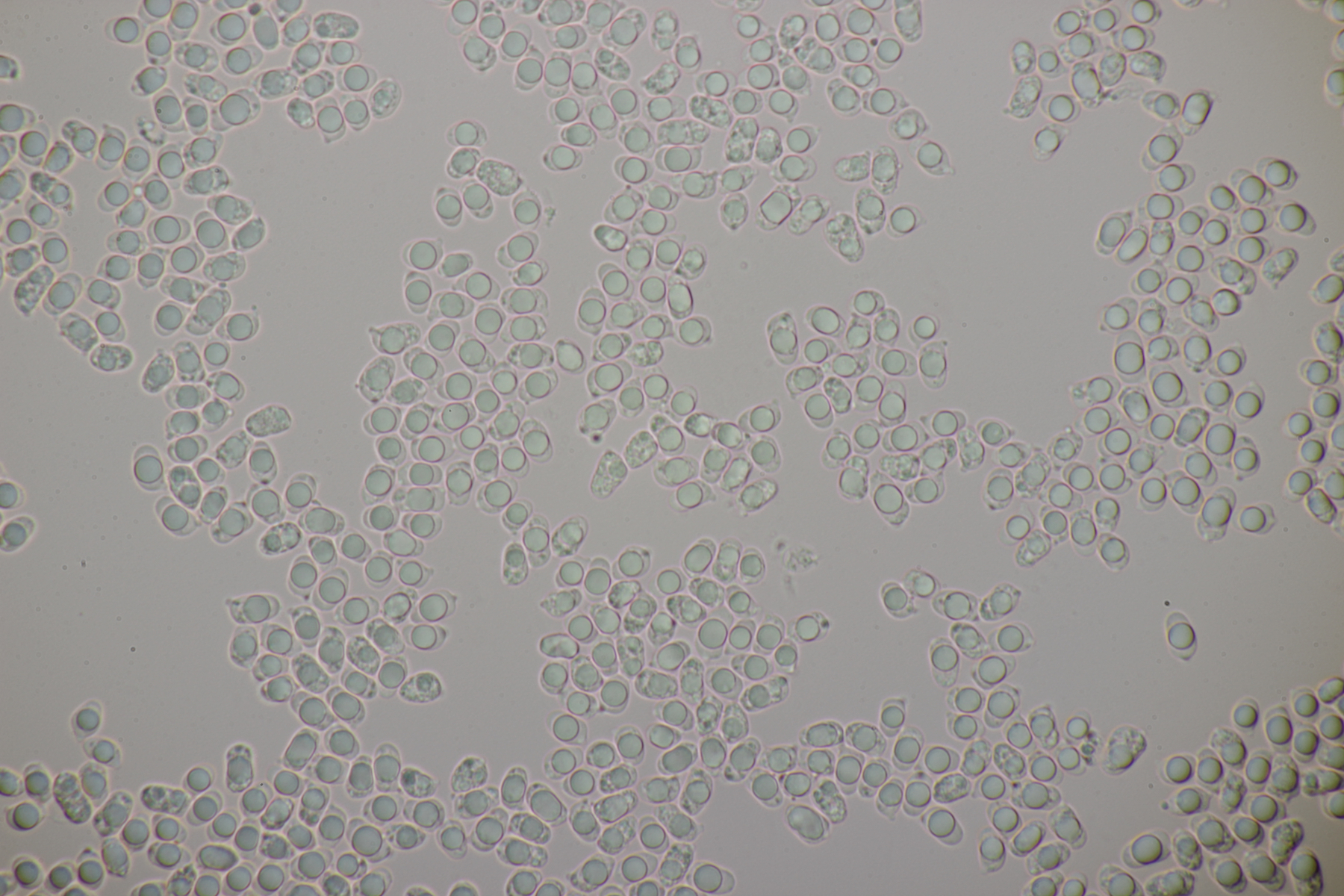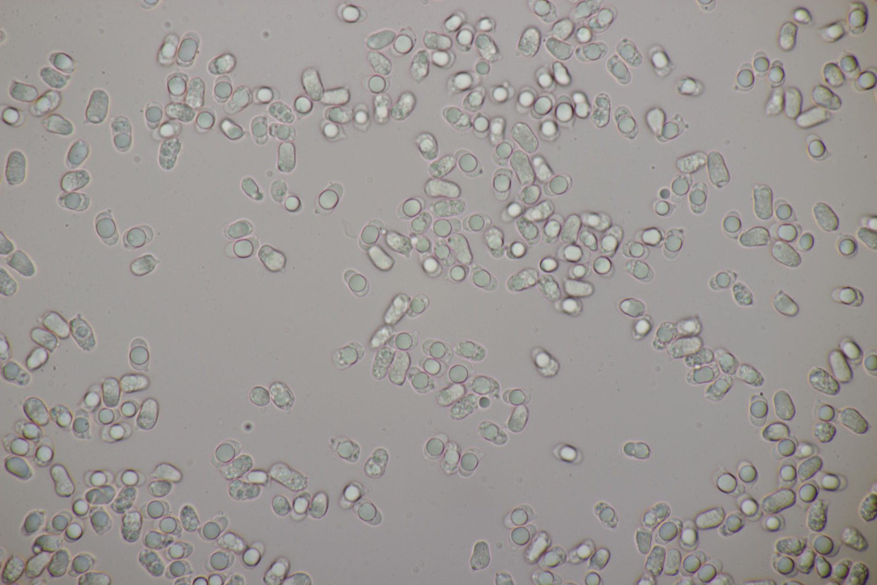 4. Eine weiße Tricholoma unter Quercus. Der Geruch war eher angenehm, so daß ich den Fund unter Tricholoma album ablegen würde. Sporengröße (6.1+-0.4) µm x (3.8+-0.2) µm, Q=1.6+-0.1 bzw. (5.3-6.8) µm x (3.4-4.2) µm, Q=1.4-1.7