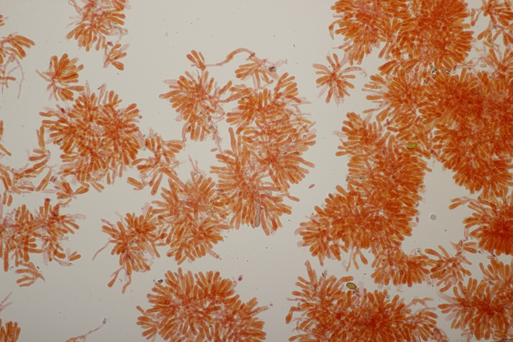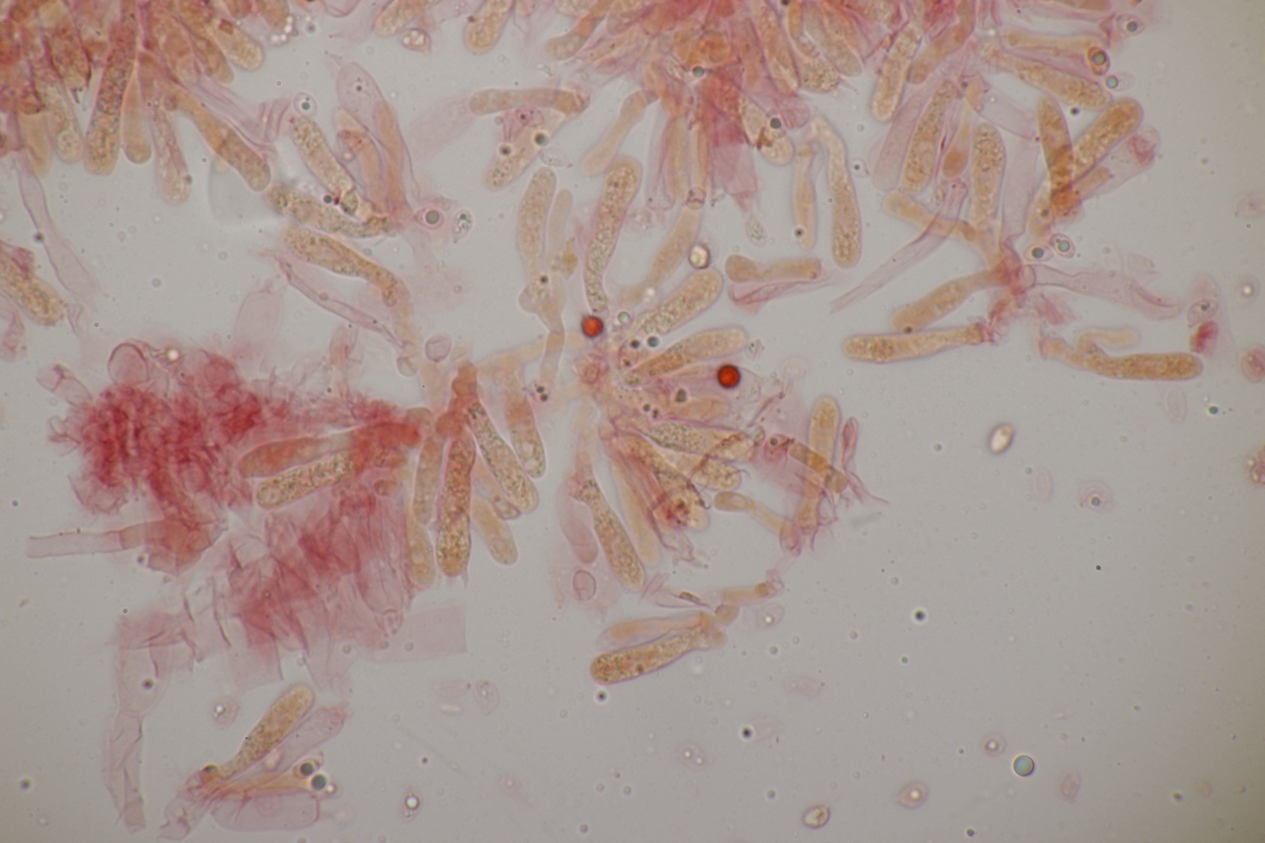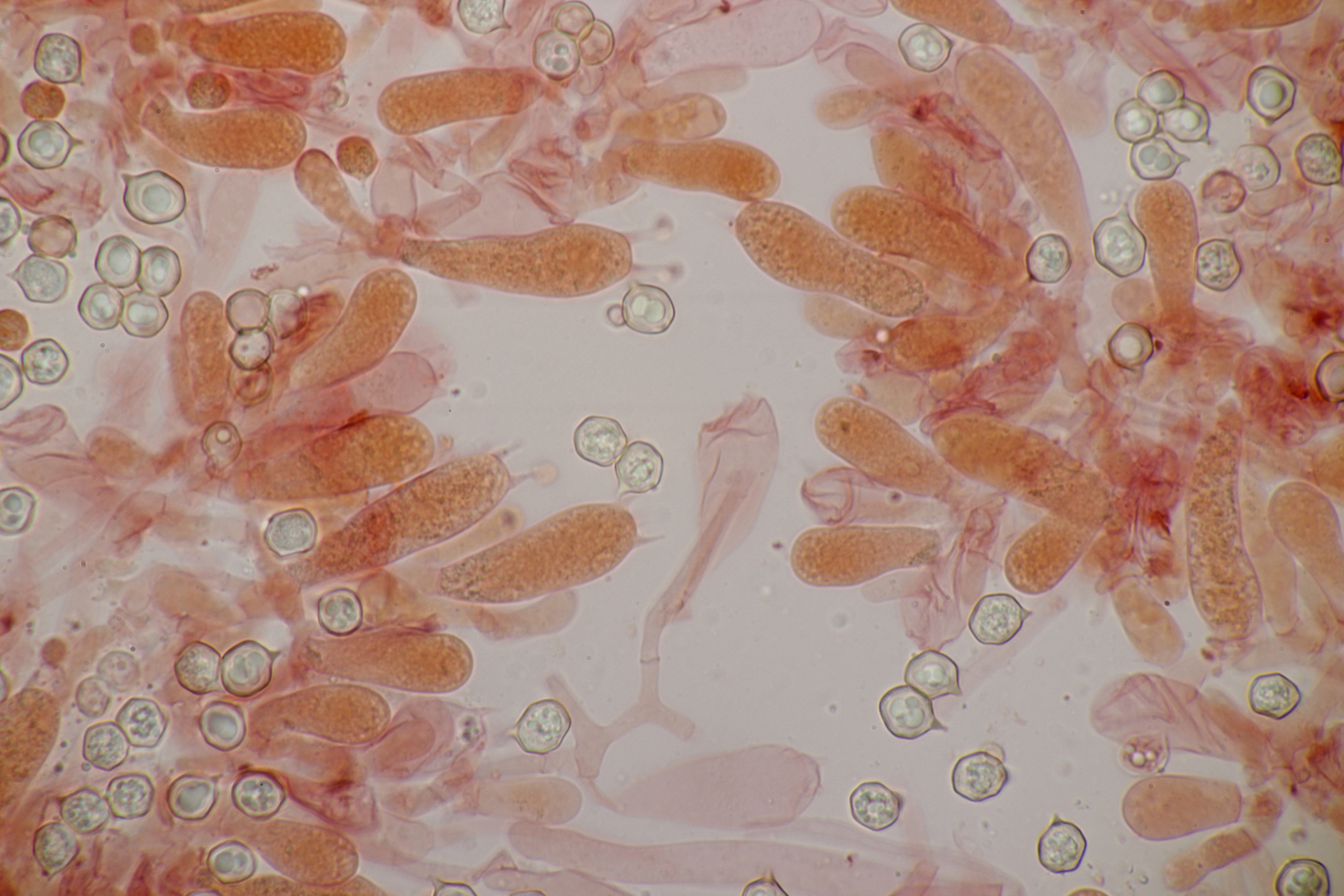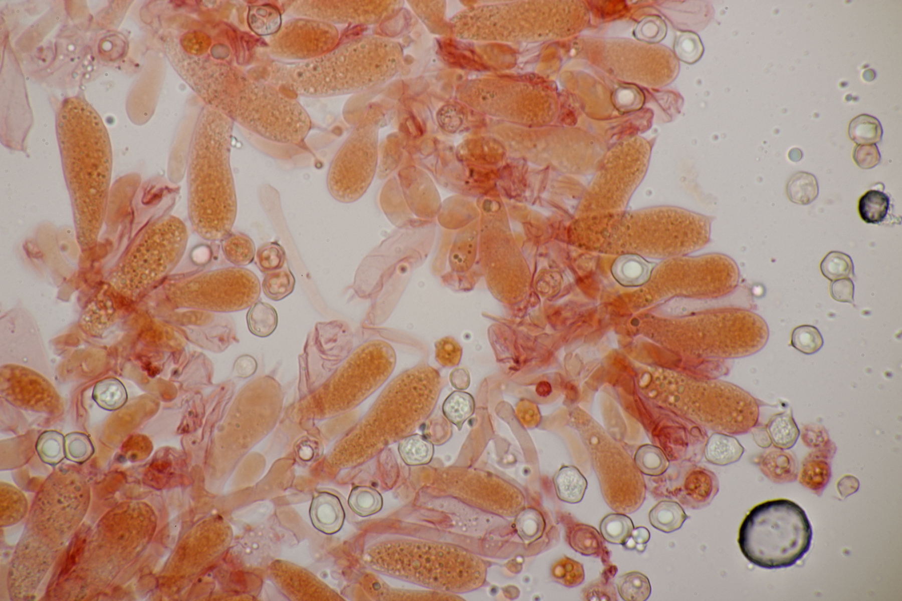 5. Hygrocybe miniata, Sporen (8.0+-0.5) µm x (4.6+-0.3) µm, Q=1.8+-0.2 bzw. (7.3-9.1) µm x (4.2-5.0) µm, Q=1.4-2.1 und ohne Knoblauchsgeruch