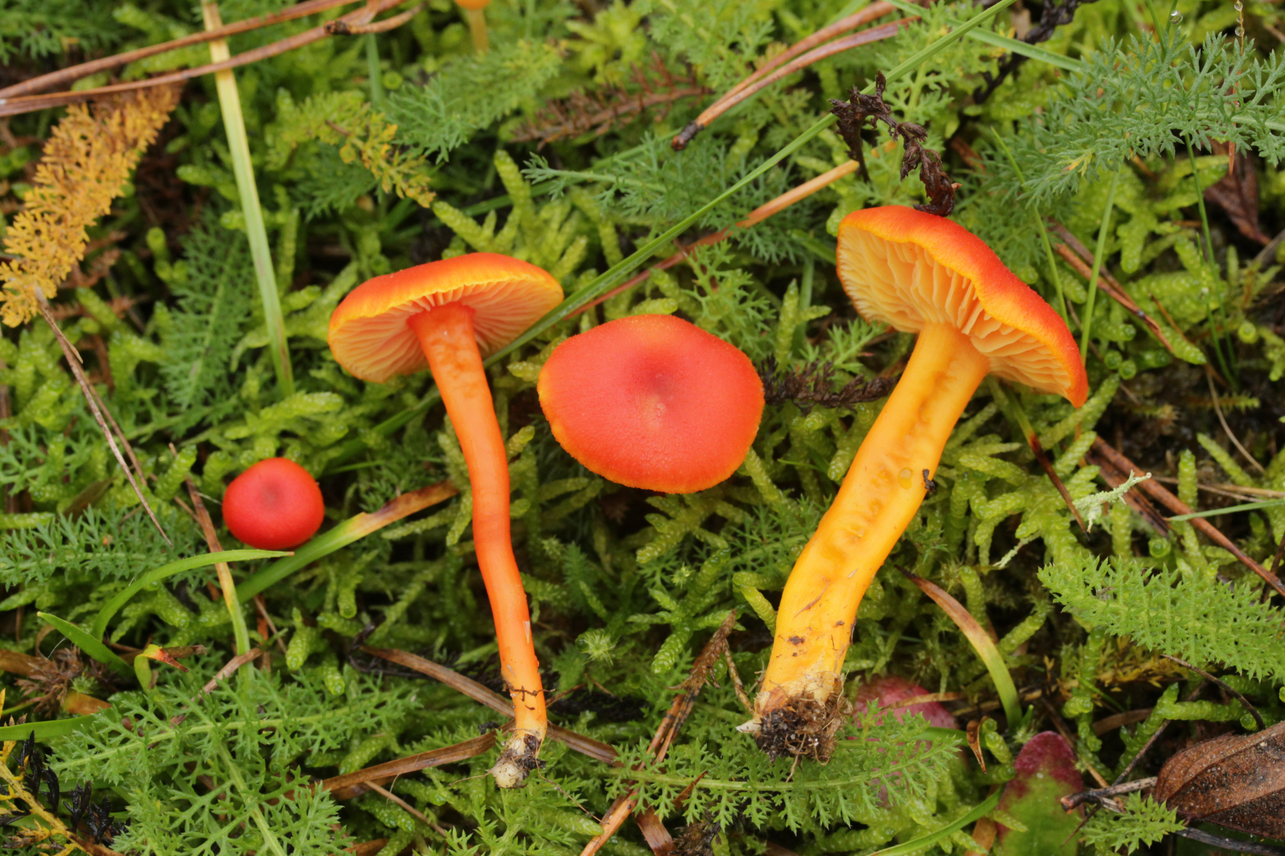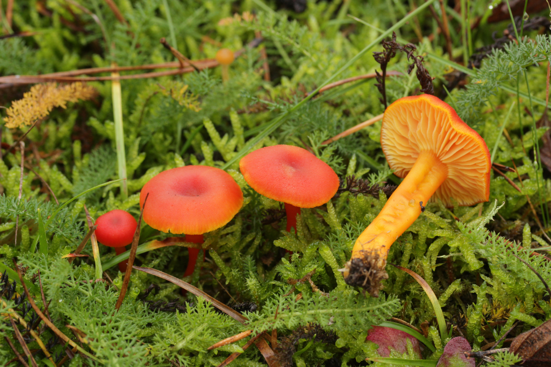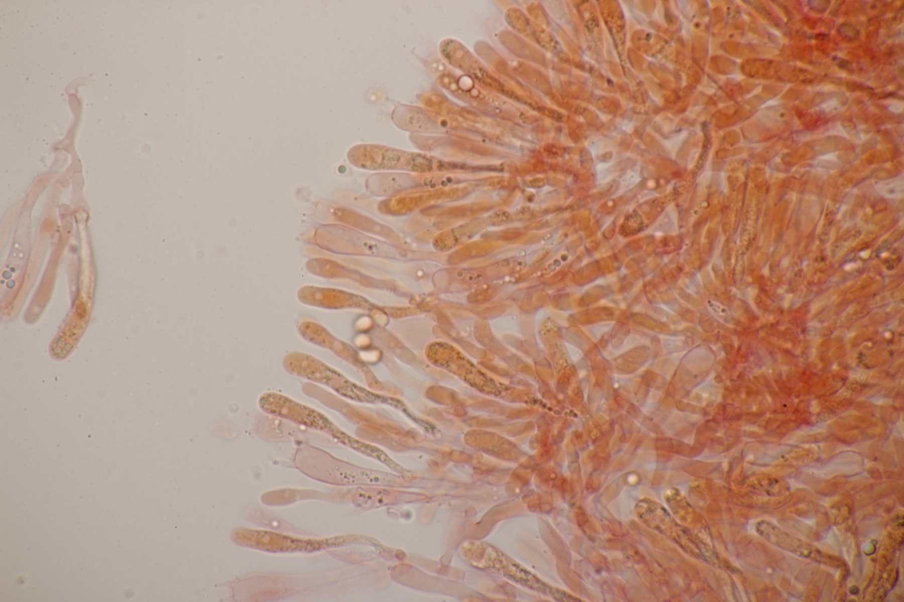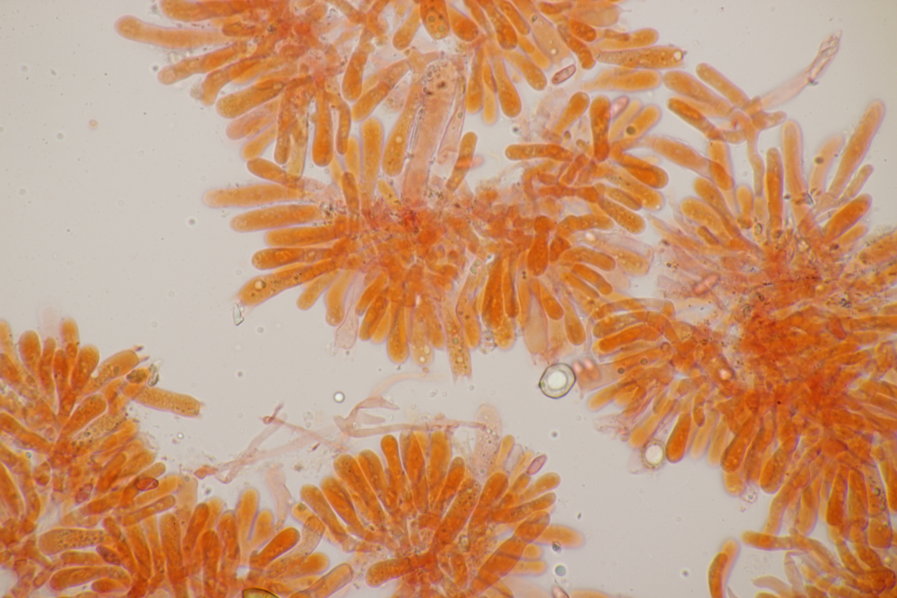 5. Hygrocybe miniata, Sporen (8.0+-0.5) µm x (4.6+-0.3) µm, Q=1.8+-0.2 bzw. (7.3-9.1) µm x (4.2-5.0) µm, Q=1.4-2.1 und ohne Knoblauchsgeruch