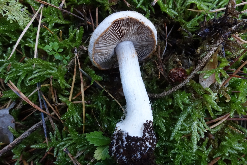 Ein einzelner Schleierling tief im Moos vergraben. Auffallend heller creme-gräulicher Hut eingewachsen radialfaserig, glatt und leicht klebrig. Lamellen auch im Alter noch recht hell cremefarben bis gräulich; gesägt. Stiel weißlich, gerandete Knolle ebenso. Auch Fleisch weißlich. Geruch nicht vorhanden, Huthaut bitter! KOH überall negativ. Sporen 8,8 x 5,1µm.