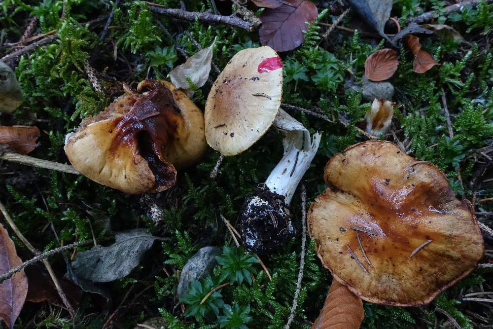 Quasi eine Leiche, aber von allen umstehenden Leichen noch die vitalste. Bevor ich ihn im Wald lasse, habe einfach mal KOH auf die Knolle geschmiert und wurde von einer sofortig leuchtend pink-roten Farbreaktion überrascht. Daher habe ich den Fund doch mitgenommen und einem Bestimmungsversuch unterzogen.