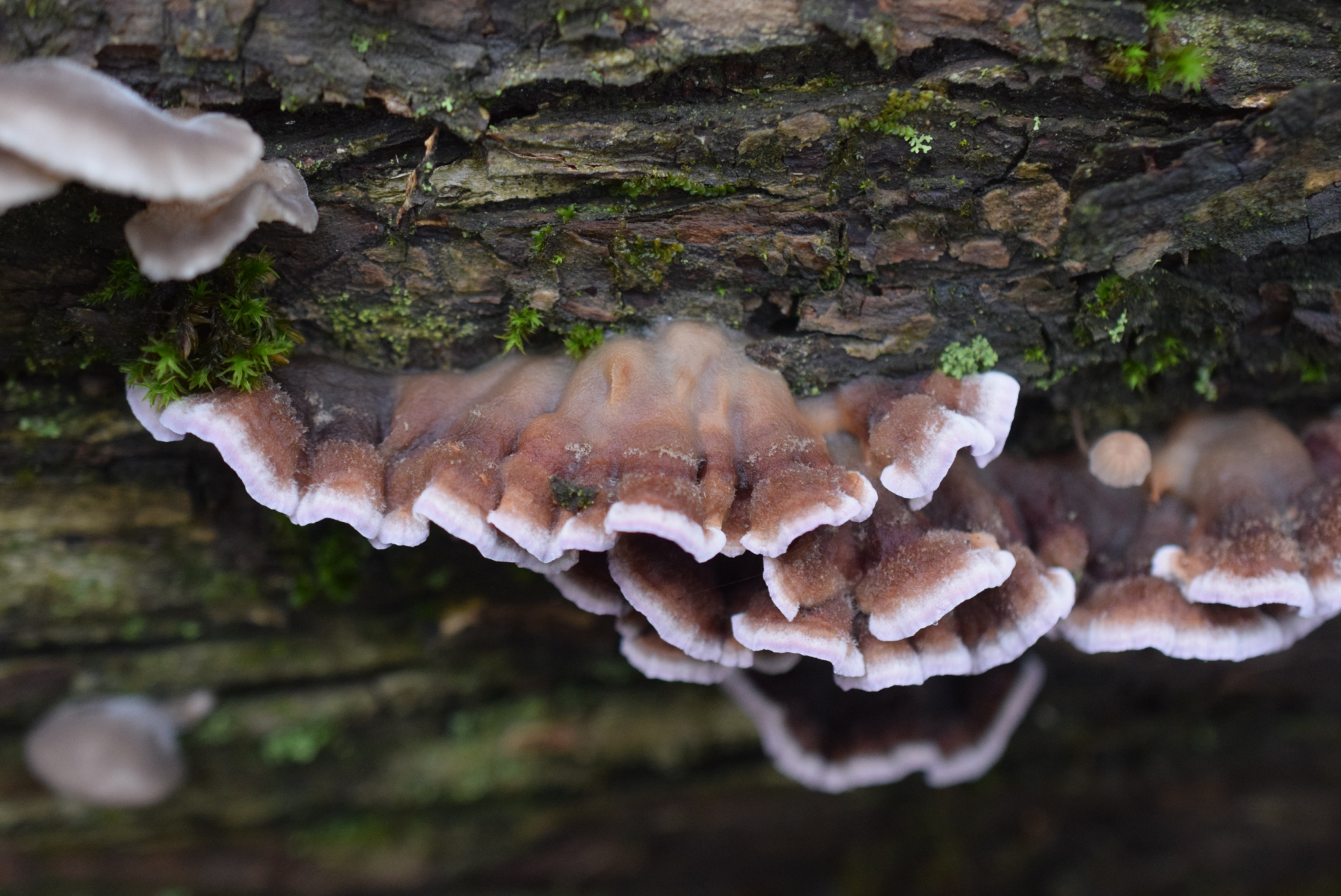 Man müssste da mal noch einen oder zwei Fruchtkörper umdrehen oder sonstwie von unten angucken, aber die Chance auf Chondrostereum purpureum (Violetter Knorpelschichtpilz) ist ziemlich hoch.