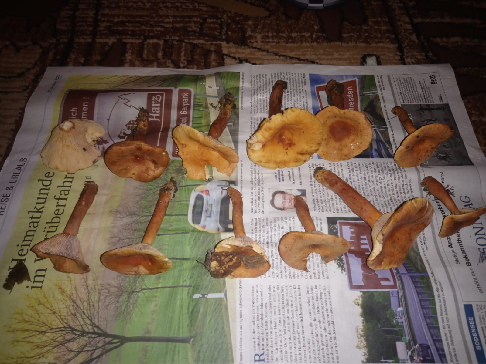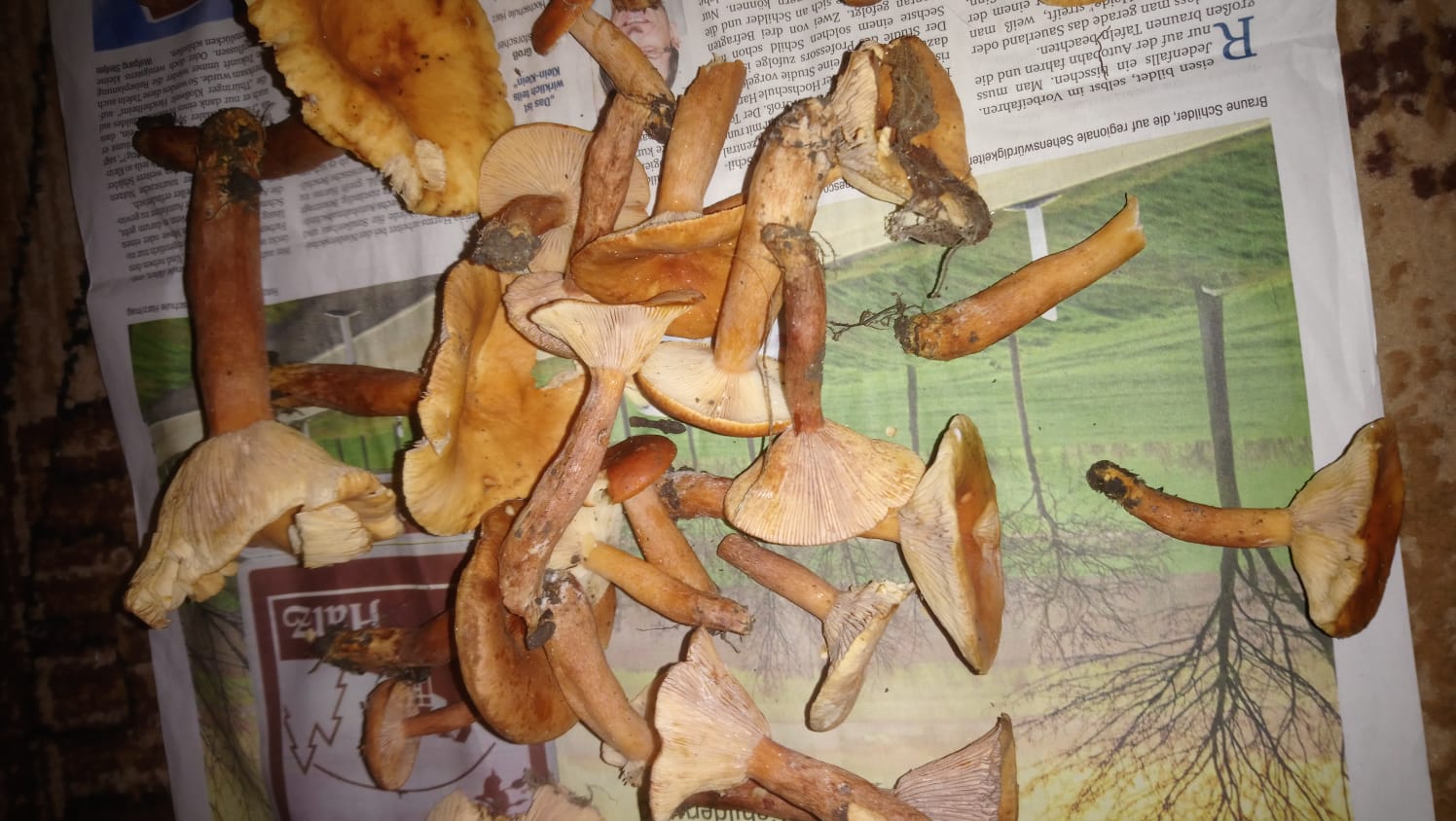 ich habe eine Frage zu deinem Beitrag: Wenn du doch gar nicht weißt, was du da gefunden hast (vllt. giftig!), warum entnimmst du dann 20 oder mehr Pilze einer Art aus der Natur? Zum Bestimmen reicht eine kleine Kollektion von 3-5 Fruchtkörpern verschiedenen Alters; ein Schnittbild und ein Detailbild der Fruchtschicht (hier Lamellen) wären auch ganz gut.