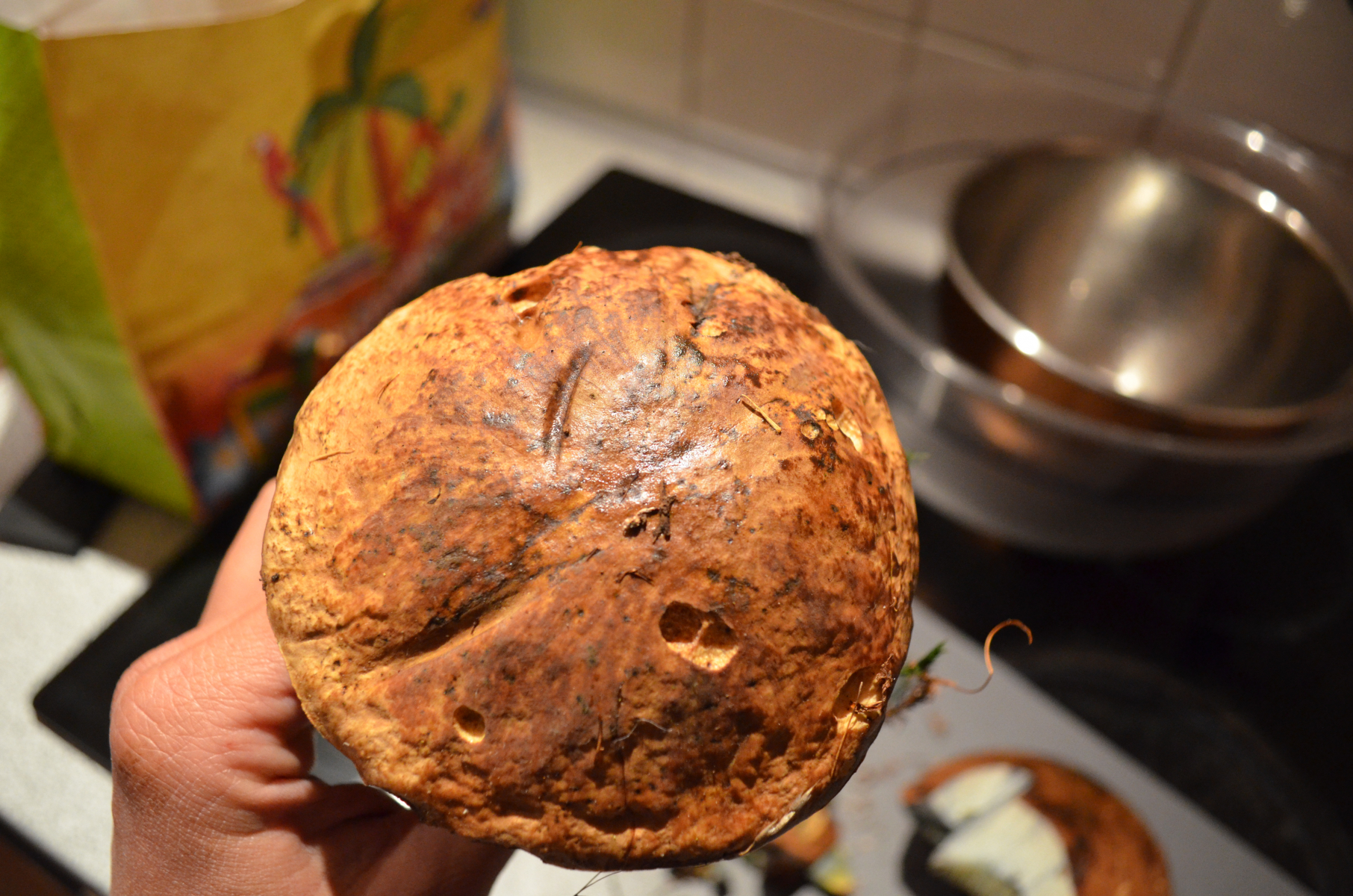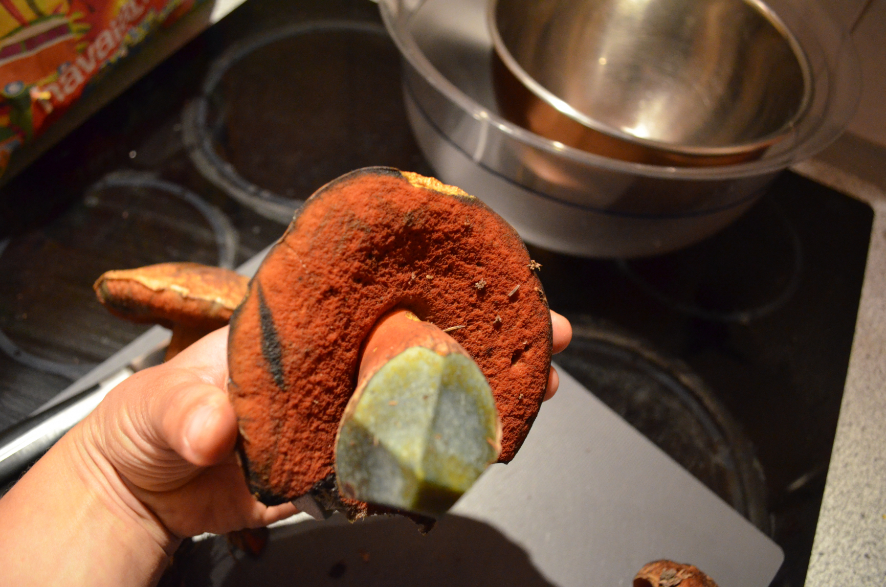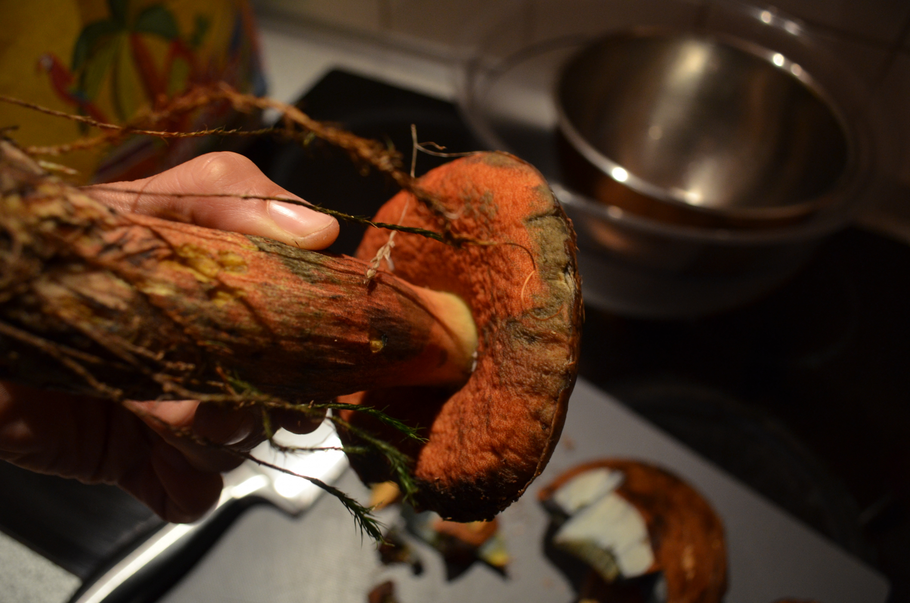 Dann haben wir noch einen Röhrenpilz gesammelt, bei dem wir uns unsicher sind bzgl. Hexenröhrling oder Satansröhrling. Nach Anschnitt hat sich der Pilz direkt dunkelblau verfäbt und hat einen relativ langen Stiel, was für einen Hexenröhrling spricht.