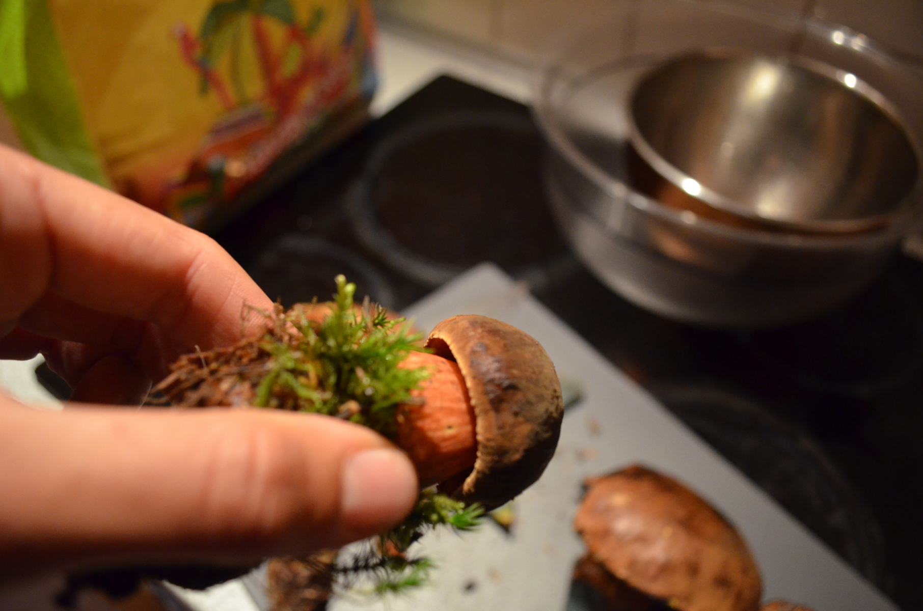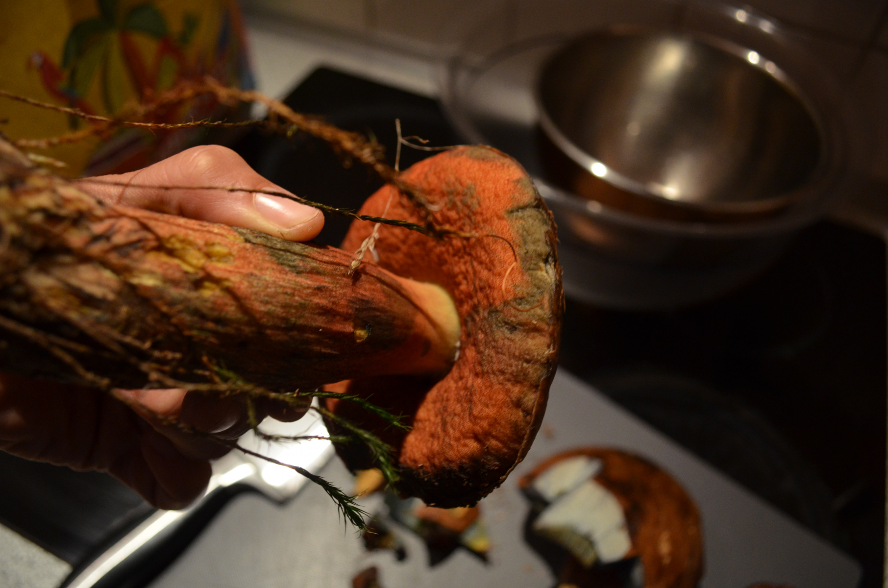 Dann haben wir noch einen Röhrenpilz gesammelt, bei dem wir uns unsicher sind bzgl. Hexenröhrling oder Satansröhrling. Nach Anschnitt hat sich der Pilz direkt dunkelblau verfäbt und hat einen relativ langen Stiel, was für einen Hexenröhrling spricht.