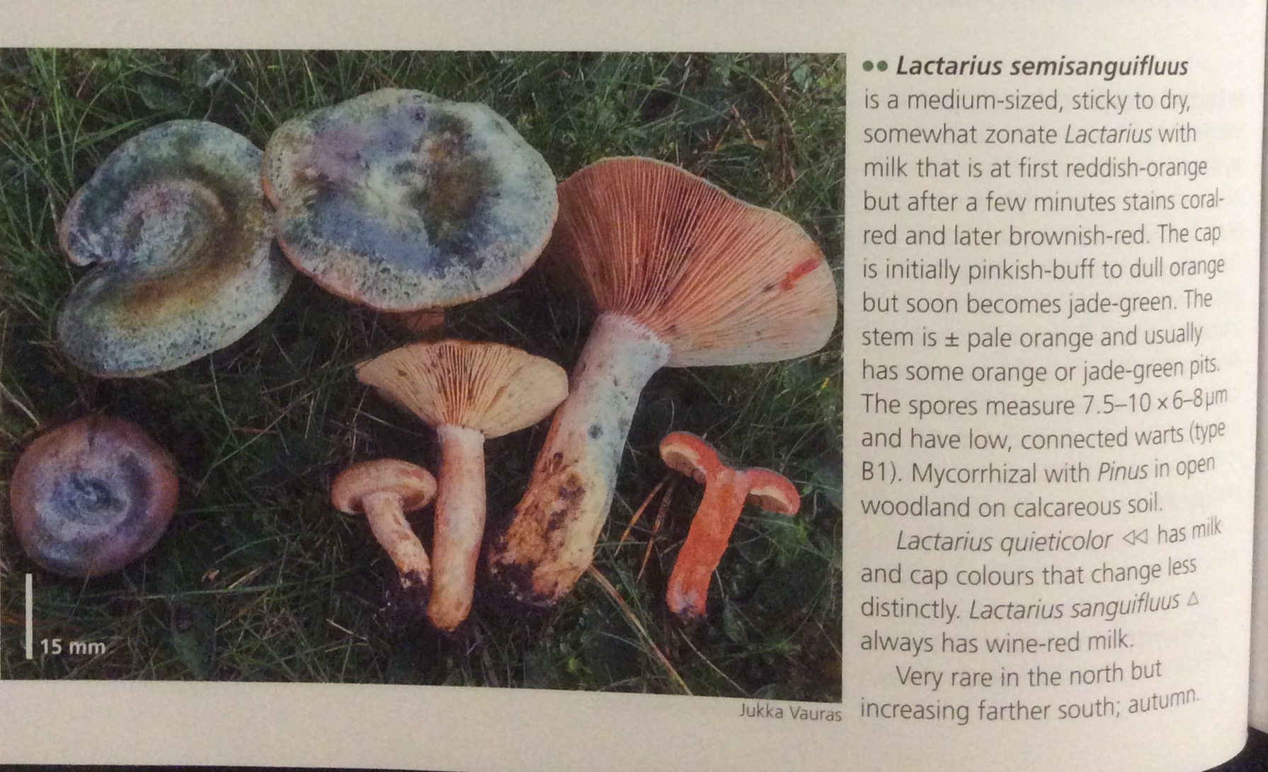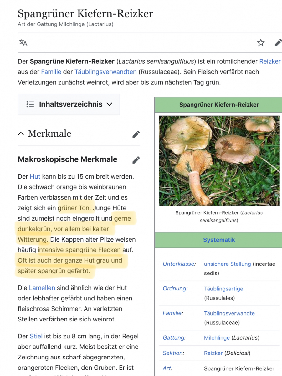 Der "Grüni-Pilz" hat mir jetzt auch keine Ruhe mehr gelassen. Wenn es nach den Beschreibungen geht, die ich gelesen habe (Bis jetzt in Wikipedia und "Fungi of temperate Europe"), dann trifft das Aussehen und die Verfärbungen auf einen (kältegeschädigten) Kiefern- (Spangrünen) Reizker (Lactarius semisanguifluus) zu, wie Alis und Stefan auch sagten. Beim Fichten-Reizker (L. deterrimus) ist auf den Bildern nicht so viel Grün zu sehen, und auch in den Beschreibungen nimmt es einen geringeren Stellenwert ein. Aber SO grün wie der, den Alis gezeigt hat, habe ich kein Bild gefunden...