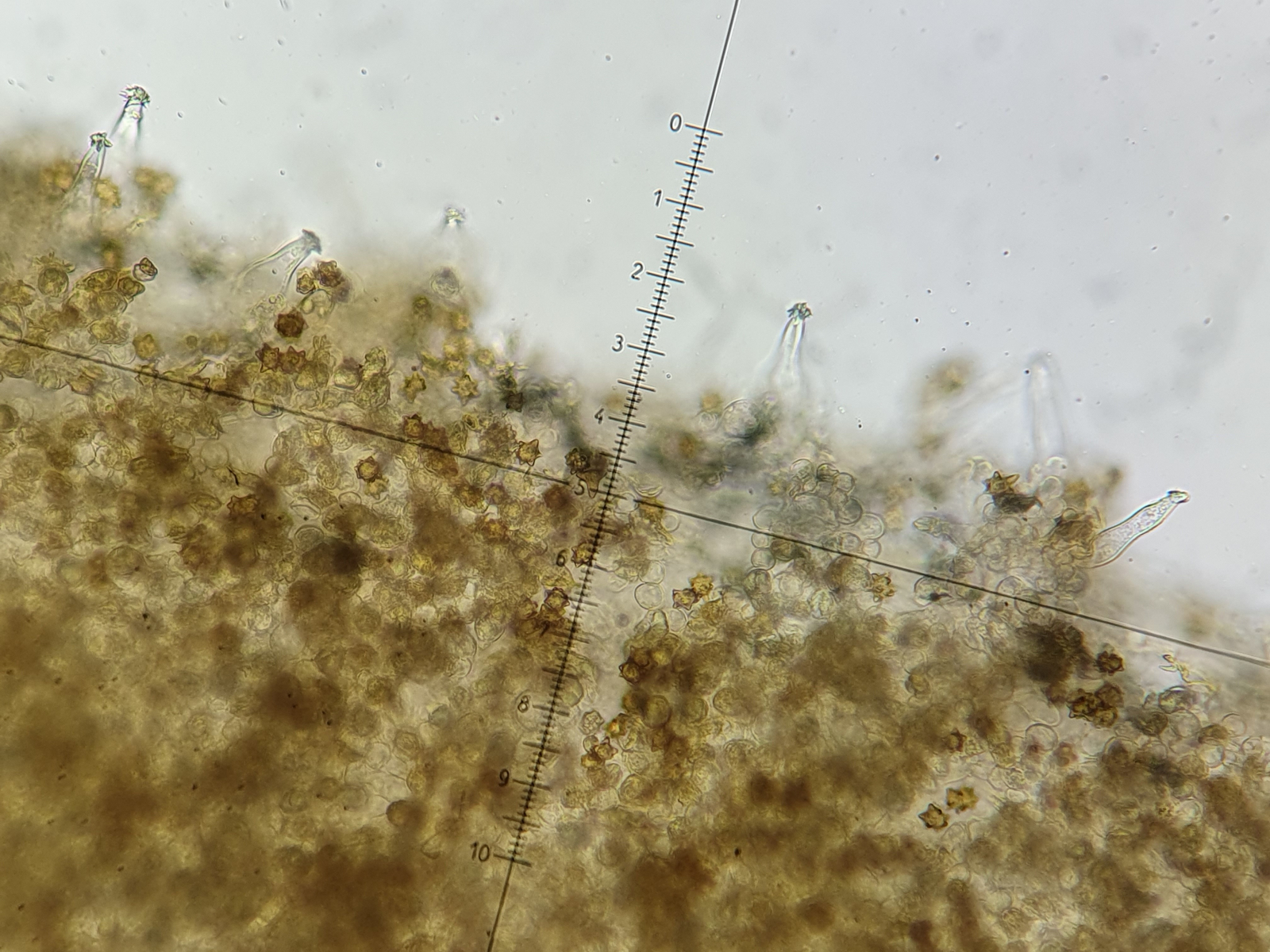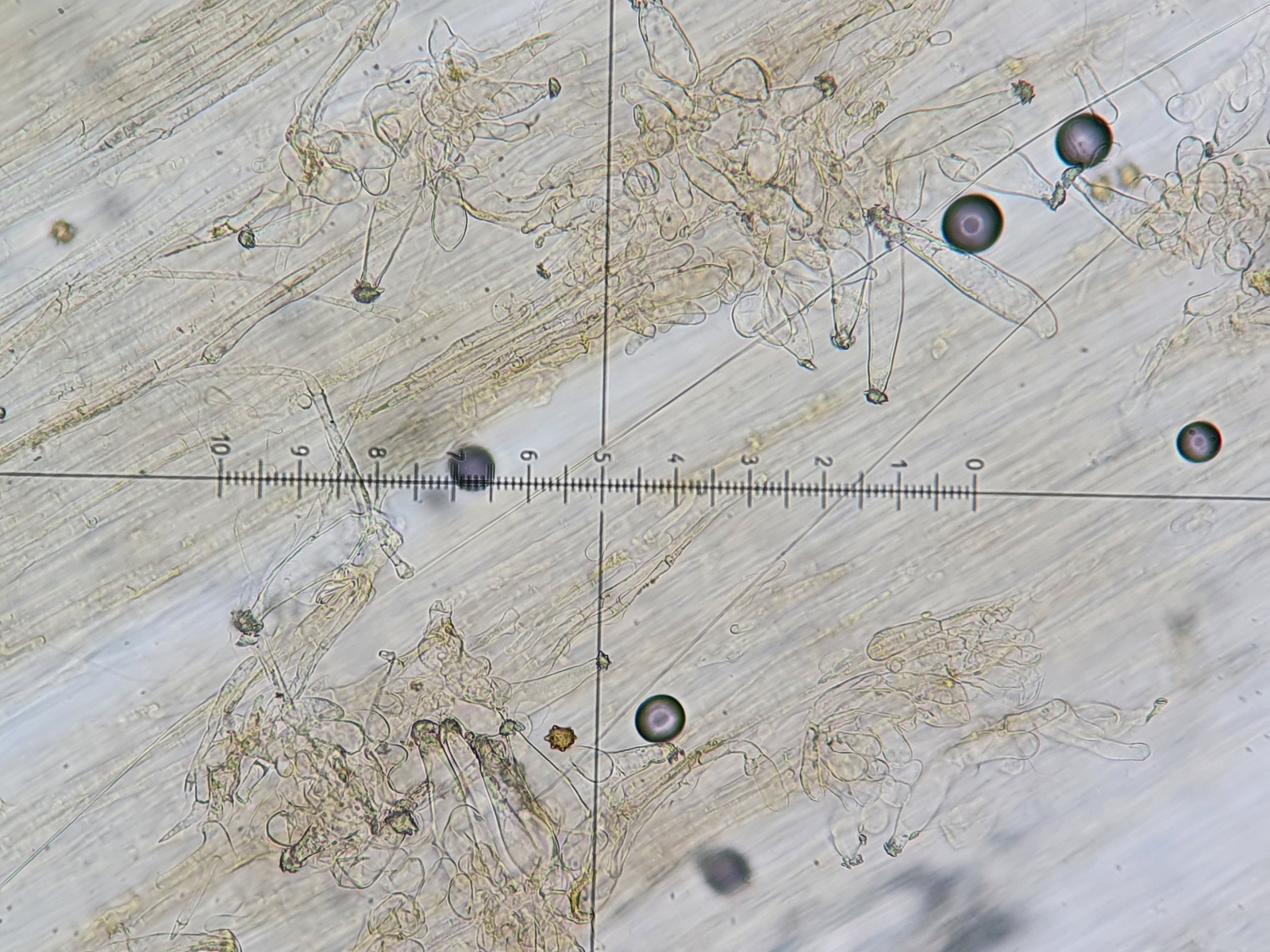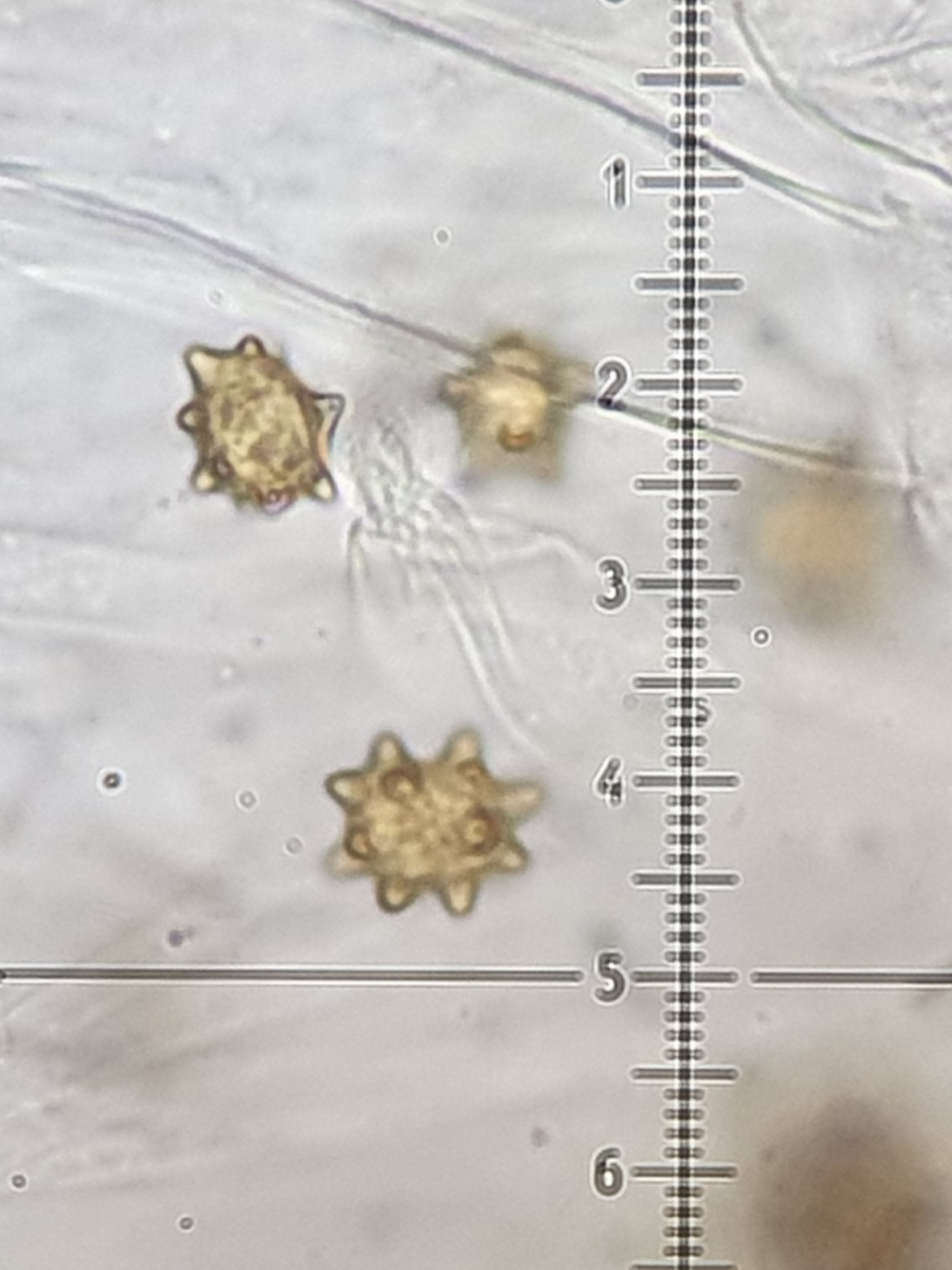 Dann wollte ich mal rausfinden was das Taschenmikroskop kann, was ich mir für wenig Geld bestellt hatte. Das ist schon toll finde ich. Man sieht die Zystiden (hier mal Kaulos) schon in ihrer Form mit Kristallschopf. Im Grunde fast 3D. Auch das die Sporen sternförmig sind kann man erahnen ...