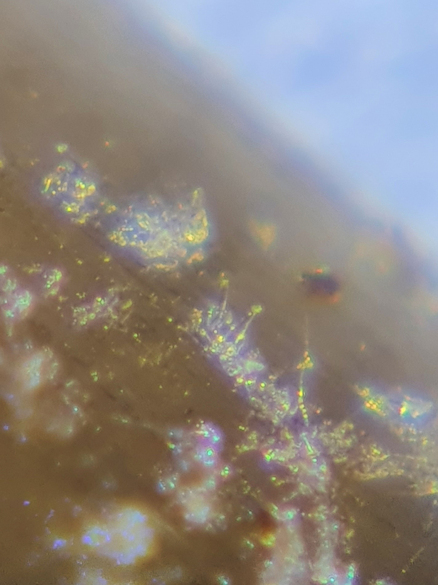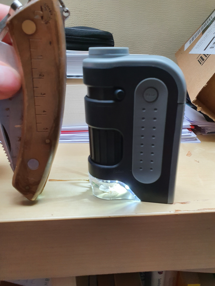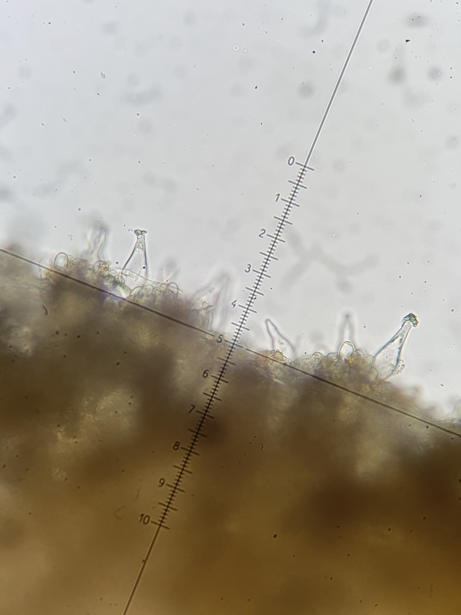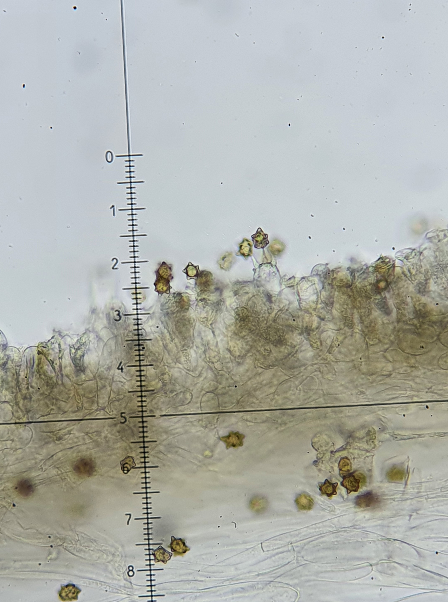 Dann wollte ich mal rausfinden was das Taschenmikroskop kann, was ich mir für wenig Geld bestellt hatte. Das ist schon toll finde ich. Man sieht die Zystiden (hier mal Kaulos) schon in ihrer Form mit Kristallschopf. Im Grunde fast 3D. Auch das die Sporen sternförmig sind kann man erahnen ...
