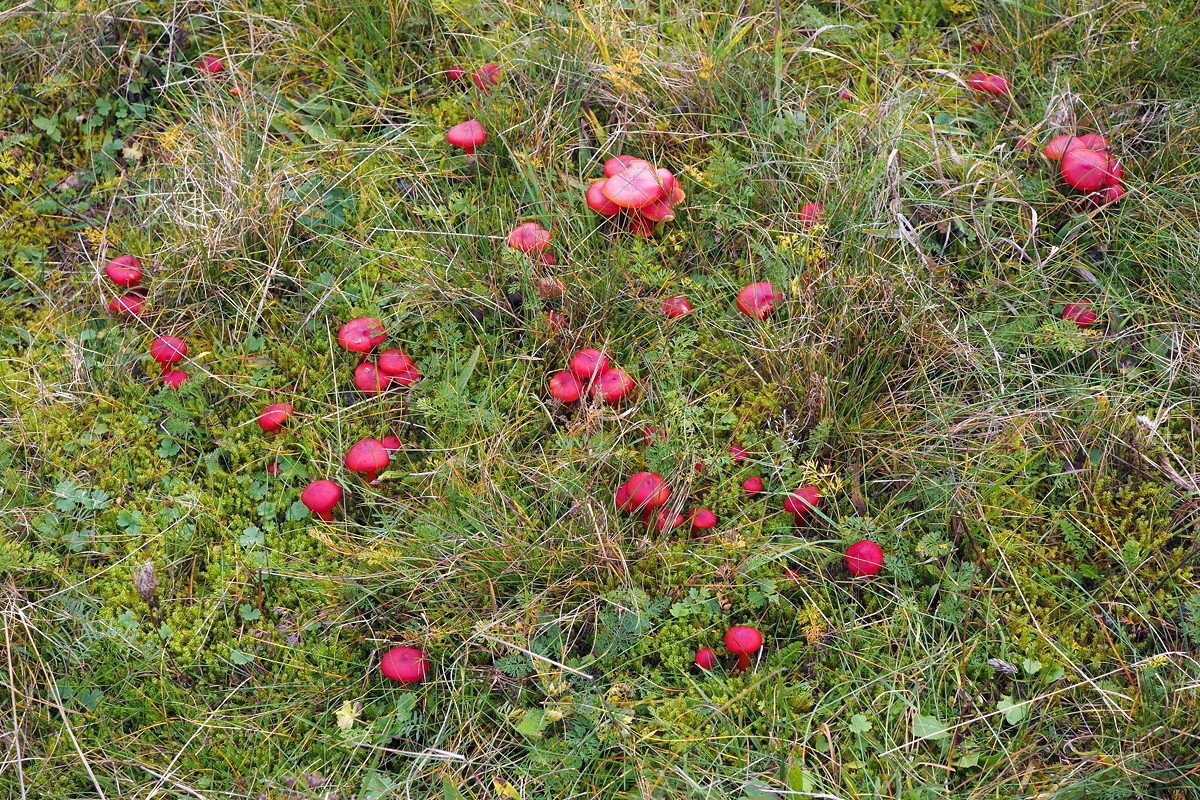 An geschützt gelegenen Nordhängen finden sich aktuell zwar etliche Arten, größere Gruppen oder Herden sind aber selten. Nach Süden, Westen oder Osten ausgerichtete Hanglagen, sowie die Kuppen und Hochflächen sind dagegen immer noch weitestgehend saftlingsfrei und ich befürchte, dass da auch nicht mehr viel kommt (der Sommer war einfach zu trocken).