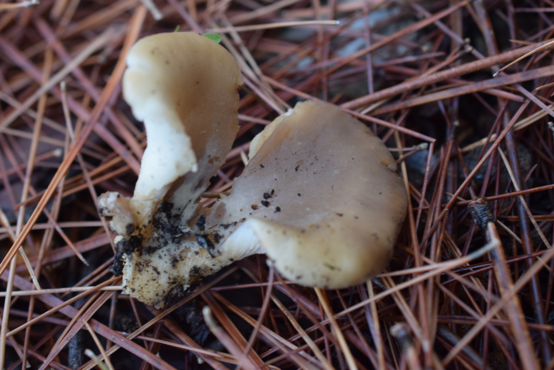 Ich bin vollkommen überfragt mit diesem Exemplar. Es scheint fast ungestielt zu sein, das Fleisch ist weiß, die Lamellen gelblich. Die FK sind nicht eben dünnfleischig. Die Huthaut ist cremefarben bis grau-bräunlich. Die Fruchtkörper riechen sehr würzig, Geschmack ist mild. Es zeigt sich an der Basis etwas violetter Myzelfilz. Ich bin ratlos, würde aber aufgrund des Habitus die Gattungen Panellus, Pleurotus, Lentinus, Lentinellus oder Hohenbuehelia vermuten? Wie komme ich hier weiter?