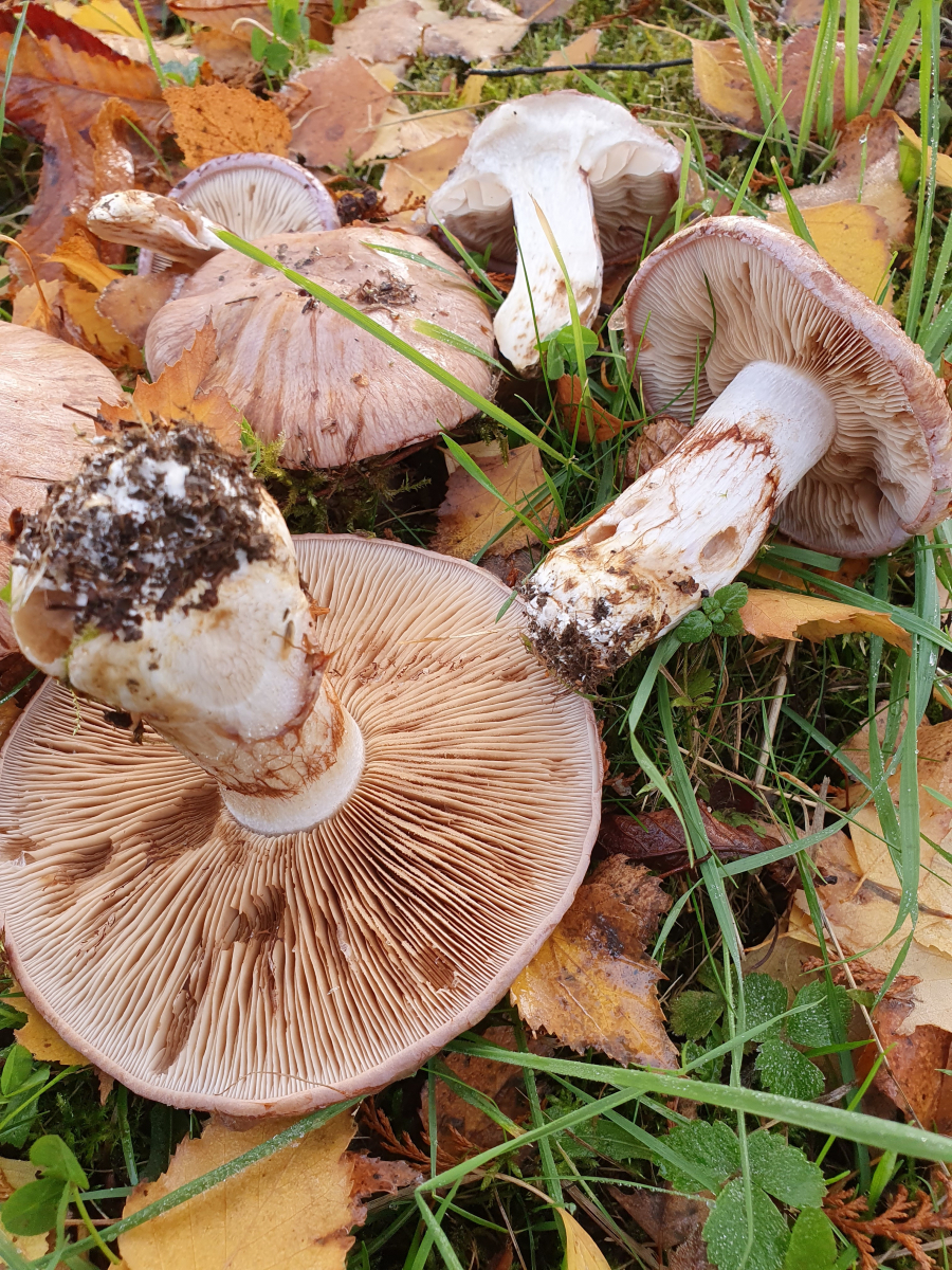 habe heute auf einem alten Judenfriedhof in der Nähe von Birke (entfernt auch Koniferen) einen großen Hexenring von Cortinarien offenbar aus der Sektion variecolores gefunden. Bin mir recht unschlüssig ob es sich um largus oder vielleicht balteatocumatilis handelt (oder noch etwas anderes).