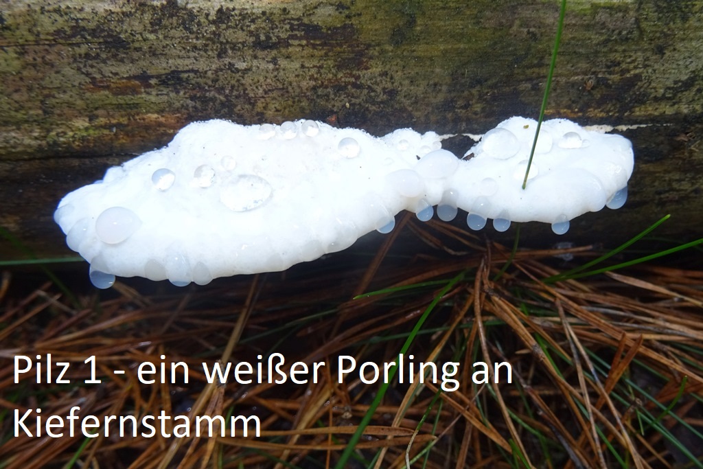 Pilz 1 ist ein weißer Porling an Kiefernstamm; kann gut ein Saftporling sein; da soll dann aber ein Experte was dazu sagen. Für mich sehen die alle gleich aus.