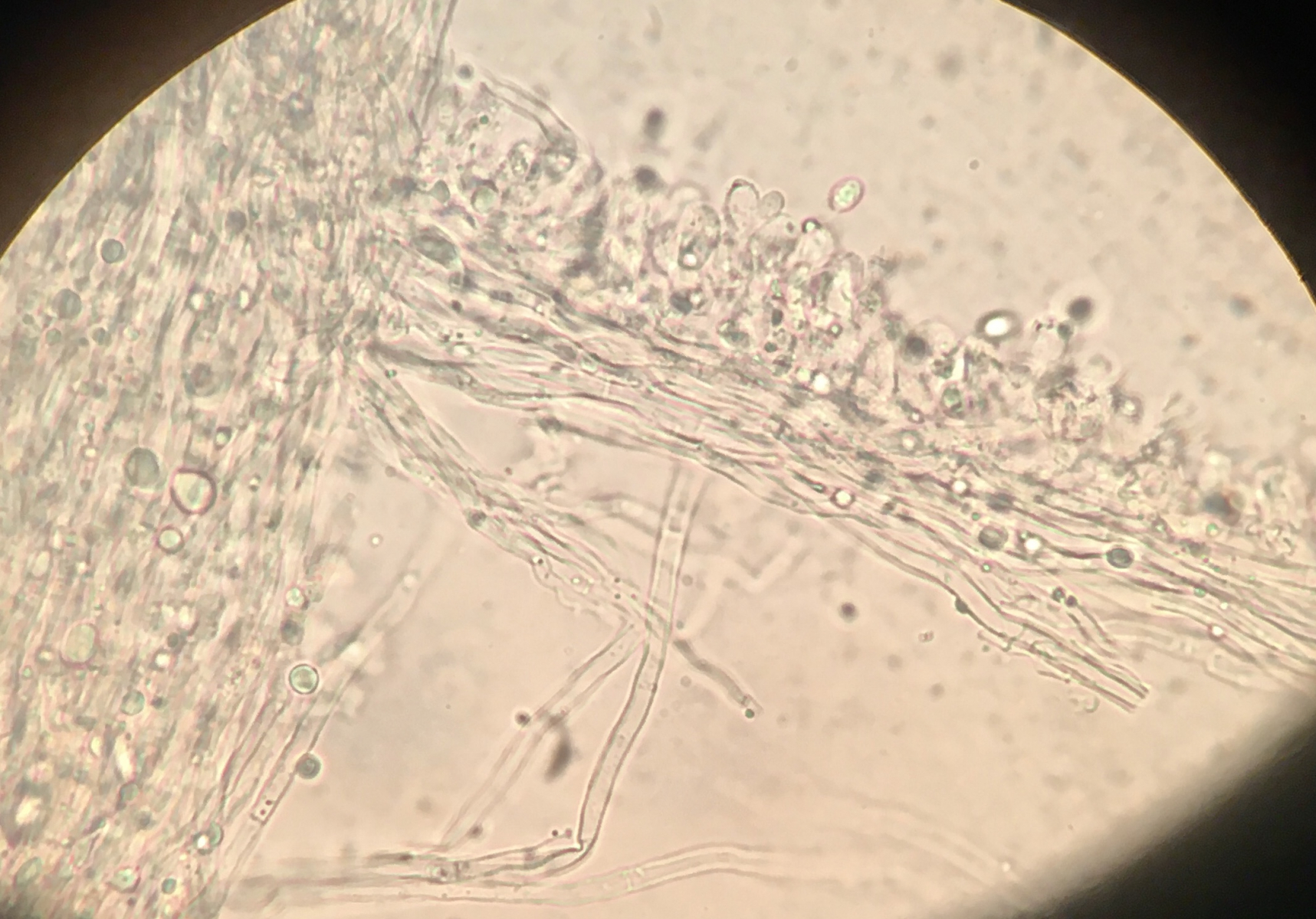 In den meisten Teilen des Fruchtkörpers sind auch bei latemarginatus die Hyphen eher dünn. Der Trick ist, die Hyphen aus der substratnahen Schicht des Sibikulums anzugucken, also möglichst von da zu entnehmen, wo der Fruchtkörper am Holz ansitzt. Das wäre die Stelle, wo man bei latemarginatus diese breiten Hyphen findet, wie oben gezeigt.