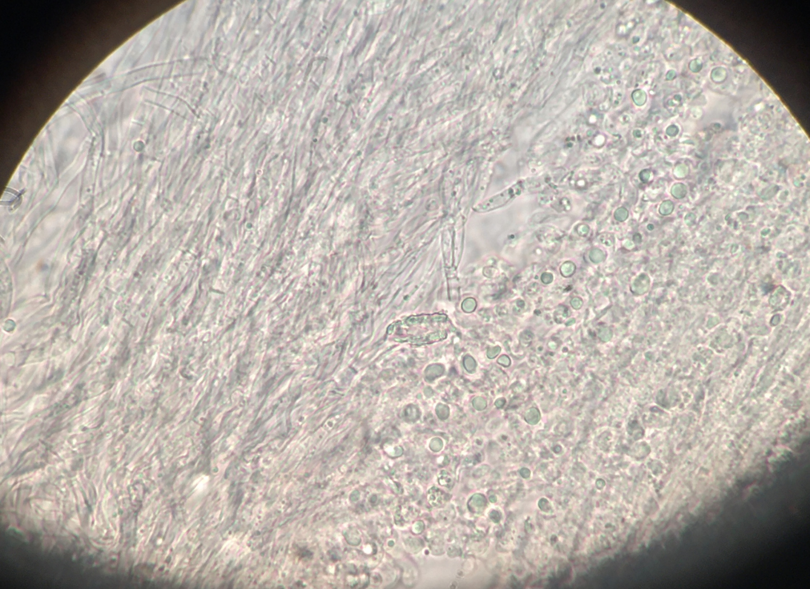Ich hab den Pilz grad mikroskopiert und er ist leider noch relativ unreif, aber ein paar Sporen fanden sich.