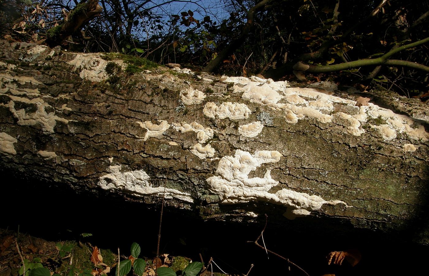 schon seit fast einem Jahr beobachte ich einen weißen Belag an einem Pappelstumpf im Prater, an dem früher Austernseitlinge wuchsen. Heute schien er endlich voll ausgeprägt zu sein und ich habe etwas mitgenommen, denn ich möchte wirklich gerne wissen, welcher Pilz sich da so langsam an diesem Stumpf entwickelt hat. Er hat sich auf Druck nicht verfärbt.