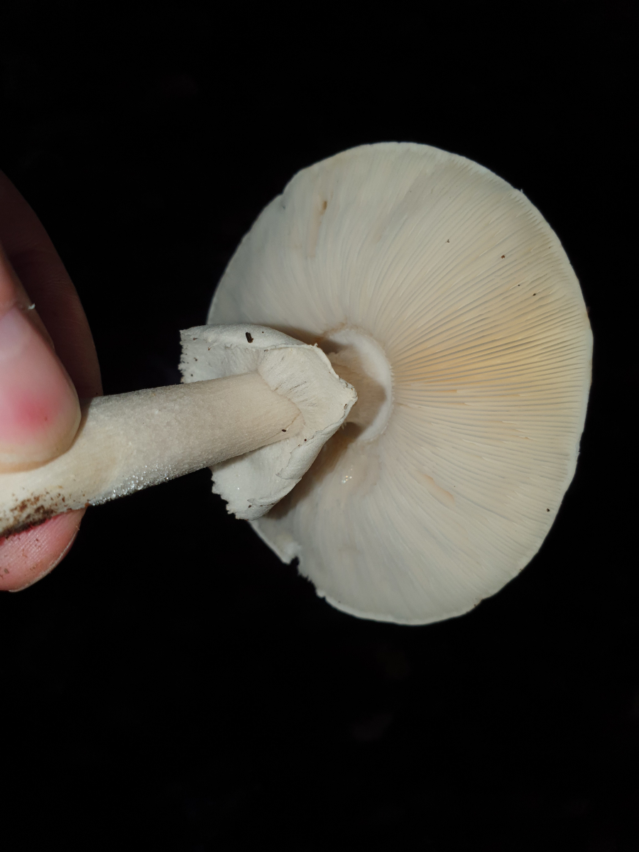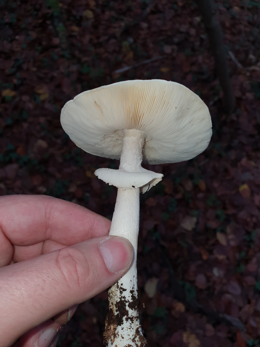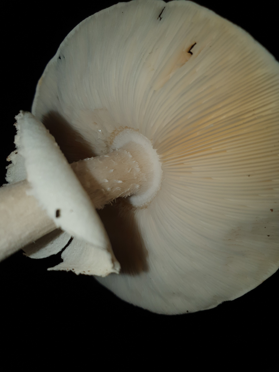 Die Lamellen sind frei mit deutlichem Abstand zum Stiel. Der Ring steht deutlich ab und wirkt recht stattlich. Die Knolle tief in der Erde, musste ich ausgraben.