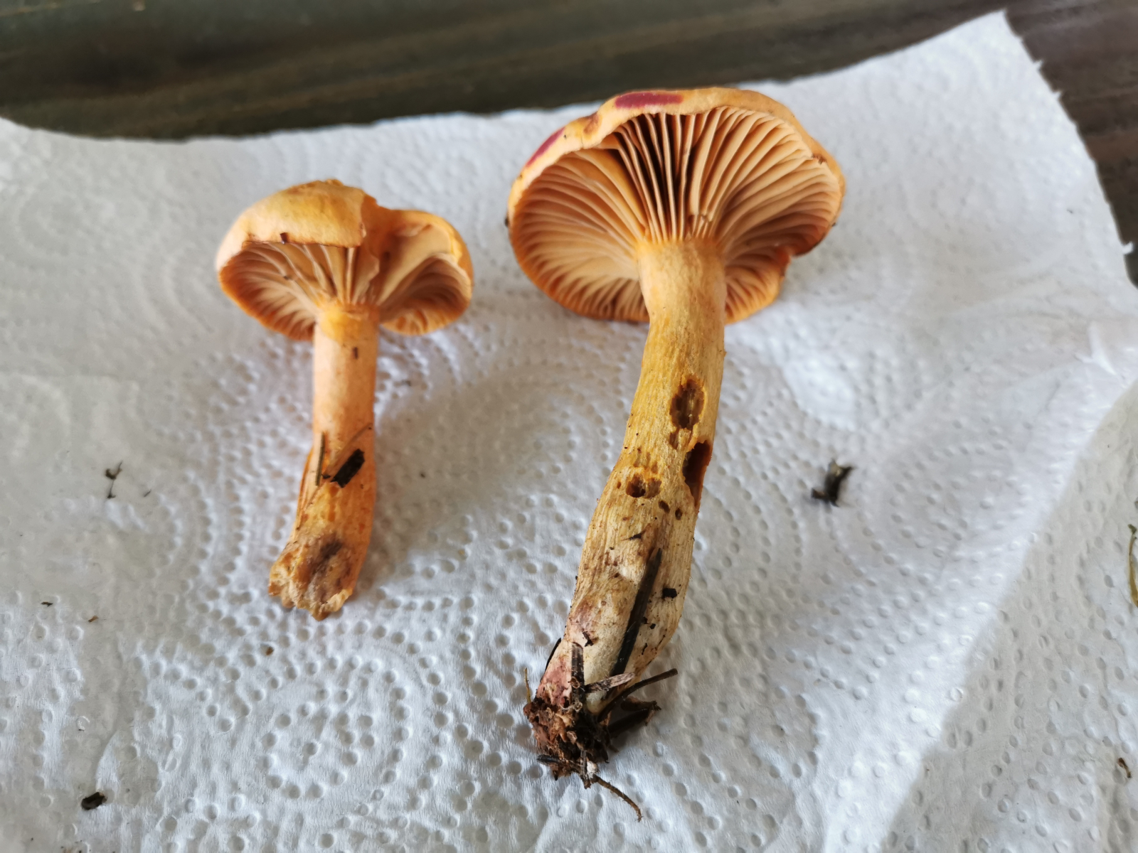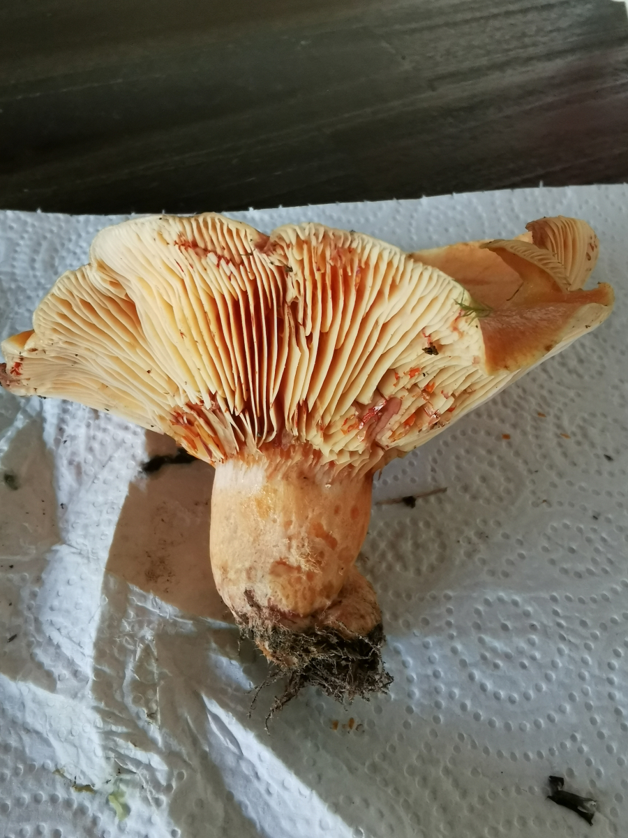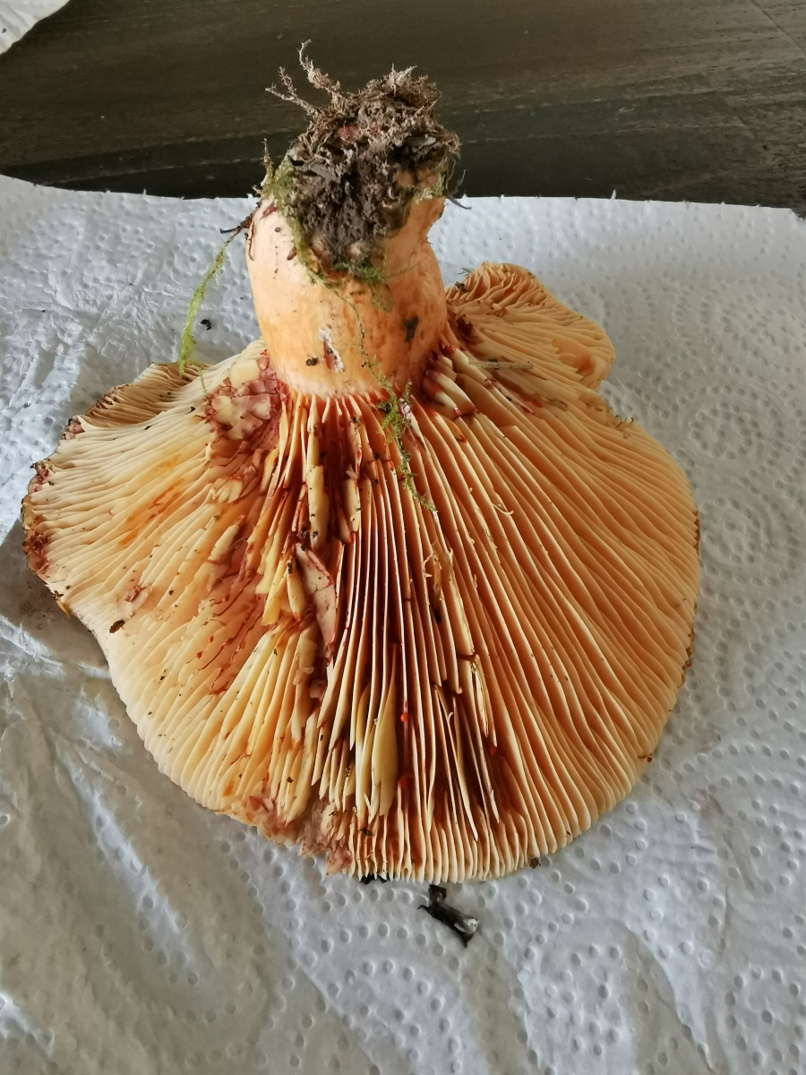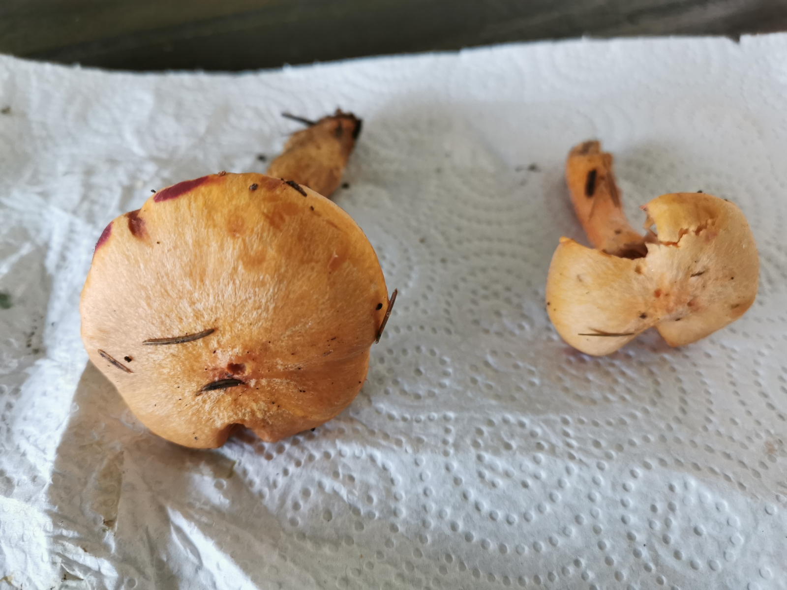 Bei dem Reizker sieht man an den Stellen, wo die Lamellen gesplittert sind, die weinroten verfärbungen (war vorher mal orange, hat aber beim liegen schon umgefärbt). Das sollte ein Würziger Tellerling nicht können. ![]()