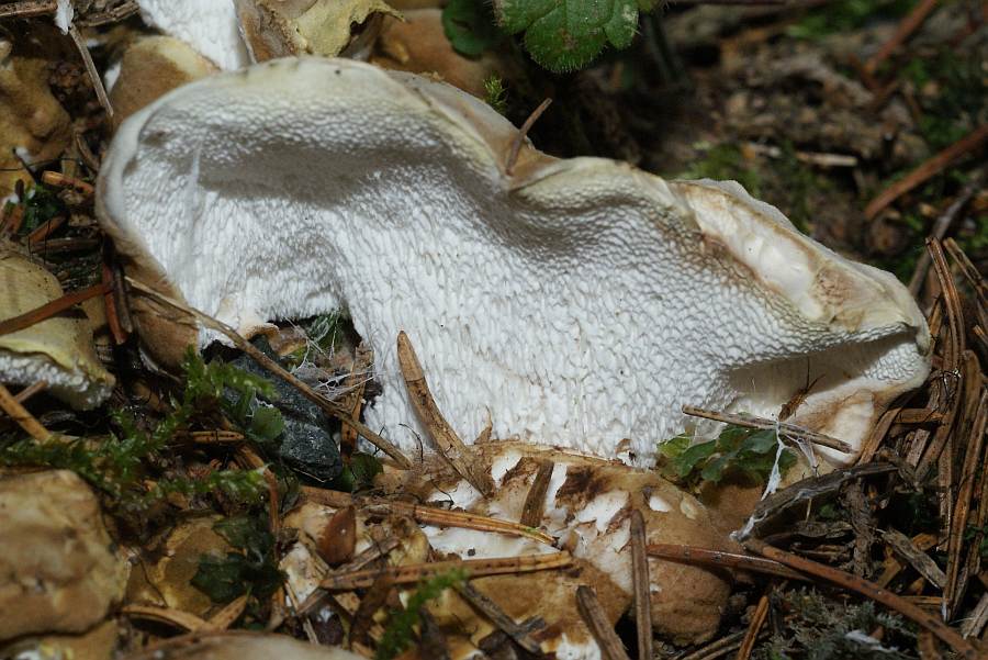 d) Albatrellus ovinus (Schafporling), der ebenfalls in vielen Aspekten übereinstimmt, dessen junge Fruchtkörper auf der Hutoberfläche reinweiß sein sollen und somit ebenfalls ausscheiden.