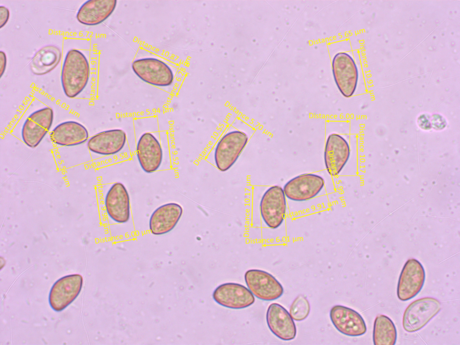 Sporen: 9.5-11 x 5.5-6.5 µm, einzelne auch bis 12 µm. Mittelwerte: 10.4x6 µm, Q = 1.6-1.93, QAvg = 1.73