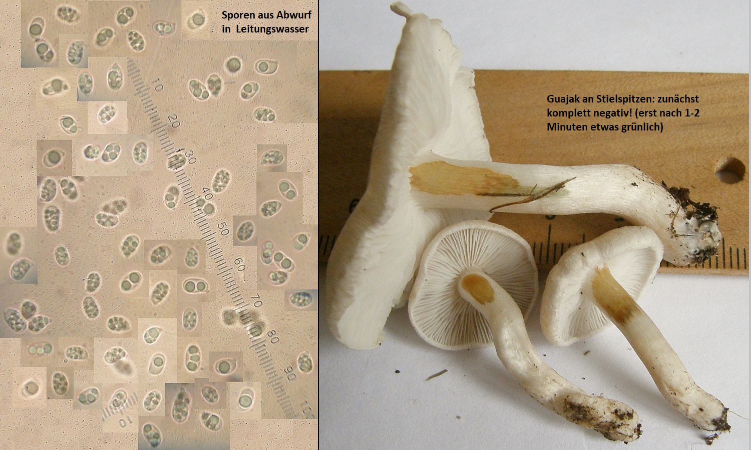 Mehlgeruch, kombiniert mit winzigen Sporen (selten länger als 5 µm) und den praktisch weissen Lamellen.