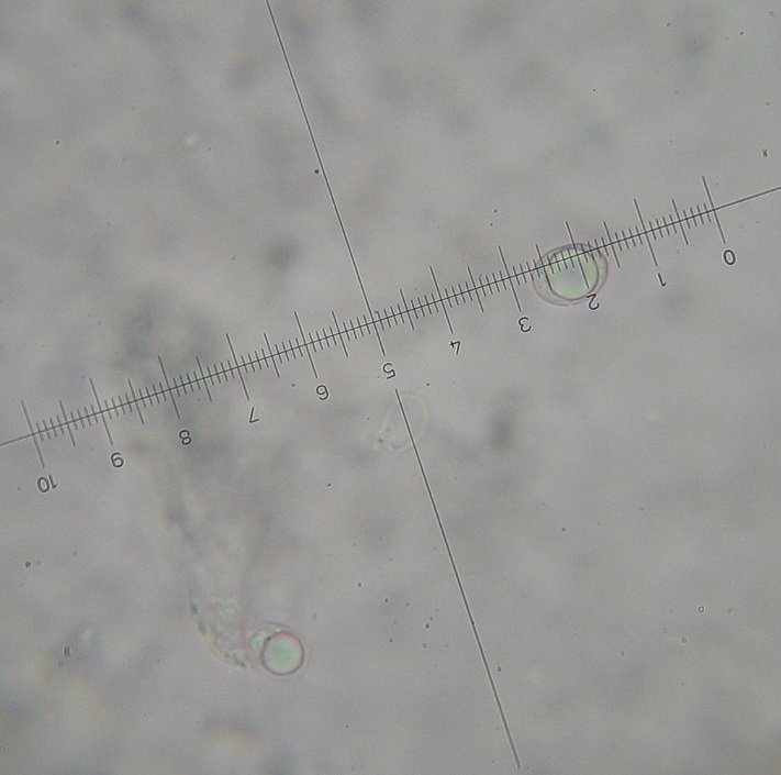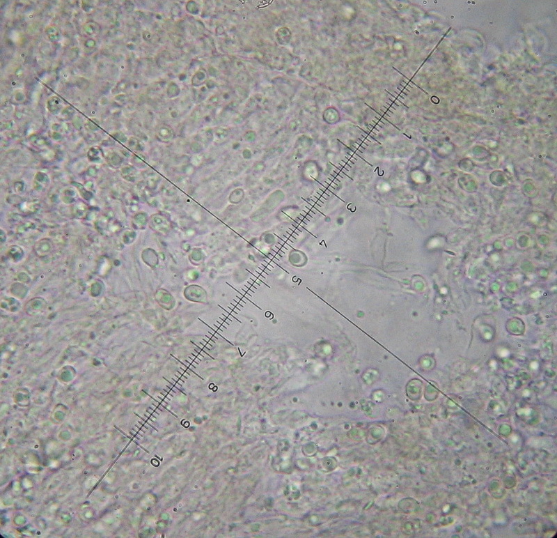 Nr. 5: Mit den kleinen Sporen kann das nur eine Ramariopsis sein und ich hätte jetzt auch auf Ramariopsis tenuiramosa getippt, die bei freiem Stand die gleiche braune Färbung annimmt wie die deutlich größere Clavulinopsis umbrinella ( letztere hätte aber deutlich größere Sporen, die denen von Clavulinopsis corniculata sehr ähnlich sind). Anbei das Foto einer von mir als Ramariopsis tenuiramosa (hoffentlich richtig) bestimmten Wiesenkeule, sowie ein Mikrofoto der Sporen bei 1000facher Vergrößerung (da lässt sich das Ornament bzw. da lassen sich die Stacheln erkennen)