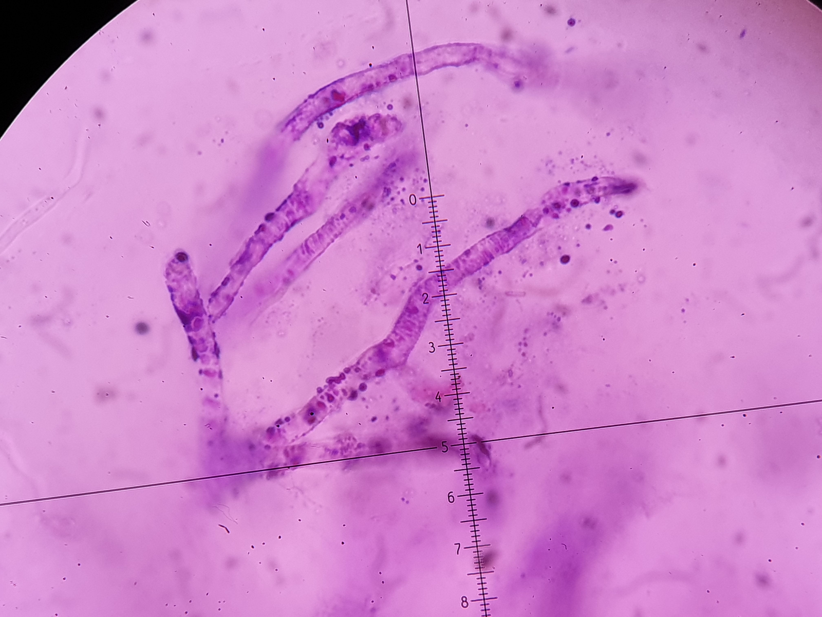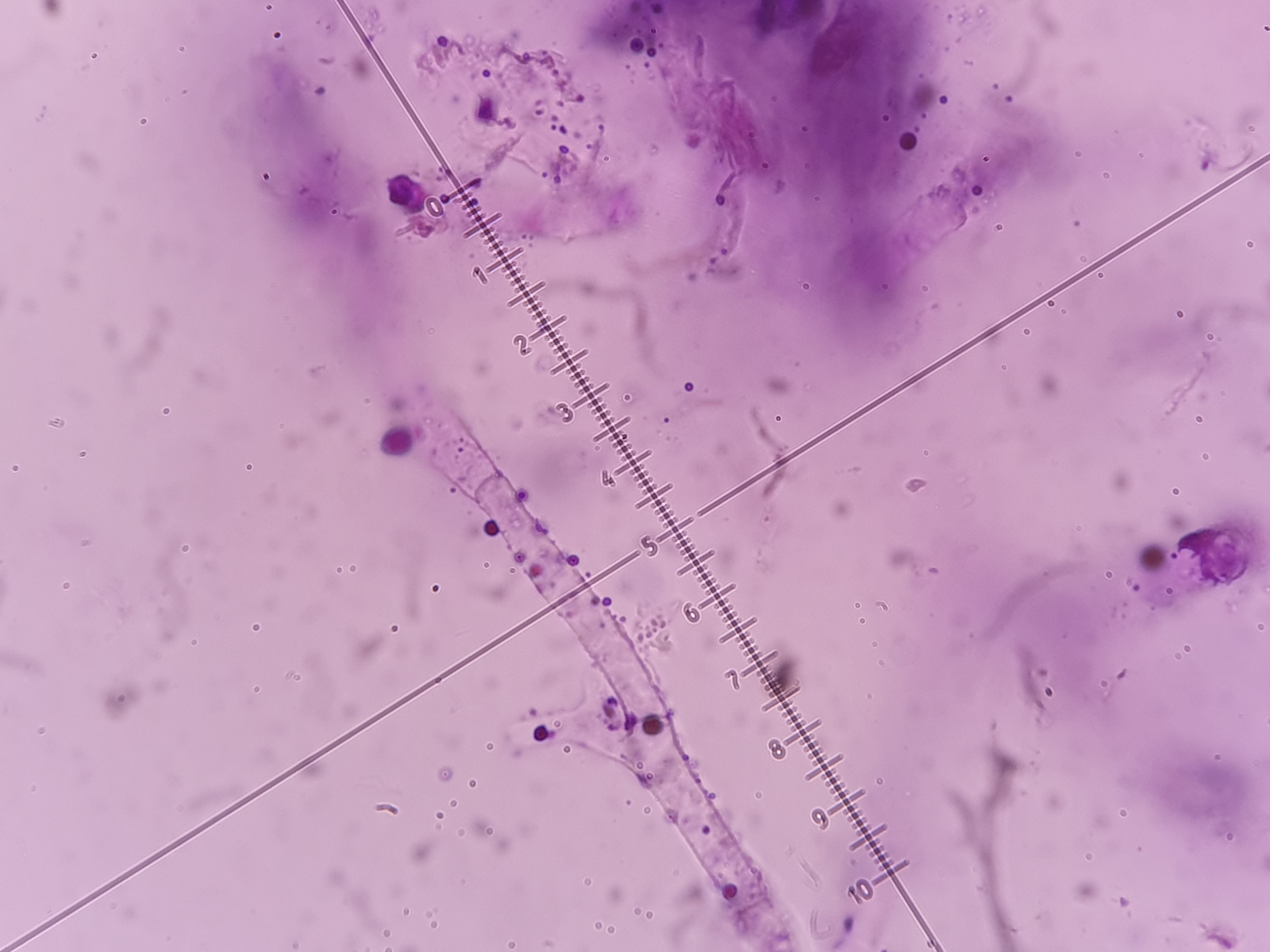 Inkrustierte Primordialhyphen, septiert (unterschiedlich lang), keine Pileos.