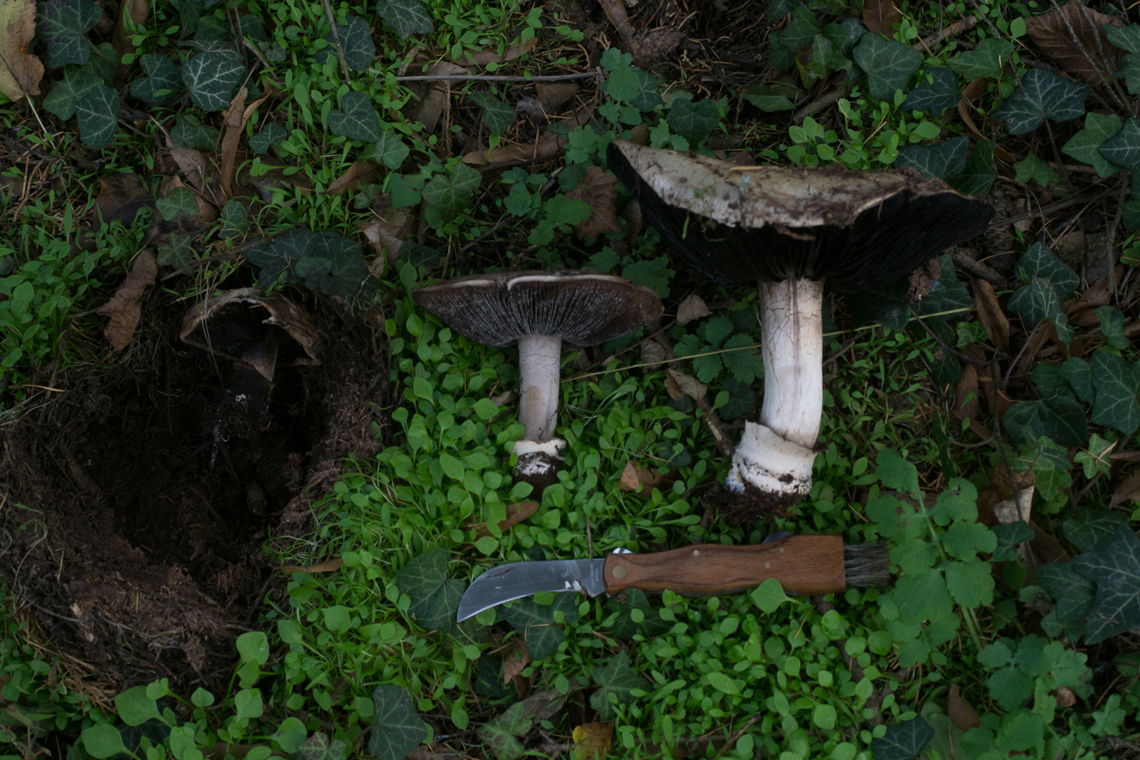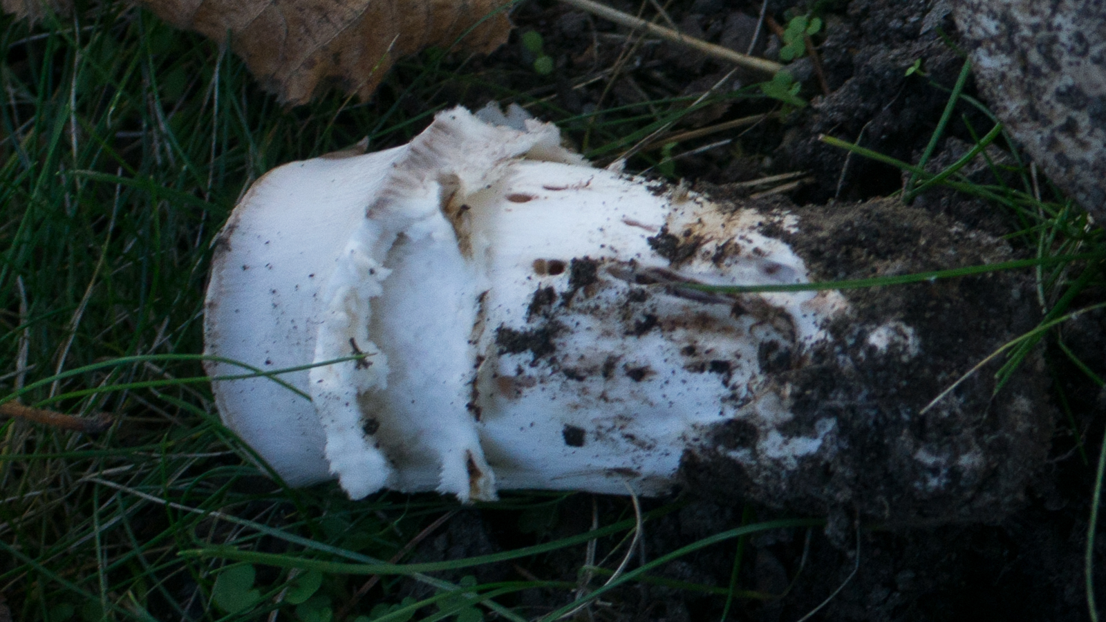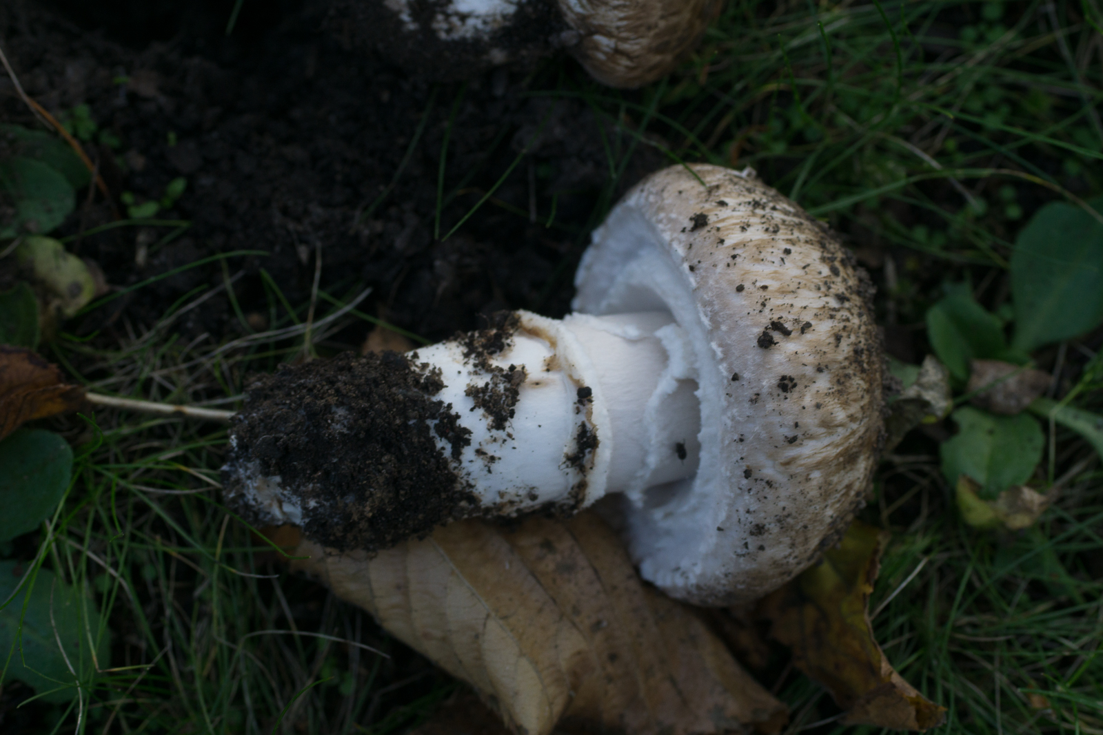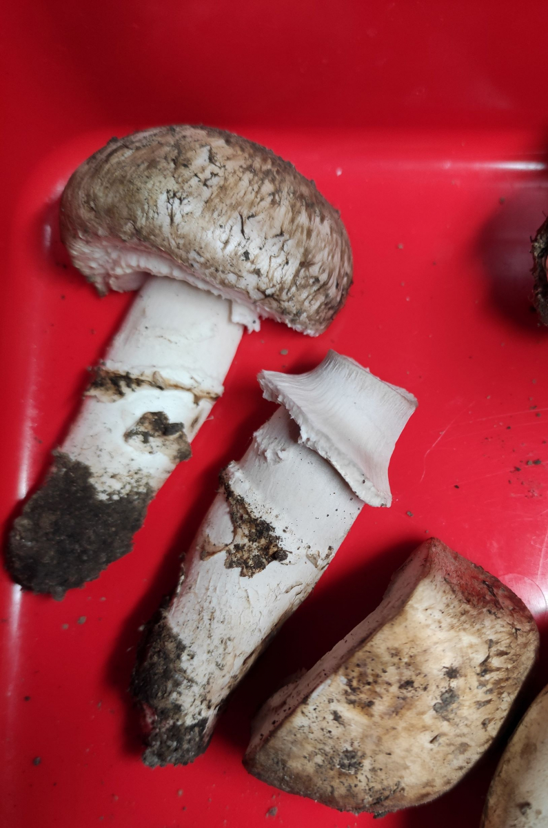 Pilz 2 ist noch größer. Extrem festfleischig und schwer(!). Doppelter (bzw. sogar fast dreifacher...) Ring. Rötend im Schnitt. Angenehm pilziger, leicht süßlicher Geruch.