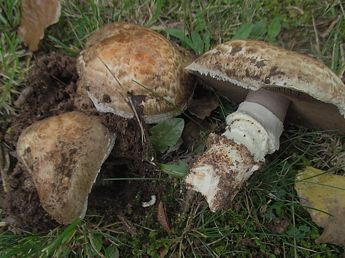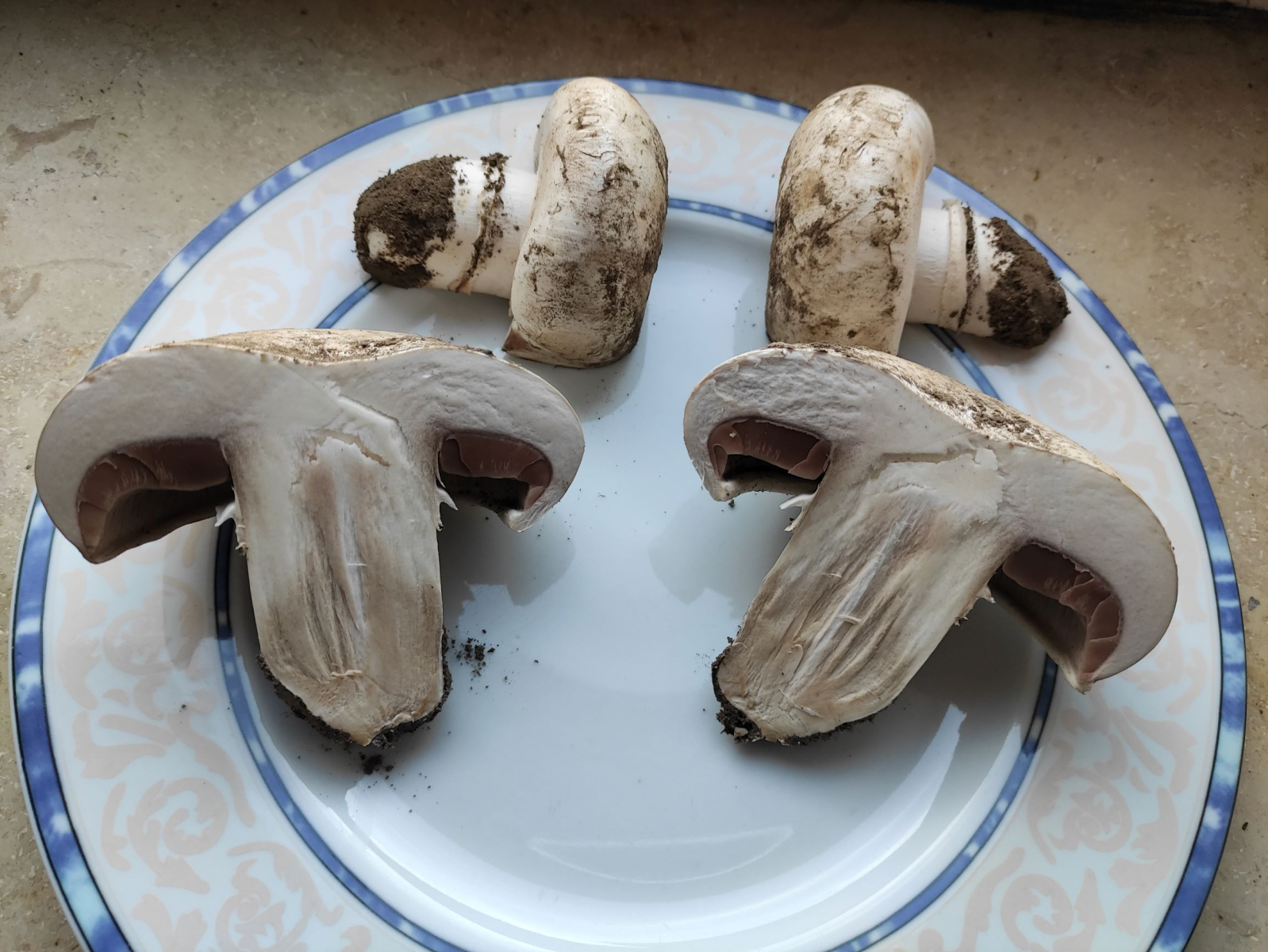 Ich würde daher hier Agaricus subperonatus vermuten? Die beiden großen Exemplare waren bereits gepflückt, die "kleineren" habe ich frisch entnommen.