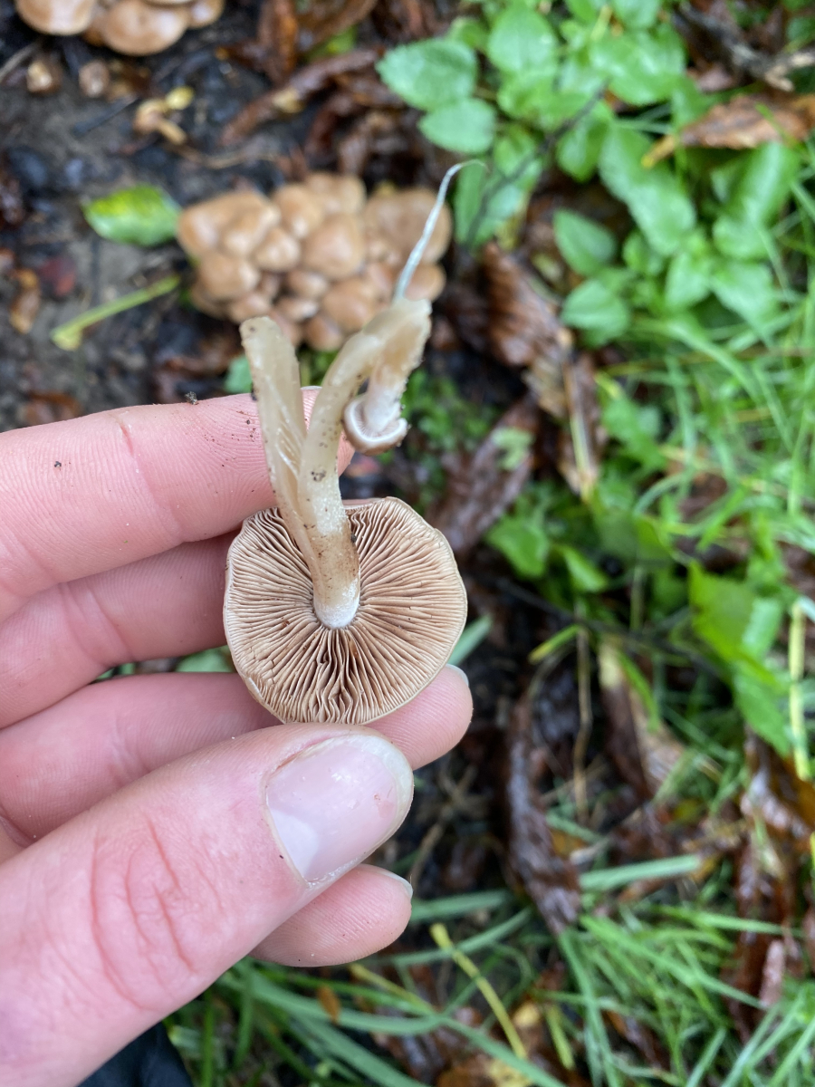 Deine Pilze sehen schon etwas geschädigt (Frost?) aus. Deshalb gibts hier nur eine Vermutung in Richtung Psathyrella (Faserling-Mürbling).