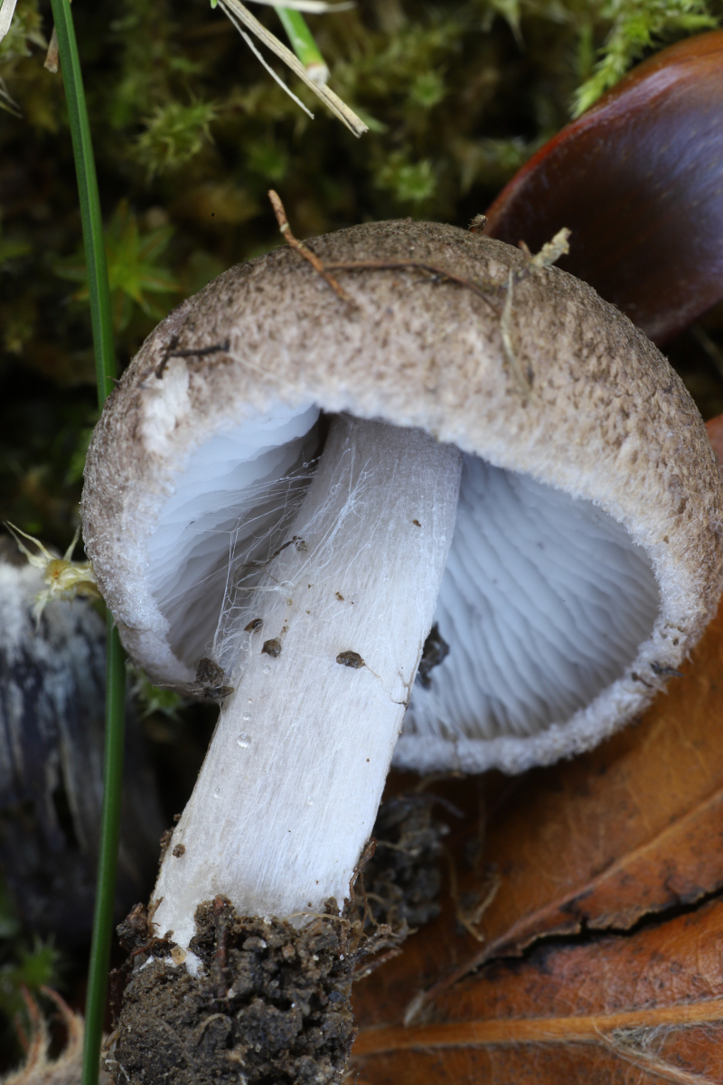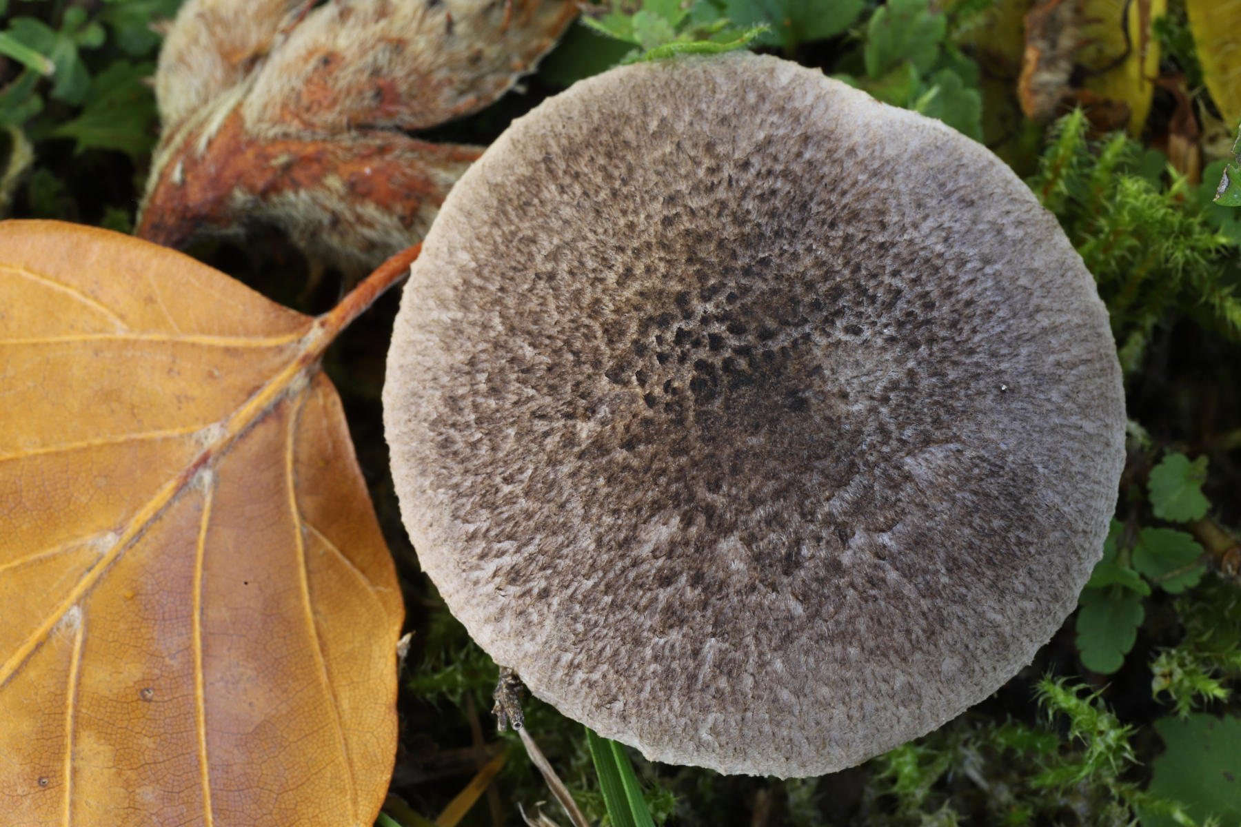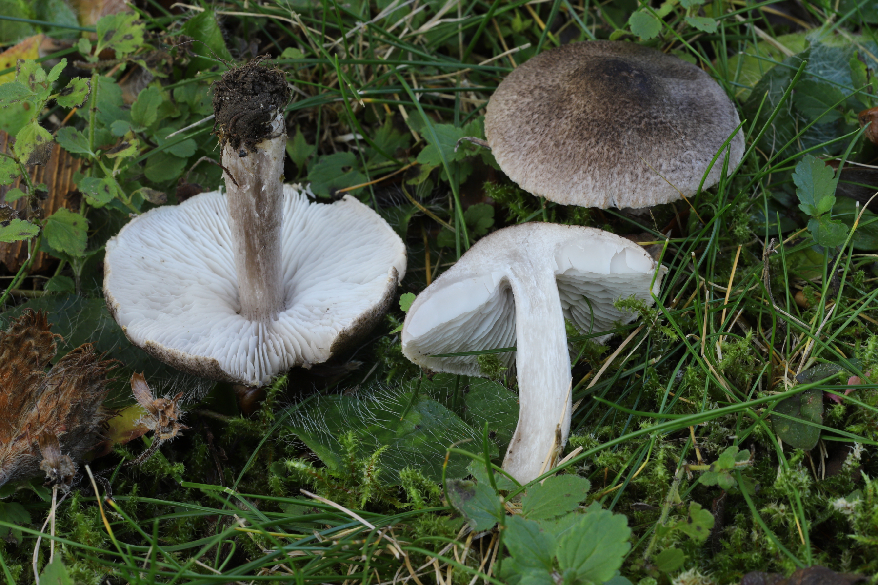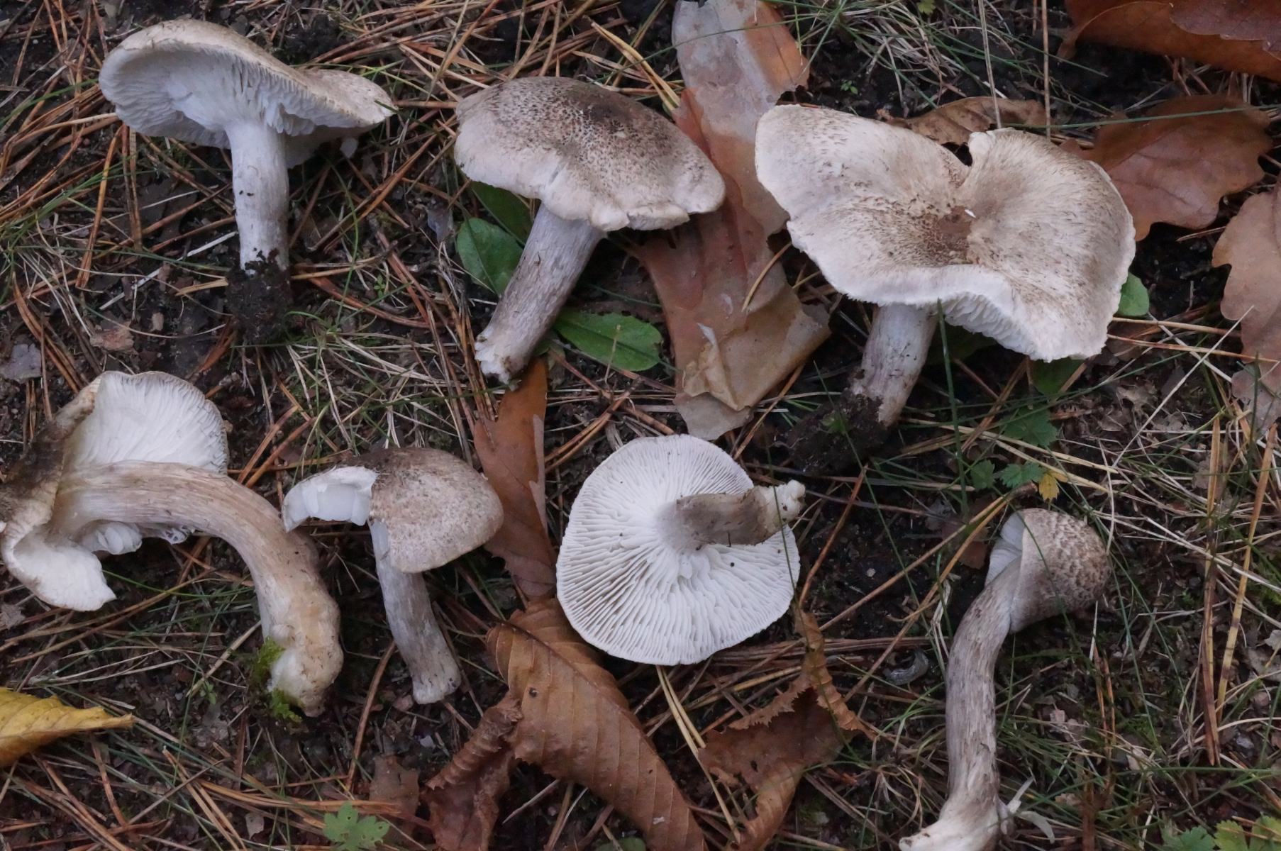 2. Kuriosum als Bestimmungsanfrage an diesem Tag. Es handelt sich um einen Erdritterling aus der gilbenden Fraktion. Cortina vorhanden, zumindest verletzt deutlicher Mehlgeruch und -geschmack; mild. Gefunden in einem Krankenhauspark. Vermuteter Mykorrhizapartner ist Castanea sativa. Die FK standen alle um den Baum herum. Das einzige, was mich stört ist der graue Stiel, den ich nie bei den Gilbenden Erdritterlingen bisher hatte. Aufgrund der Cortina bleibt nur Tr. argyraceum übrig, aber darf der einen grauen Stiel haben?