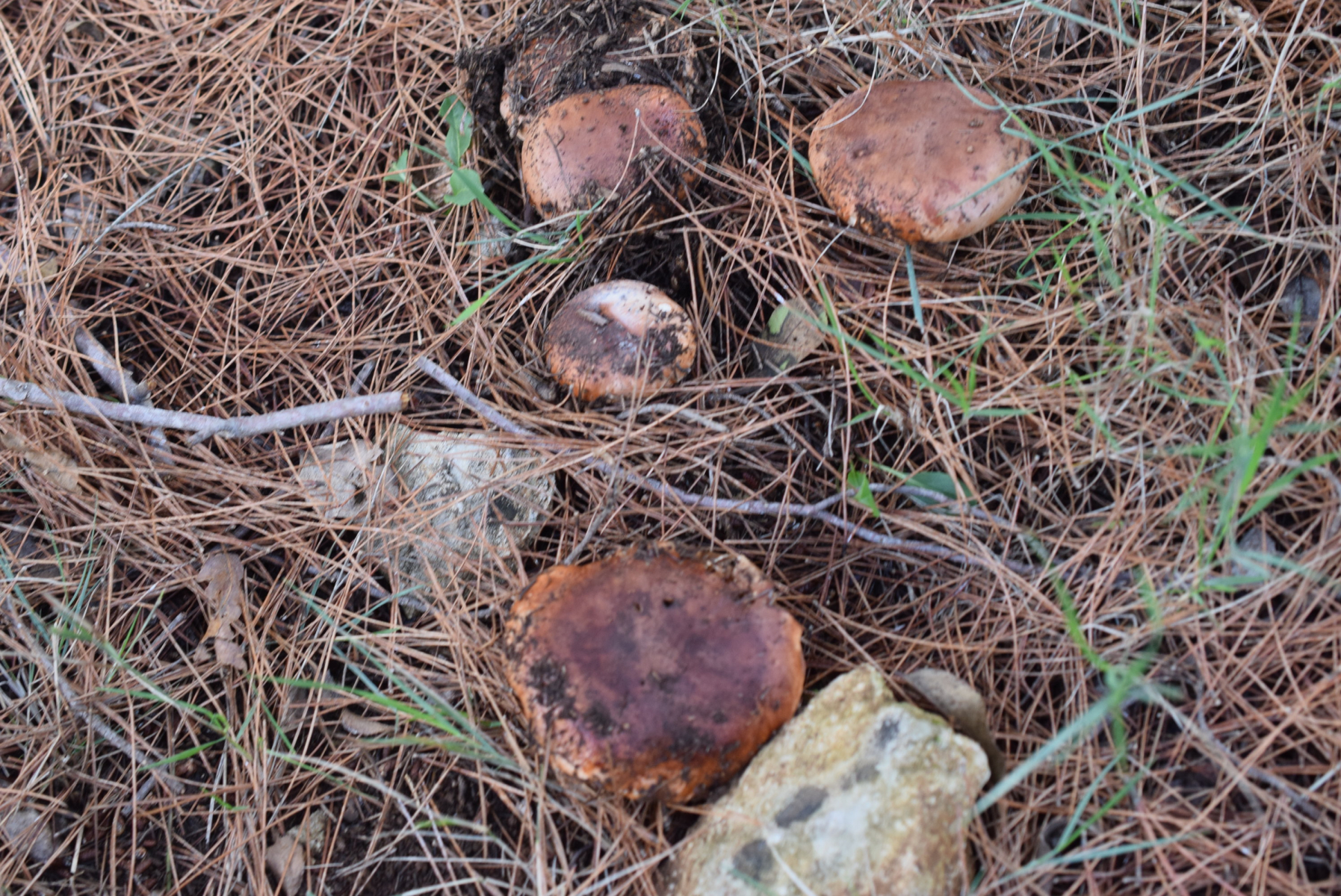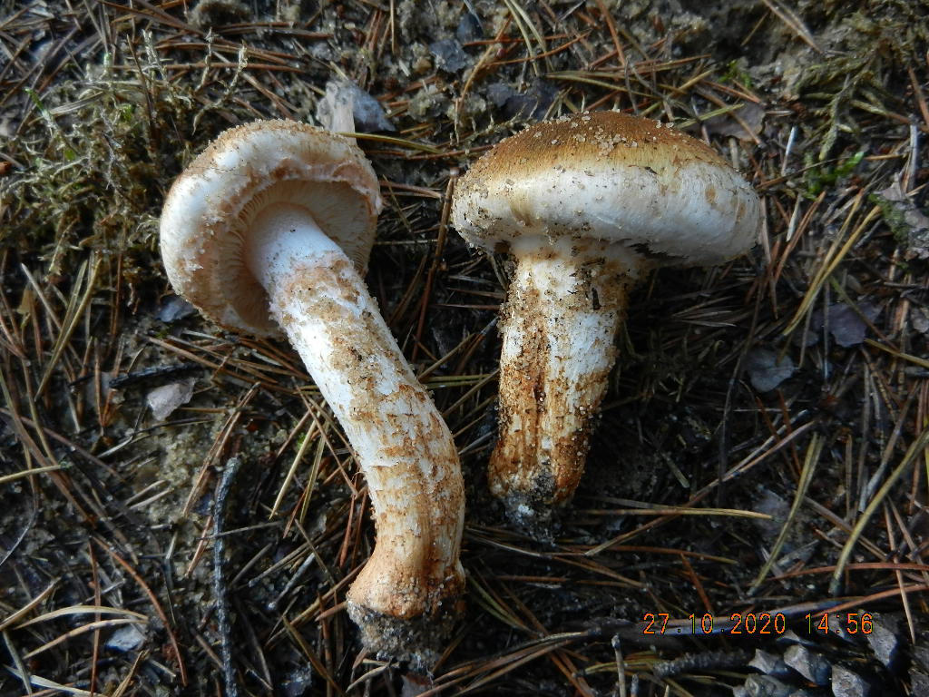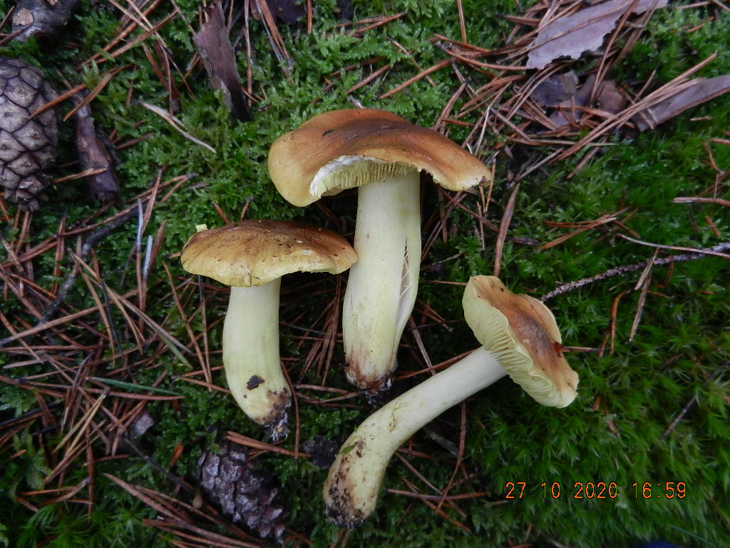 Hier eine Kollektion der frei und epigäisch herumstehenden, sauberen mit den rotbraunen, feinschuppigen Hüten, entgegen FNE4 eindeutig unter Kiefer stehend (Trich. frondosae):