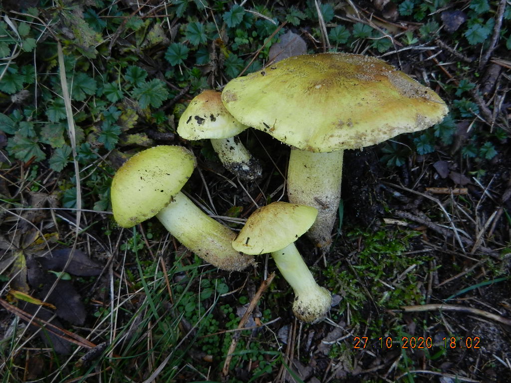 Und eine Kollektion Grüngelber mit ausgesprochen dunkler, schwarz überfaserter Hutmitte und gelblich getönten Lamellen hin zum Hutrand. Nachdem FNE 4 Trich. sejunctum als Pilz aus dem basischen Laubwald kennzeichnet, bleibt dann für diesen Fund als Artname T. viridilutescens übrig: