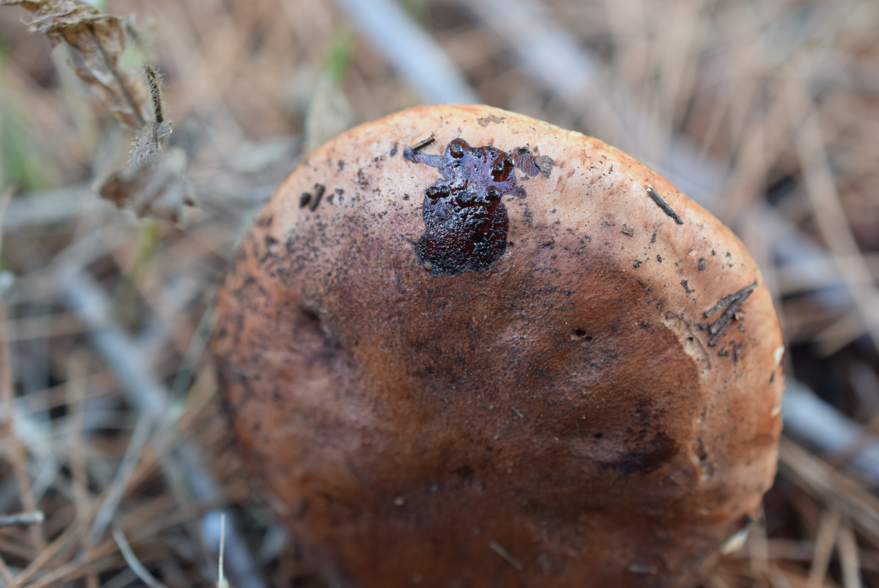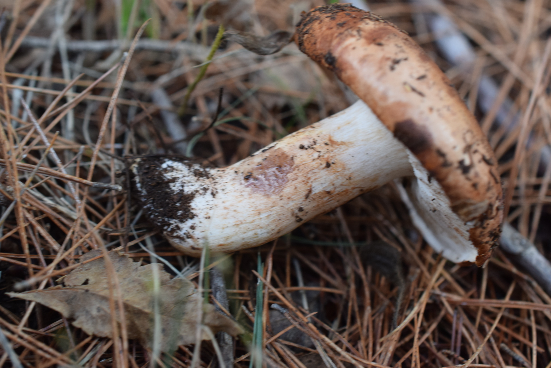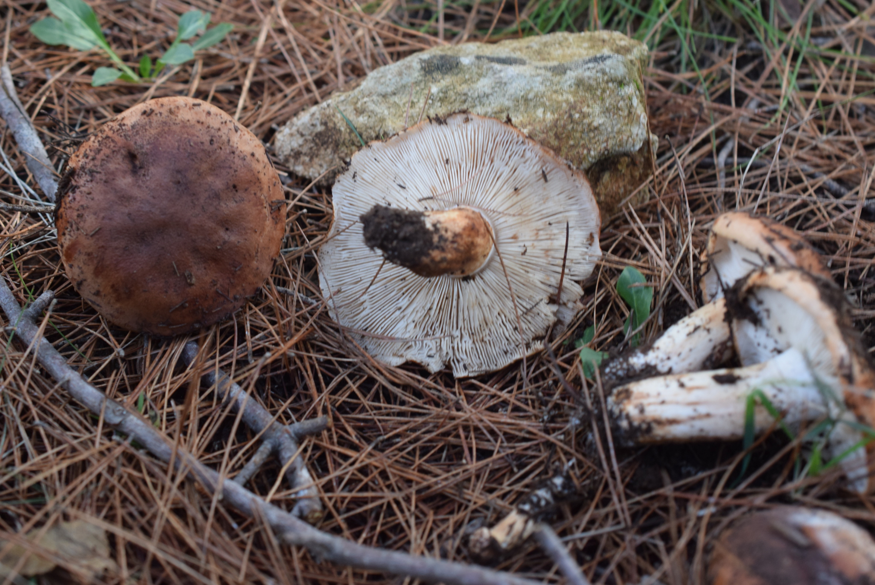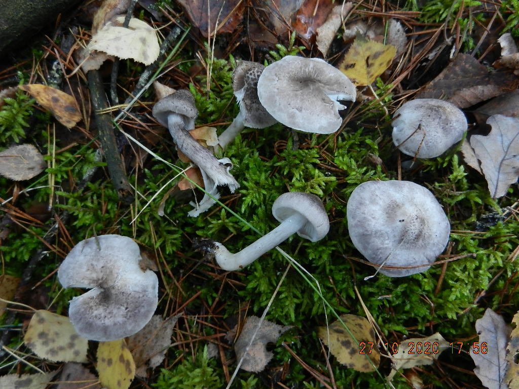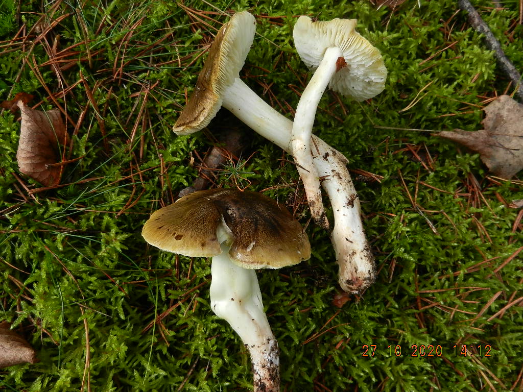 Dann die etwas größeren mit den konzentrischen Wassertropfen auf der Huthaut und dem ungerippten Hutrand unter Kiefer (Trich. pessundatum):