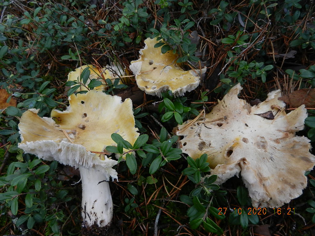Schließlich noch eine Kollektion ausgesprochen großer (Hutdurchmesser ca. 15 cm), hellgelber mit weißem Stiel, Mehlgeruch erst nach ankratzen. Zu Ingos gleich aussehenden Fund aus dem Nordosten hatte ich damals Trich. avernense gesagt, also tue ich das hier wieder: