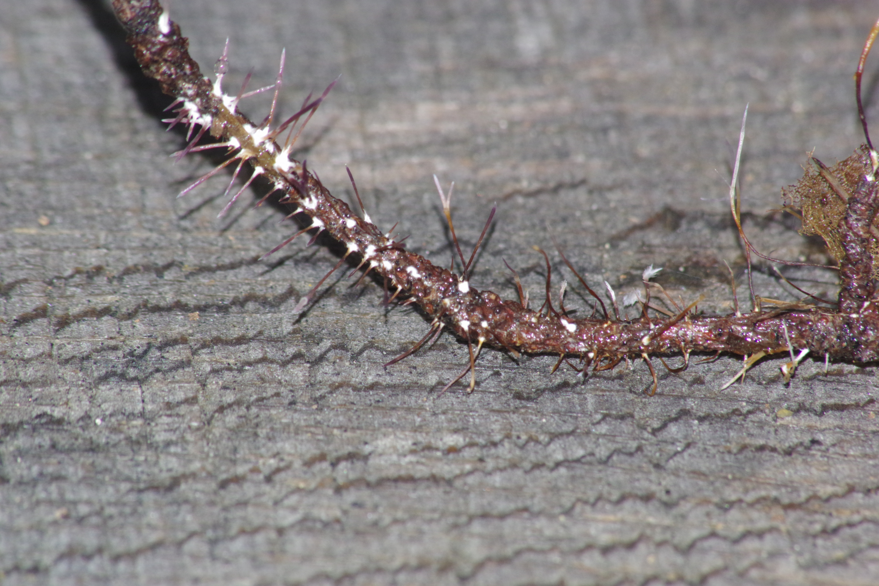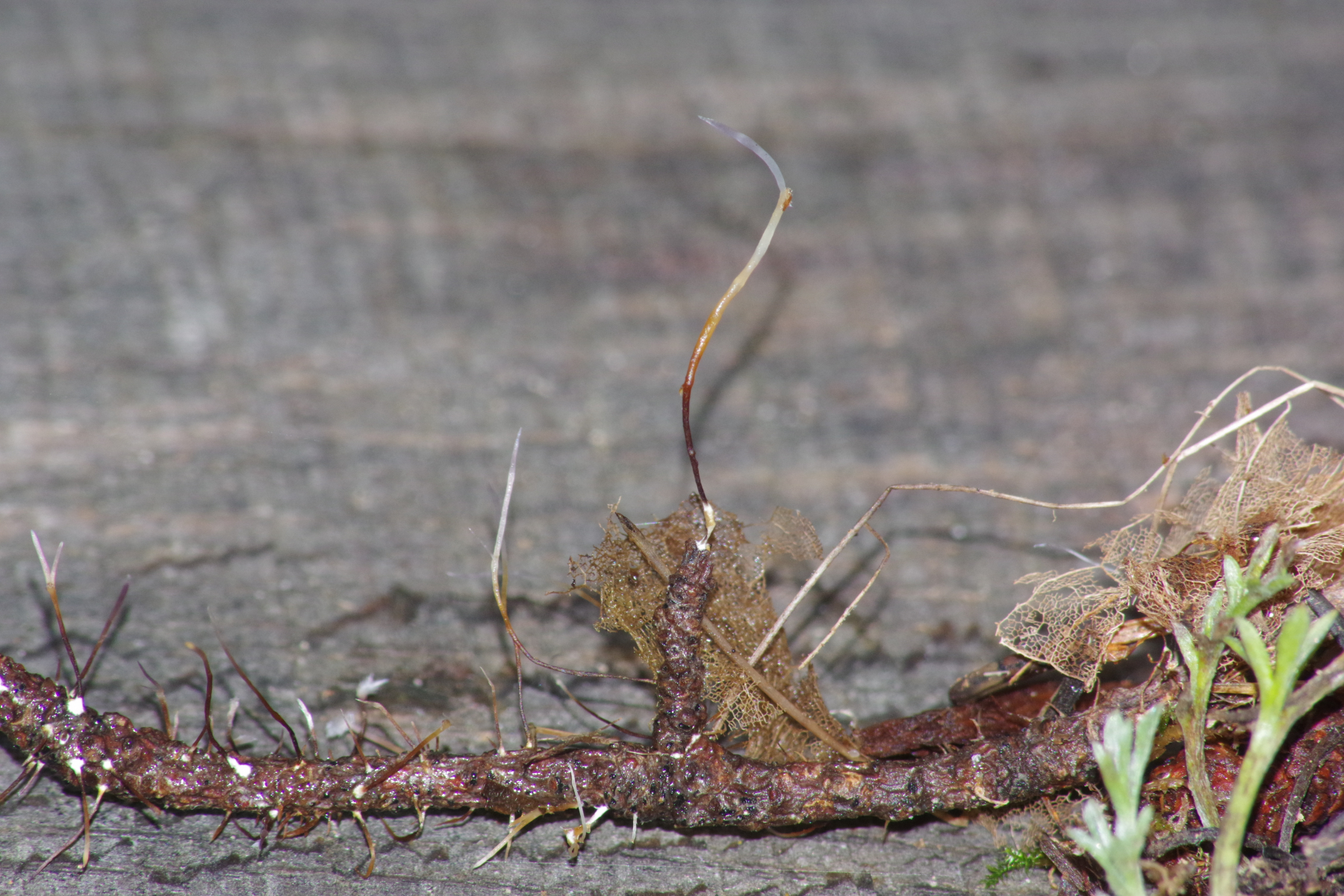 1. Dieses UPO (unbekannte pilzartige Objekt) scheint auf einem Fichtenzweig zwischen/unter Totholz und Blättern zu wachsen, bis 25 mm lang. Möglicherweise in Richtung Typhula? Mikroskopisches kann ich dazu nichts sagen. Aber schick sieht das aus.