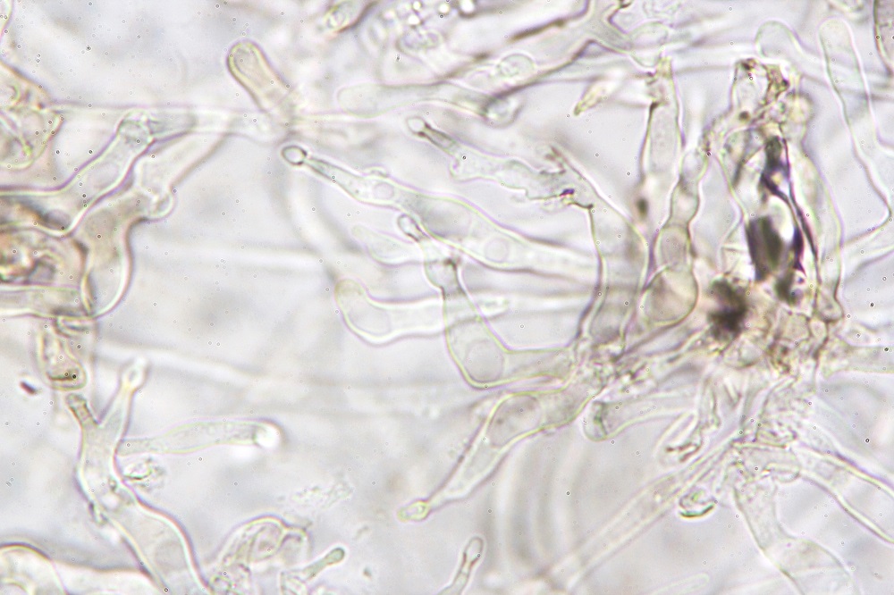 Schöne Bilder einer seltenen Art! Hohenbuehelia ja insgesamt eine sehr interessante Gattung. Typisch sind ja bei den meisten Arten die dickwandigen metuloiden Zystiden. Die kopfigen, meist als Cheilozystiden benannten Zystiden sind (nach Heinz Clémençon*) Gloeosphexen! Diese Köpfchen sind mit einer klebrigen, für Nematoden giftigen Substanz umgeben und kommen an den Lamellen, aber manchmal auch in der Huthaut sowie am Mycelium vor. Hauptsächlich bei Hohenbuehelia, Resupinatus, Pleurotus. Dieses Halo sieht man in Reagenzien meistens nicht, es wird aufgelöst. Aber manchmal ist das in Kongorot schön zu sehen. Hier im Bild bei Hohenbuehelia auriscalpium und unten bei Pleurotus erygii.