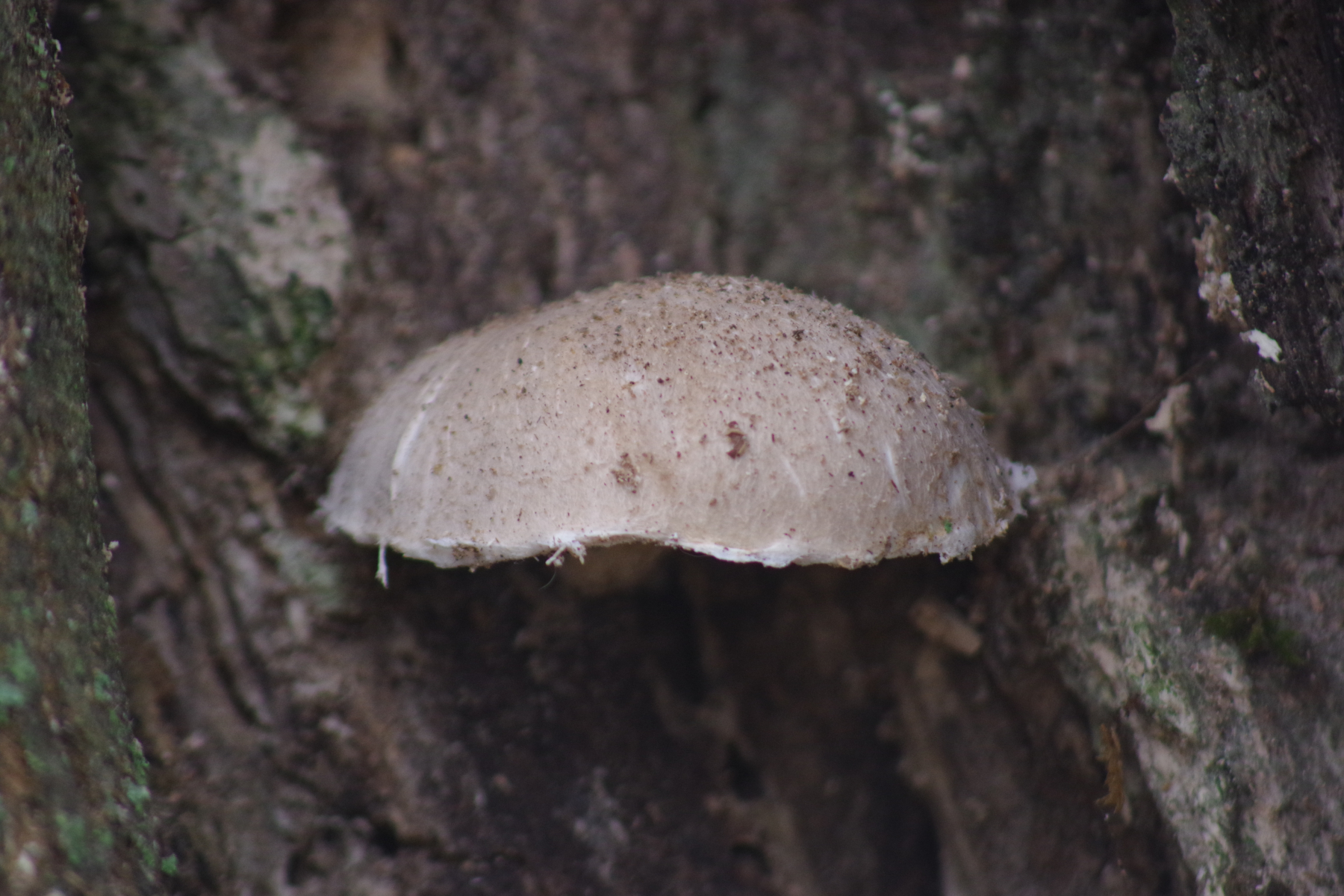 2. und noch ein anderer Baum mit mindestens 3 Arten, zunächst ein Lamellenpilz (leider ein Einzelstück), mit weit herablaufenden Lamellen und reinweißem Sporenpulver, der Stiel geht sehr weit bis ins morsche Holz, bin nicht bis zum Ende vorgedrungen. Das braune Zeug auf dem Hut und an den Lamellen ist vermodertes Holz.