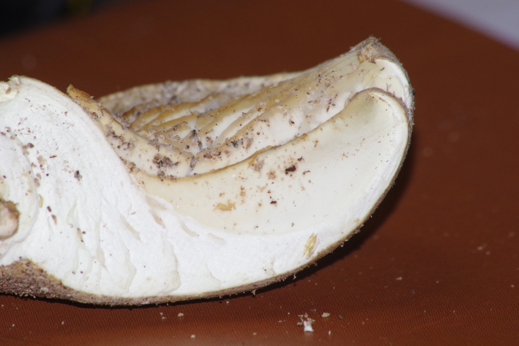 1. ein Porling, braun im Schnitt (siehe Bild), mäßig zäh, aber noch gut zu schneiden.