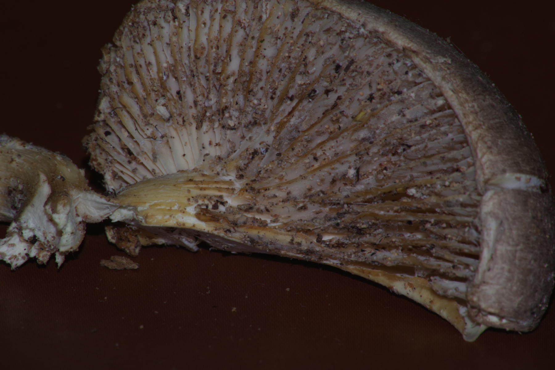 Bjerkandera adusta passt sehr gut, Bjerkander fumosa (der ist jetzt weiß überlaufen wie ein Camembert) für den anderen auch. Bei Nr. 2 täuschen die Fotos (deutlich überbelichtet) - der ist durchaus in frischer Konsistenz und die ganzen Krümel stammen vom Substrat (äußerst morsches Holz), da sind keine Tierchen dabei. Wie die Krümel beim Wachsen dahingekommen sind, insbesondere zwischen die Lamellen, erschließt sich mir nicht. Vielleicht waren Ameisen beteiligt, gesehen habe ich aber keine, ist auch eigentlich nicht mehr so deren Zeit. Der sieht nach 2 Tagen auf'm Schreibtisch immer noch so aus.