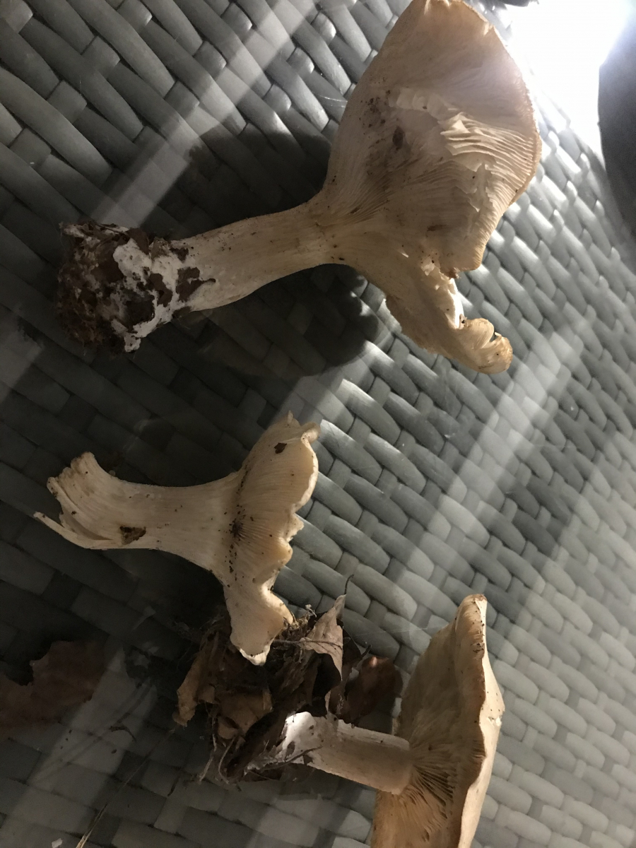 alte Nebelschlappen und einer von diesen giftigen weißen Trichterlingen. Bei den von dir angesprochenen Weichritterlingen bilden die Lamellen einen Burggraben und laufen nicht so wie hier am Stiel herab.
