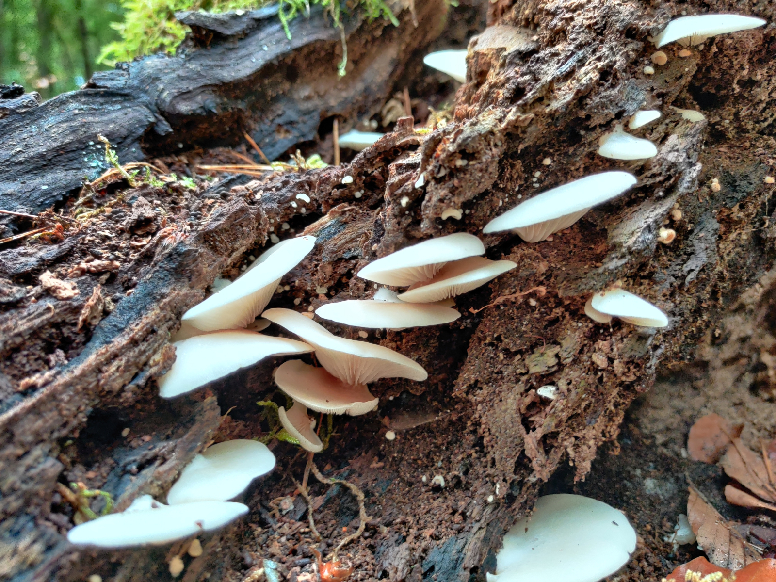 beim Durchstöbern meiner älteren Bilder bin ich auf folgende unidentifizierten Pilzchen gestoßen. Leider habe ich damals keine Detailaufnahmen gemacht oder die Fruchtkörper genauer untersucht. Ich bezweifle, dass sich die Art anhand des mageren Bildmaterials einigermaßen sicher bestimmen lässt, wär aber auf jeden Fall über eine Eingrenzung dankbar. In meinen unerfahrenen Augen könnte es der ohrförmige Seitling sein. Mich verunsichert jedoch abgesehen von meiner damaligen ungenauen Betrachtung der Fruchtkörper, dass das Hauptverbreitungsgebiet im Laux auf Berg-Nadelwälder (Schwarzwald und Alpenraum) eingegrenzt wird. Ich habe die Pilze in der Südpfalz auf ca. 100 m gefunden.
